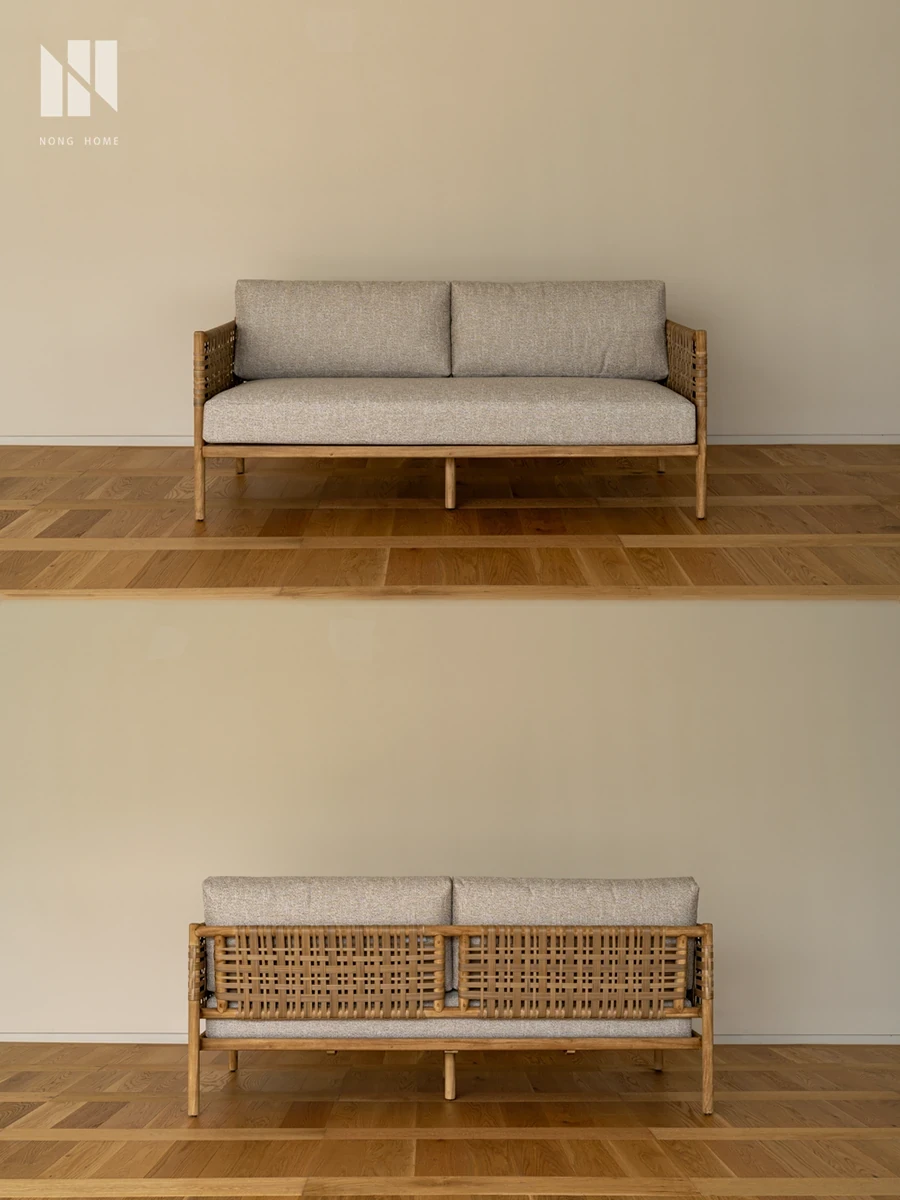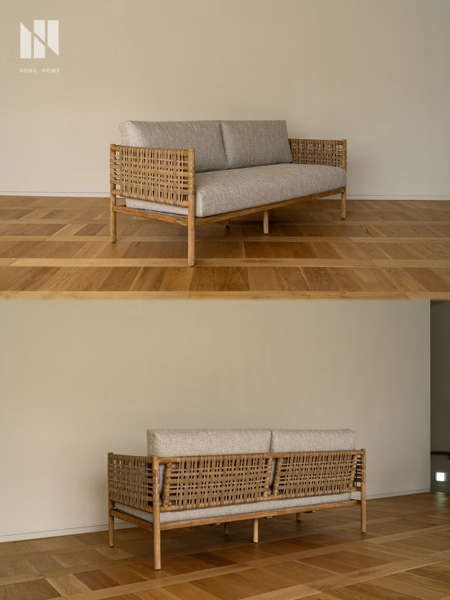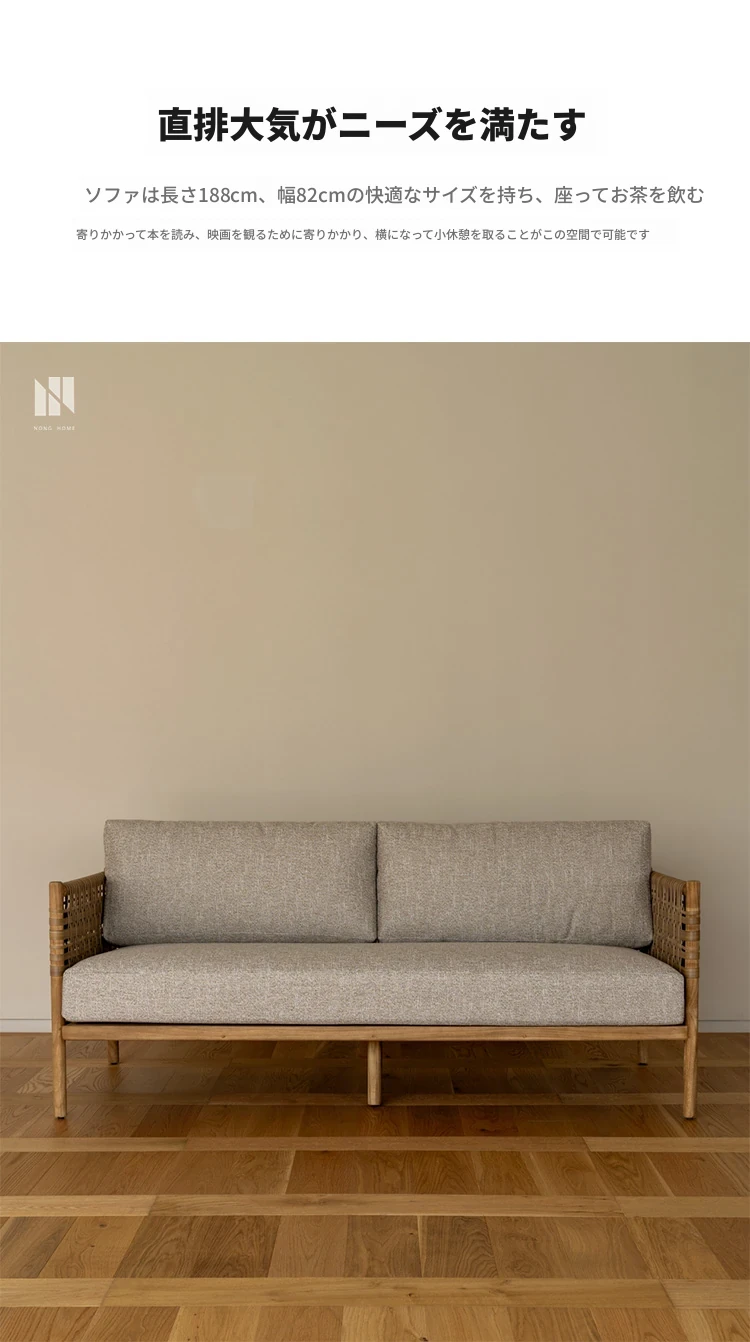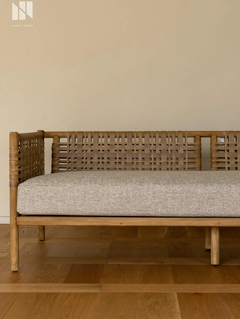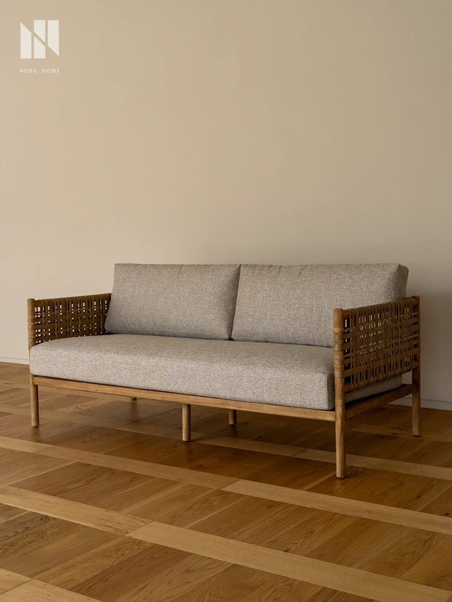南洋ビンテージ風リビング用無垢材ソファ|和モダンな侘寂スタイルの籐編み3人掛けソファ|民宿やカフェにぴったりのスタイリッシュなカウンターソファ!