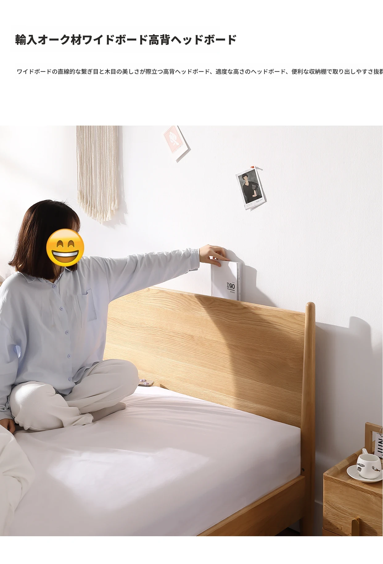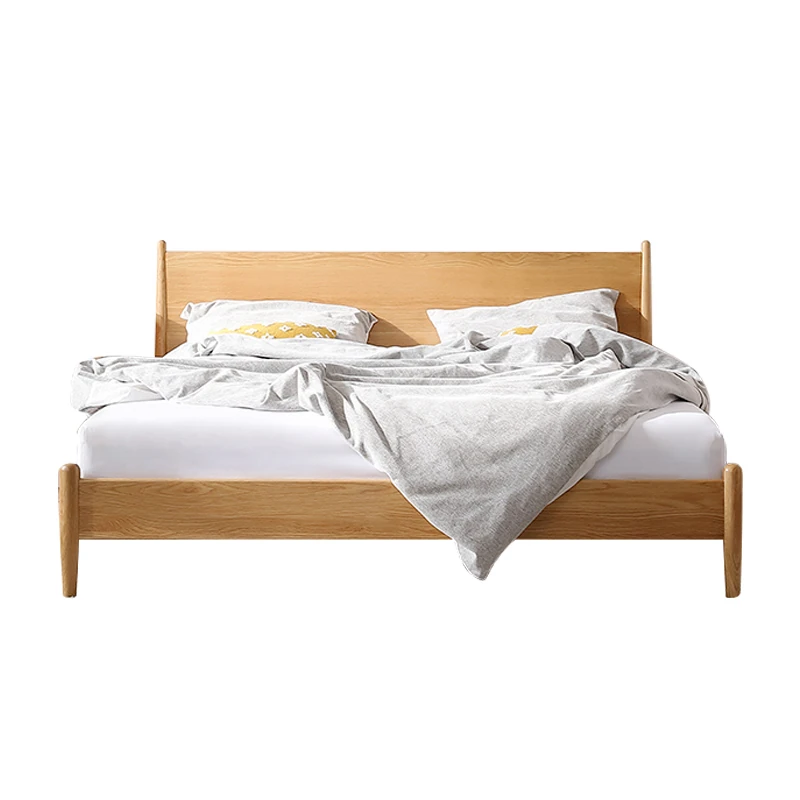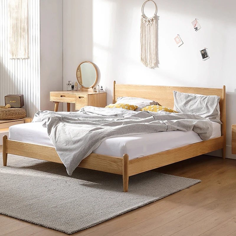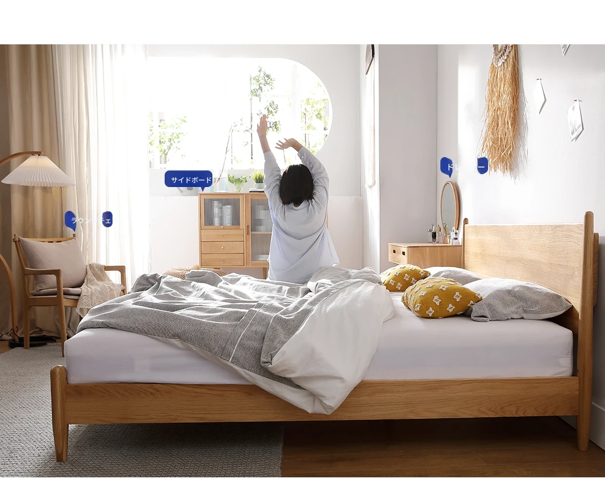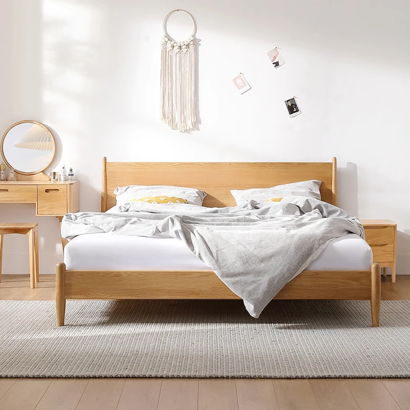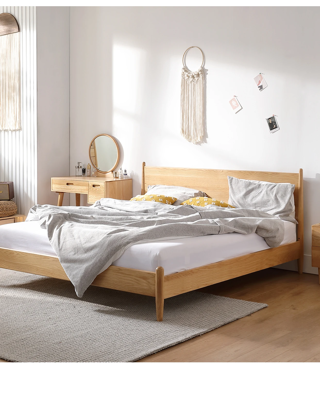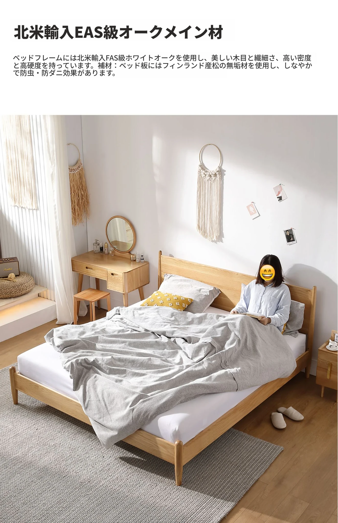 北欧ナチュラルウッドスタイルの白橡木製ベッド- 主寝室にも予備寝室にもぴったりなシンプルなデザイン!選べるサイズ:150cmまたは180cmのダブルベッド、特別な一日に最適なウエディングベッド。