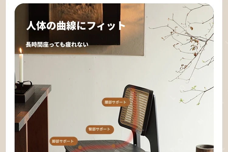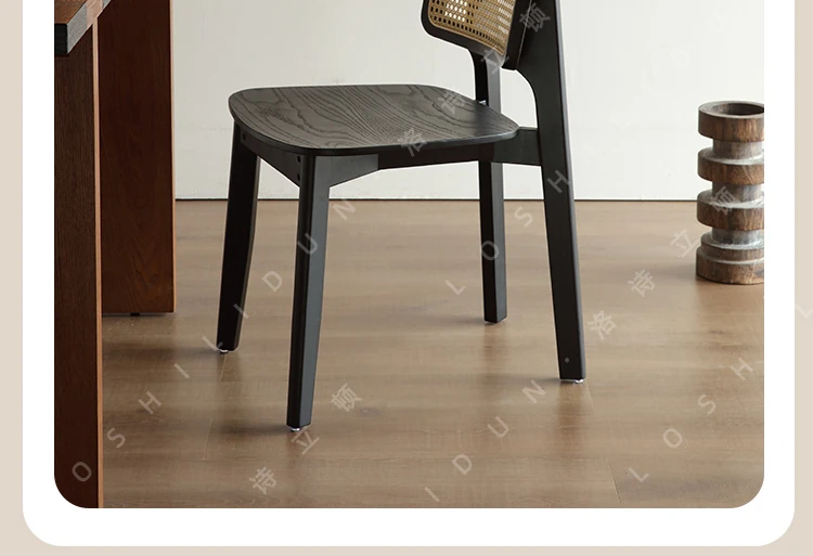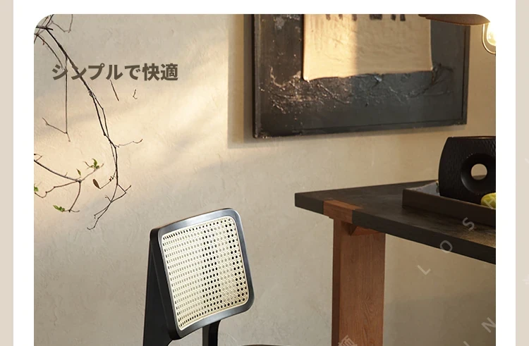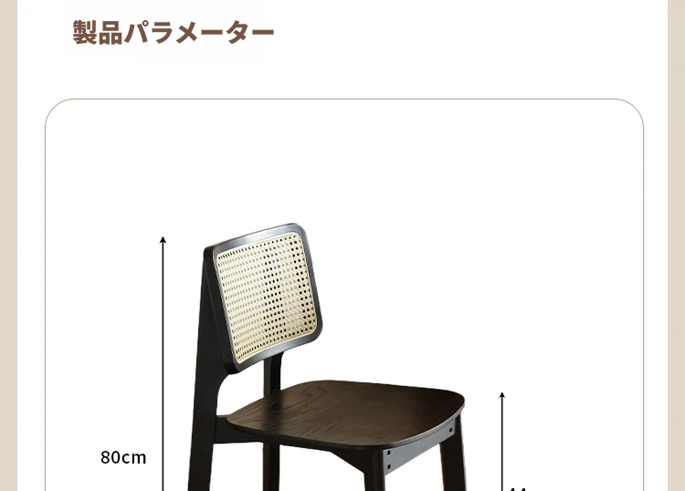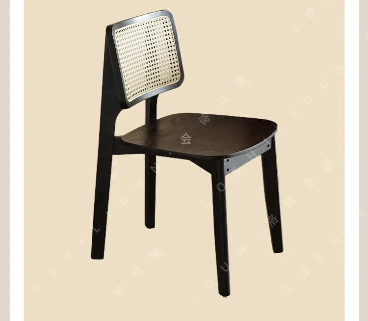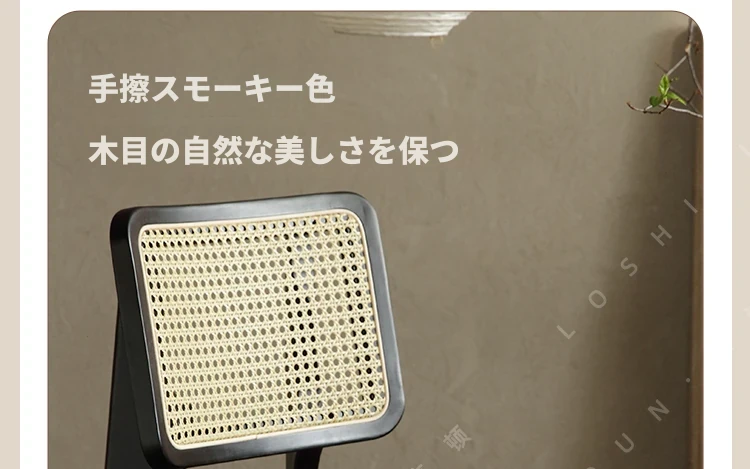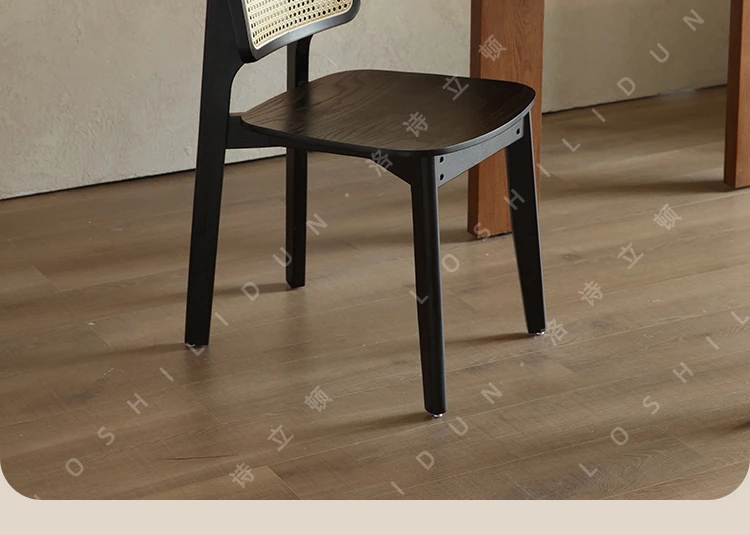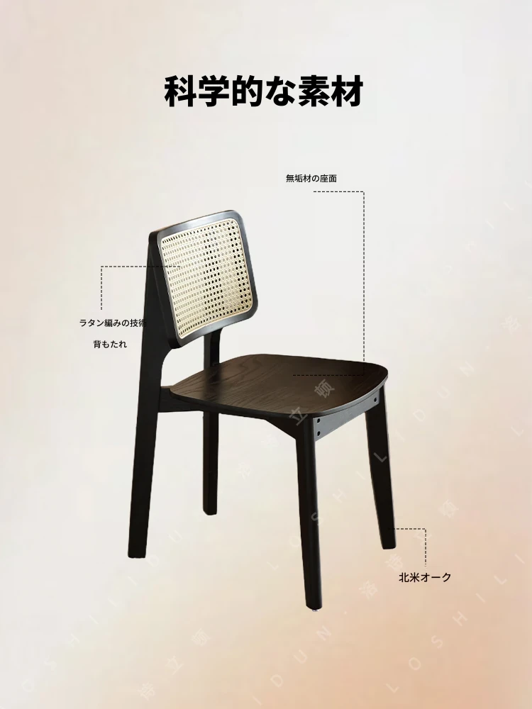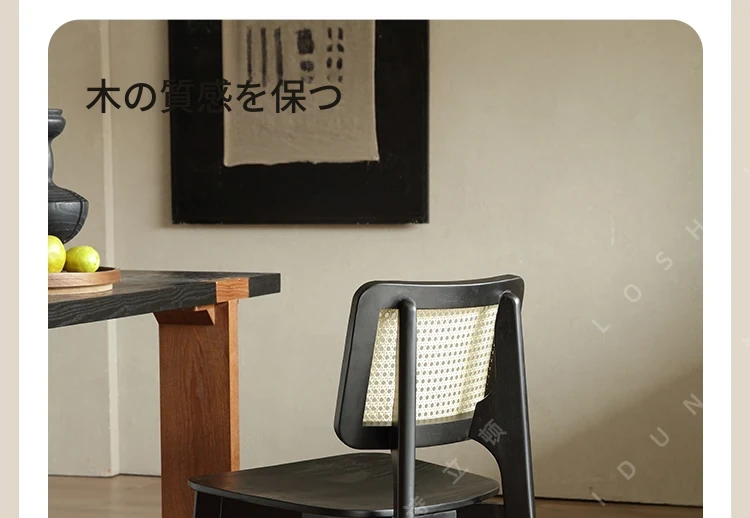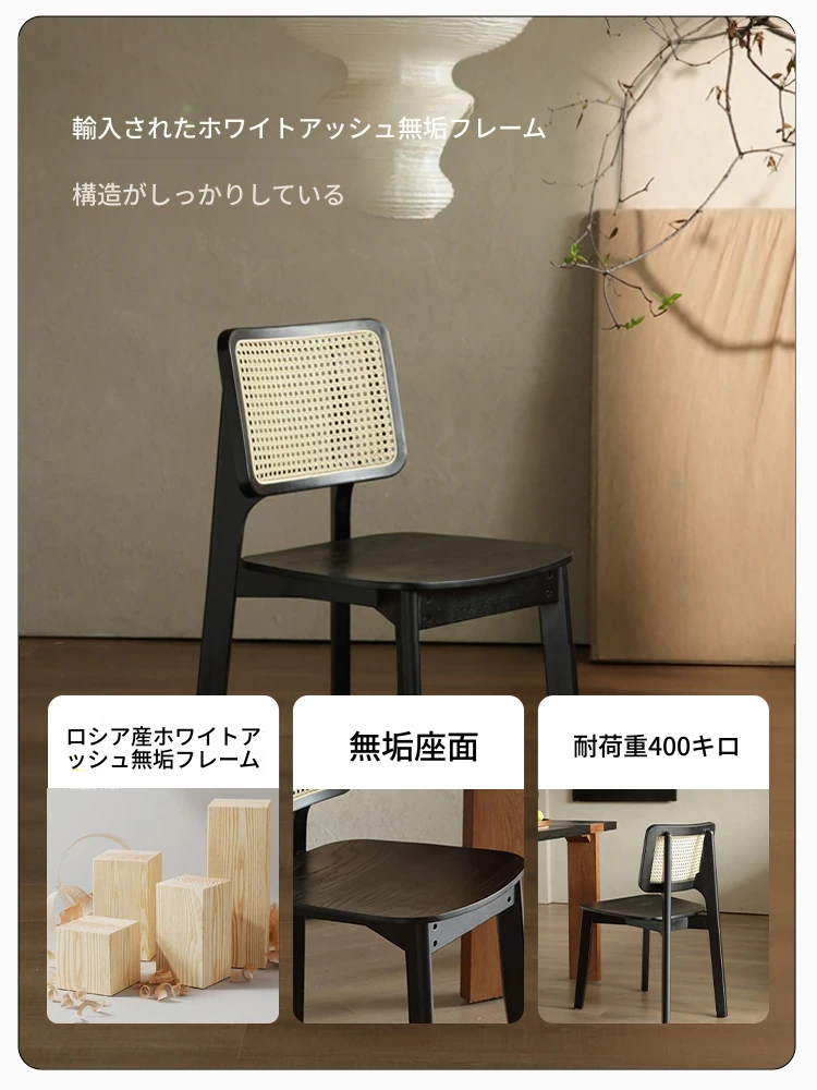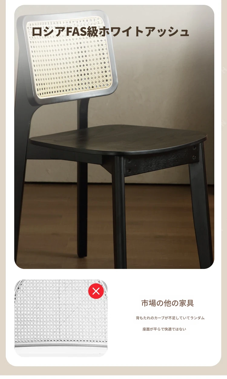 北欧スタイルの無垢材ダイニングチェア|日本風デザイン|ブラックバックレスト|手作りのラタン編み|長時間座っても快適な座り心地!