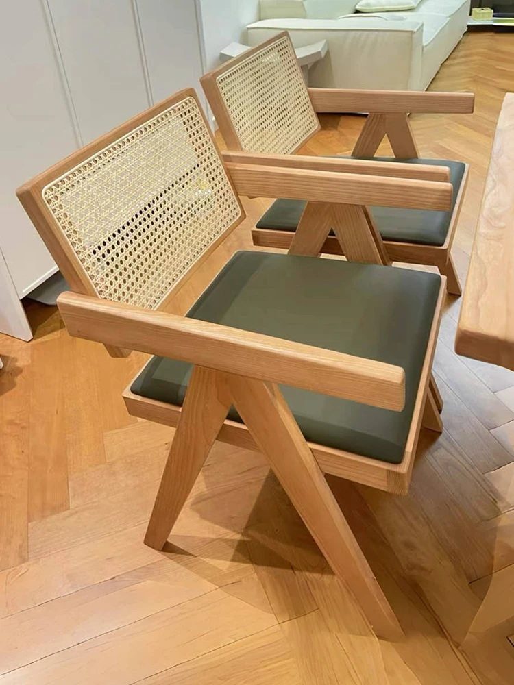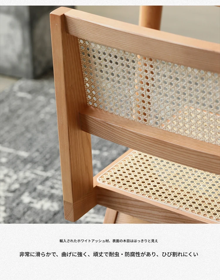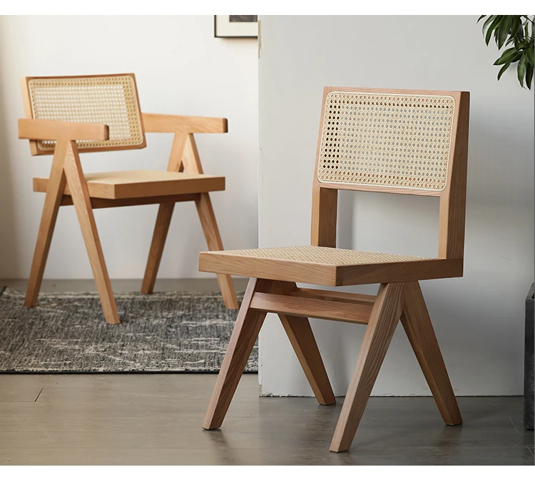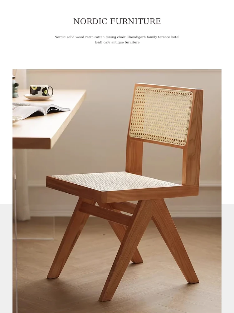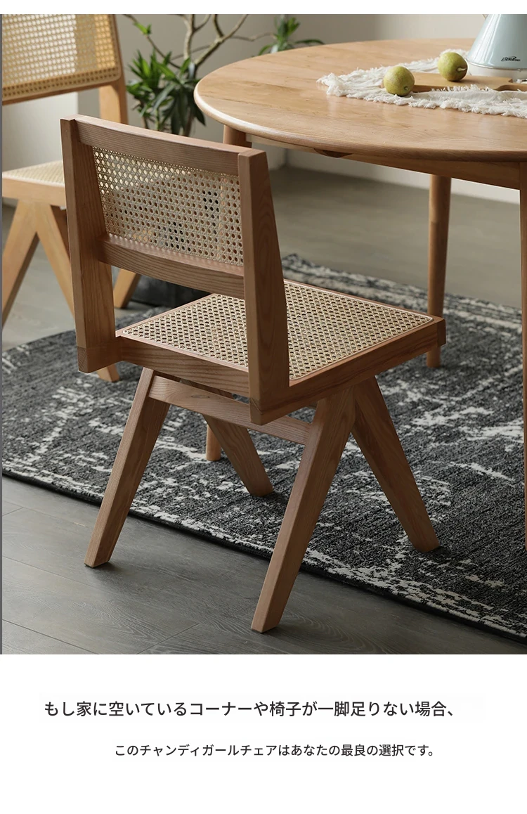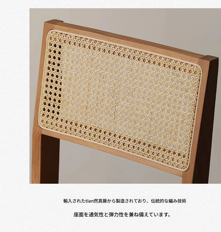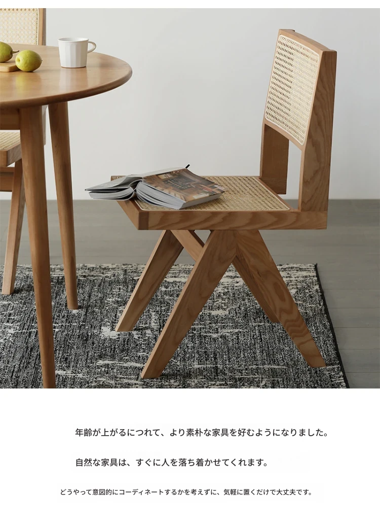 北欧風の無垢材と籐編みのチャンディガールスタイル、侘び寂びを感じるカフェや民宿にぴったりな中古感溢れるリラックス用ダイニングチェアKチェア。あなたの空間に特別な魅力を添えます!