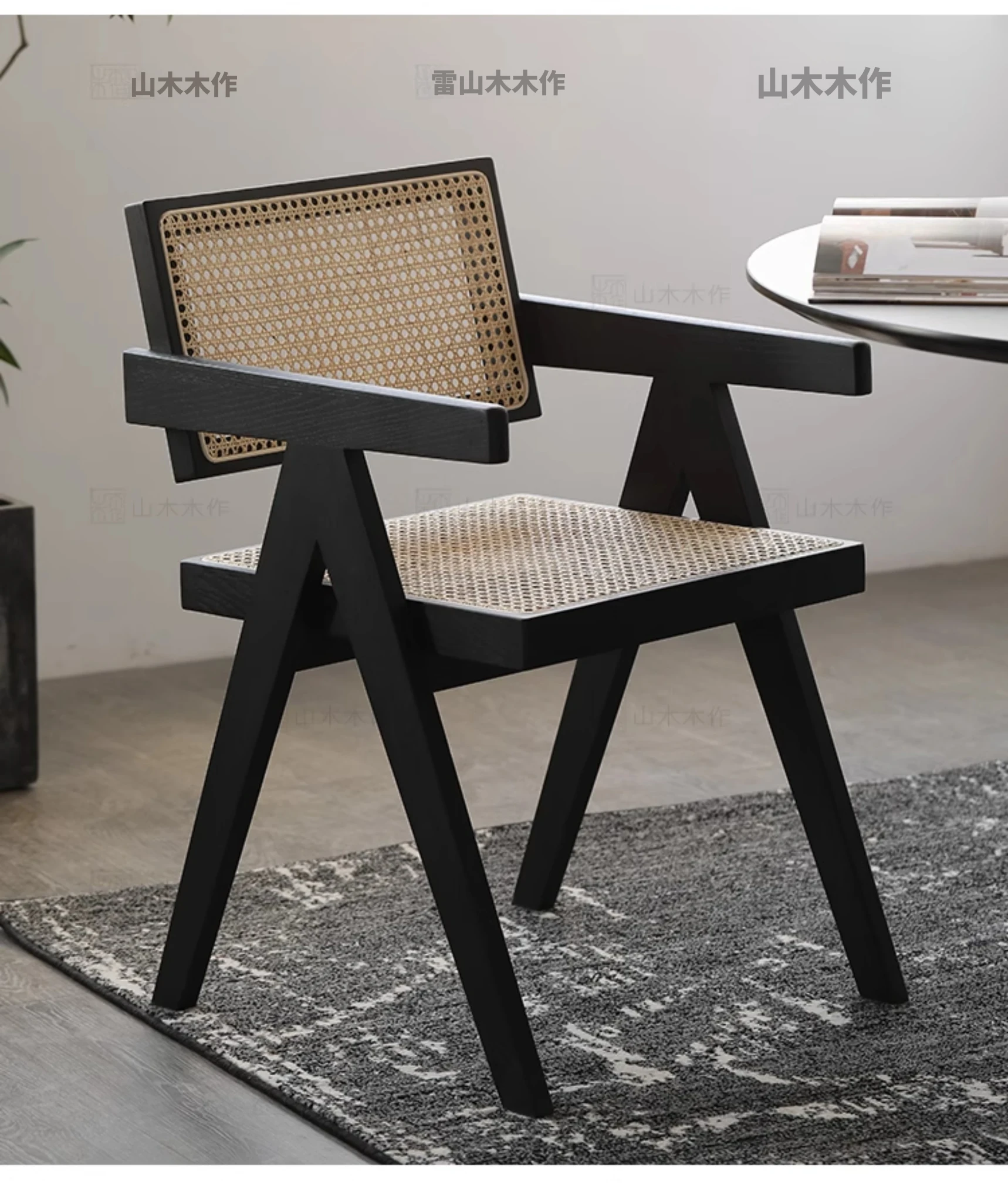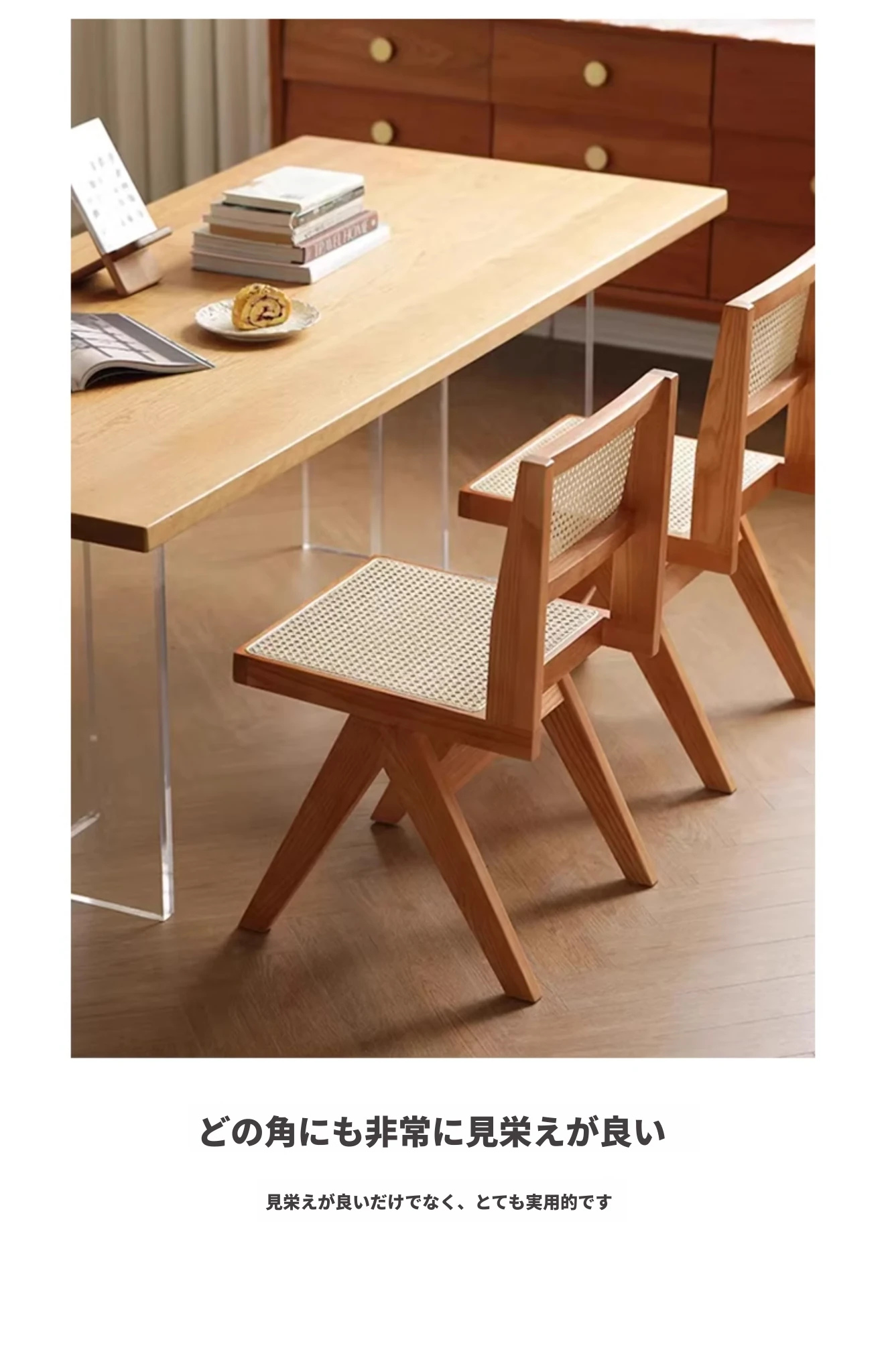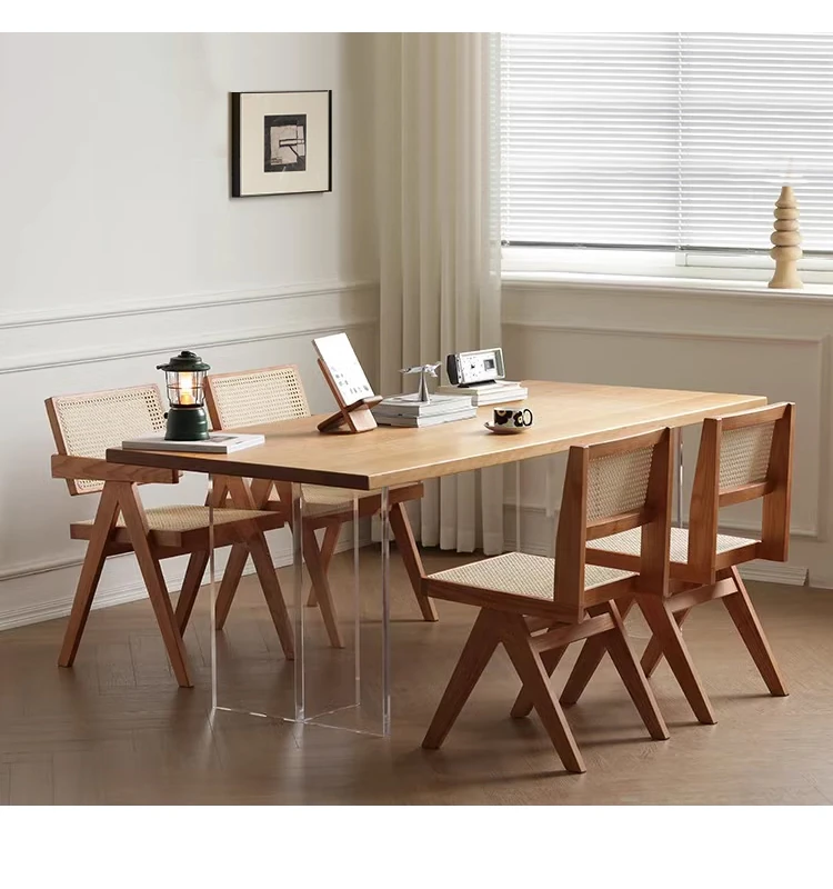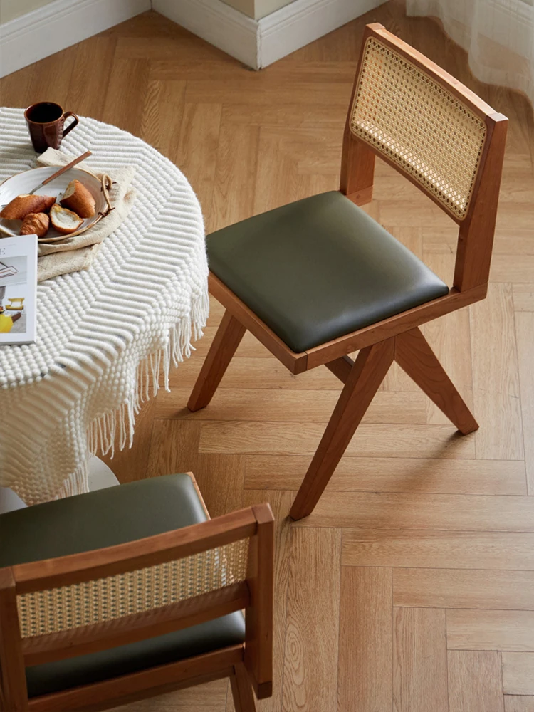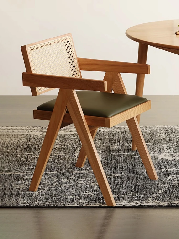 北欧風の無垢材と籐編みのチャンディガールスタイル、侘び寂びを感じるカフェや民宿にぴったりな中古感溢れるリラックス用ダイニングチェアKチェア。あなたの空間に特別な魅力を添えます!