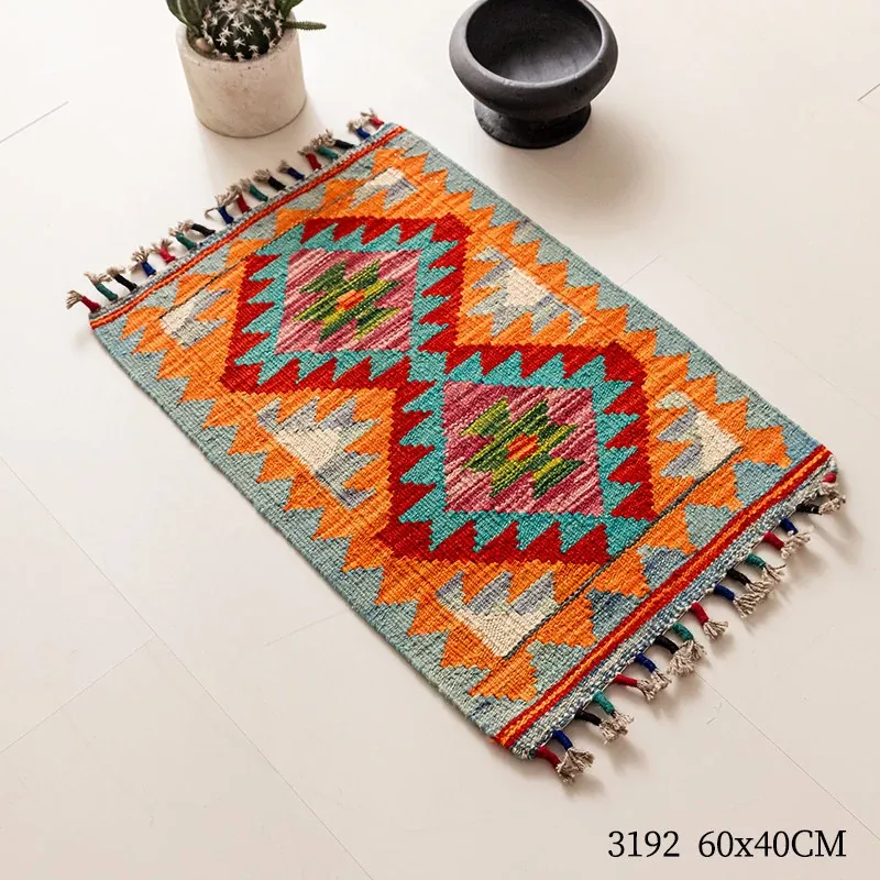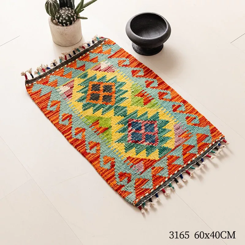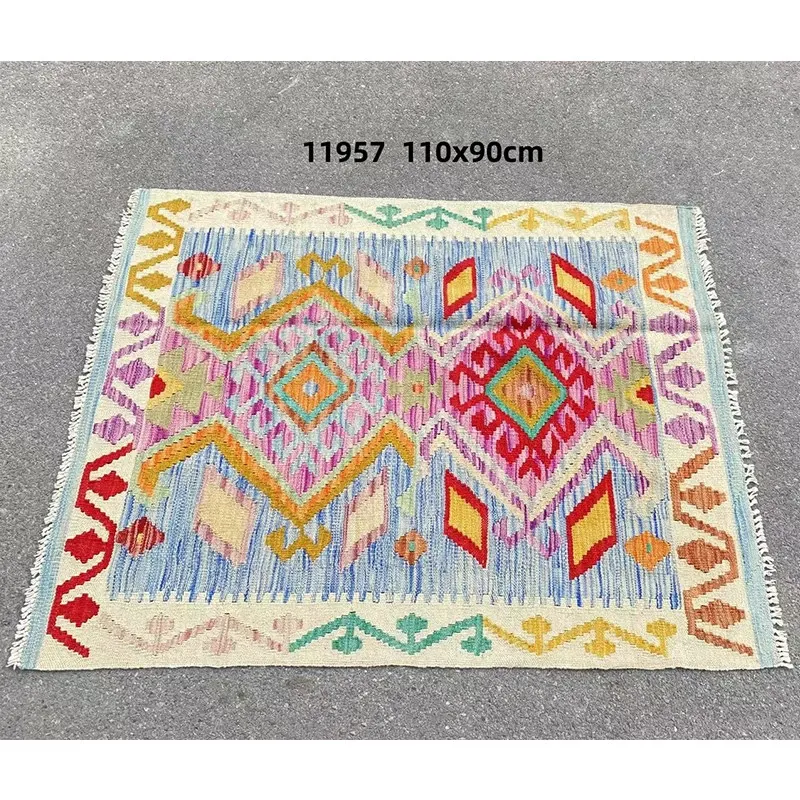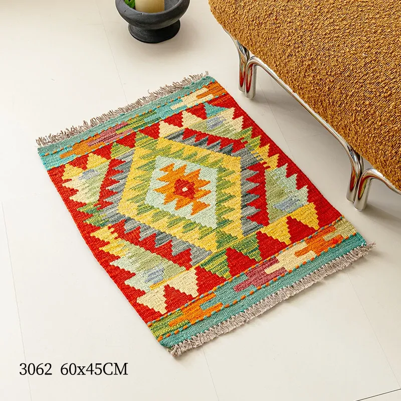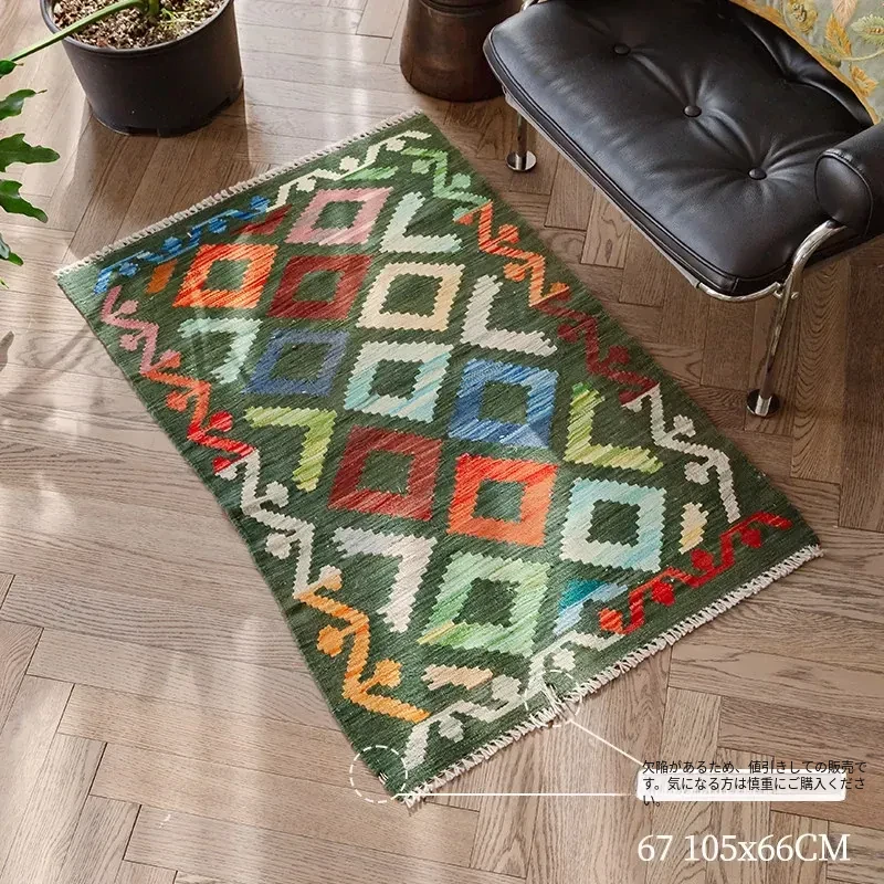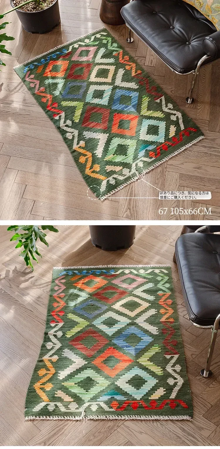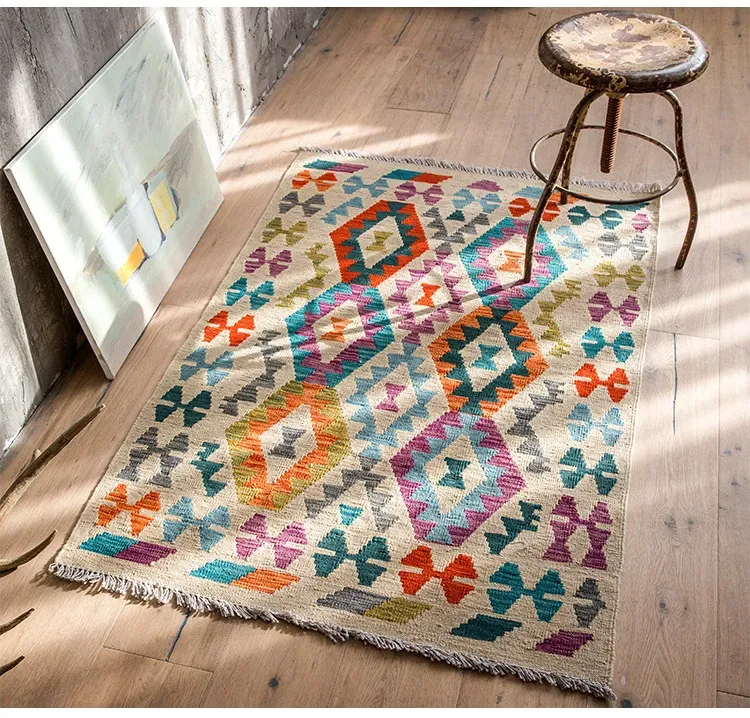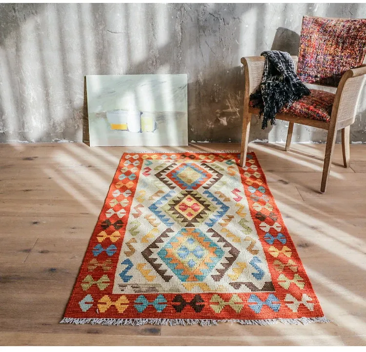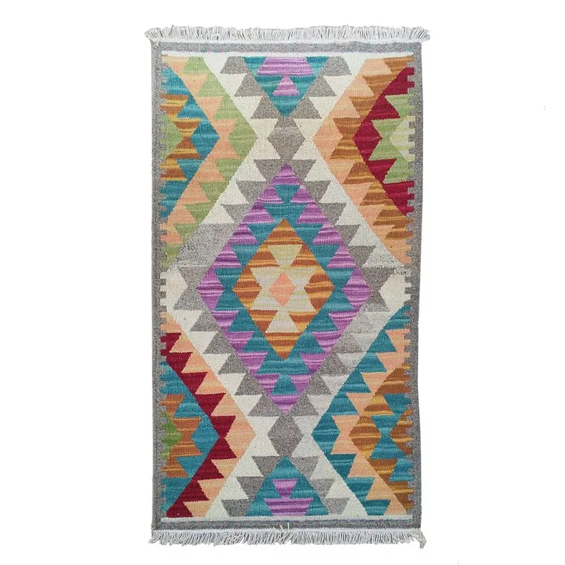 パキスタン直輸入!キリム風民族デザインのレトロ幾何学模様 北欧モダンリビング用ソファラグ/マット/タペストリー。インテリアに華やかさをプラスする一品です。