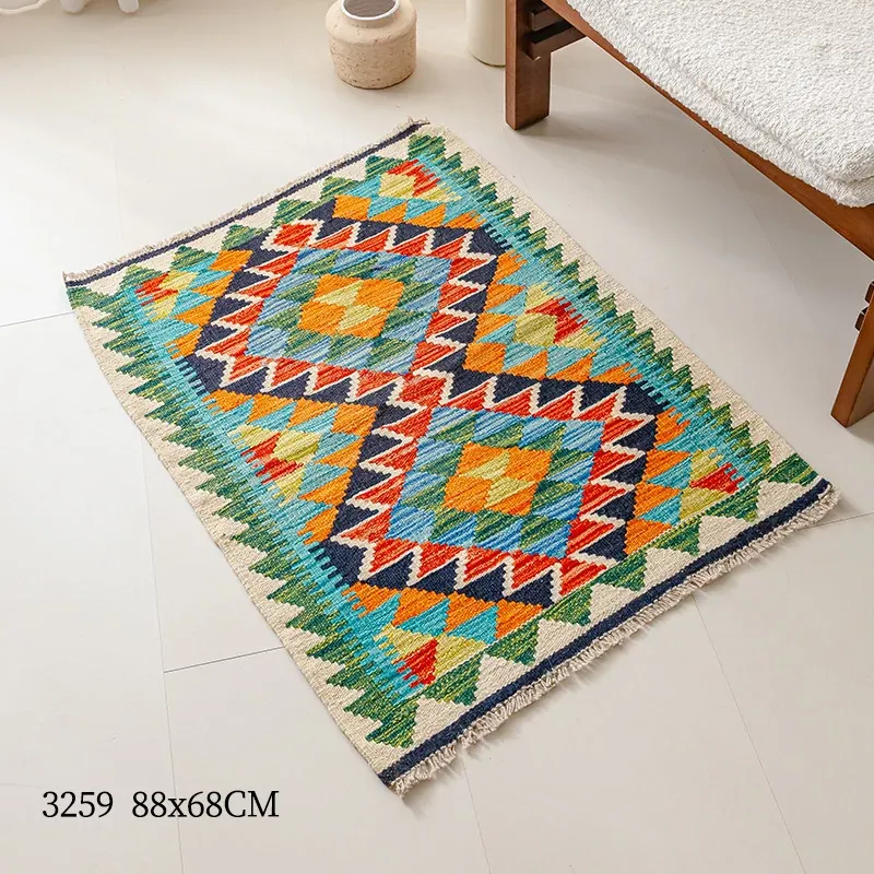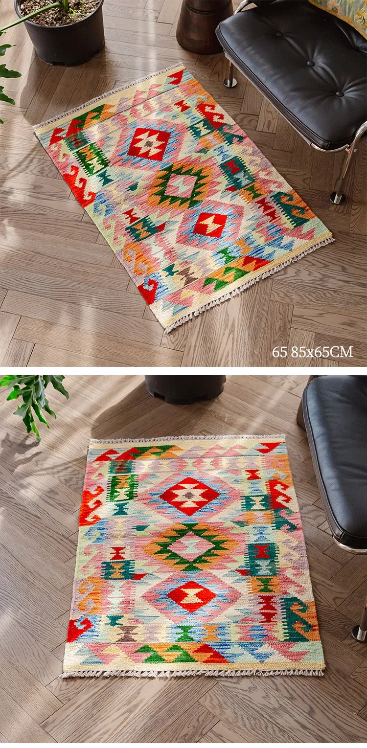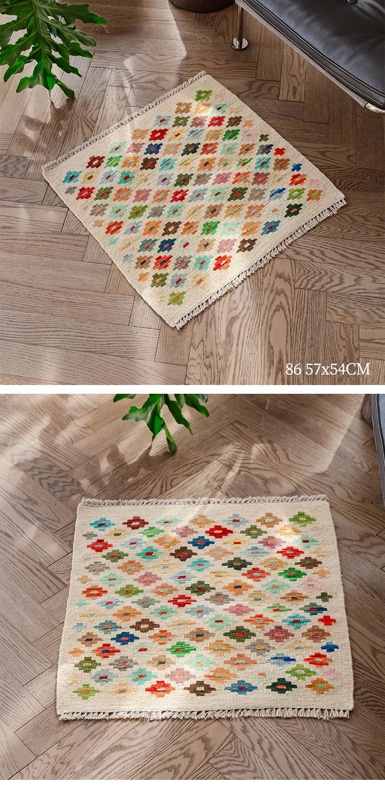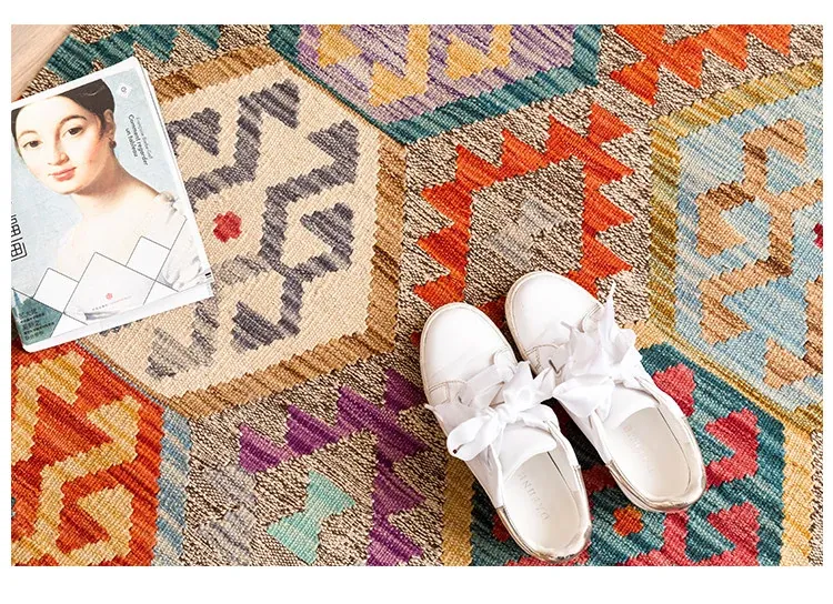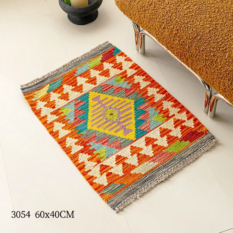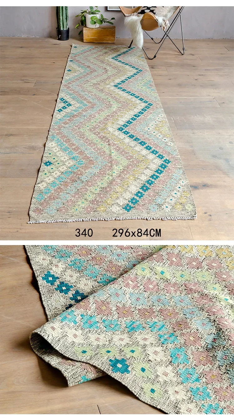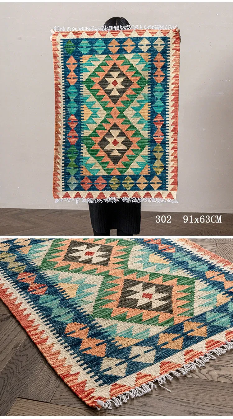 パキスタン直輸入!キリム風民族デザインのレトロ幾何学模様 北欧モダンリビング用ソファラグ/マット/タペストリー。インテリアに華やかさをプラスする一品です。