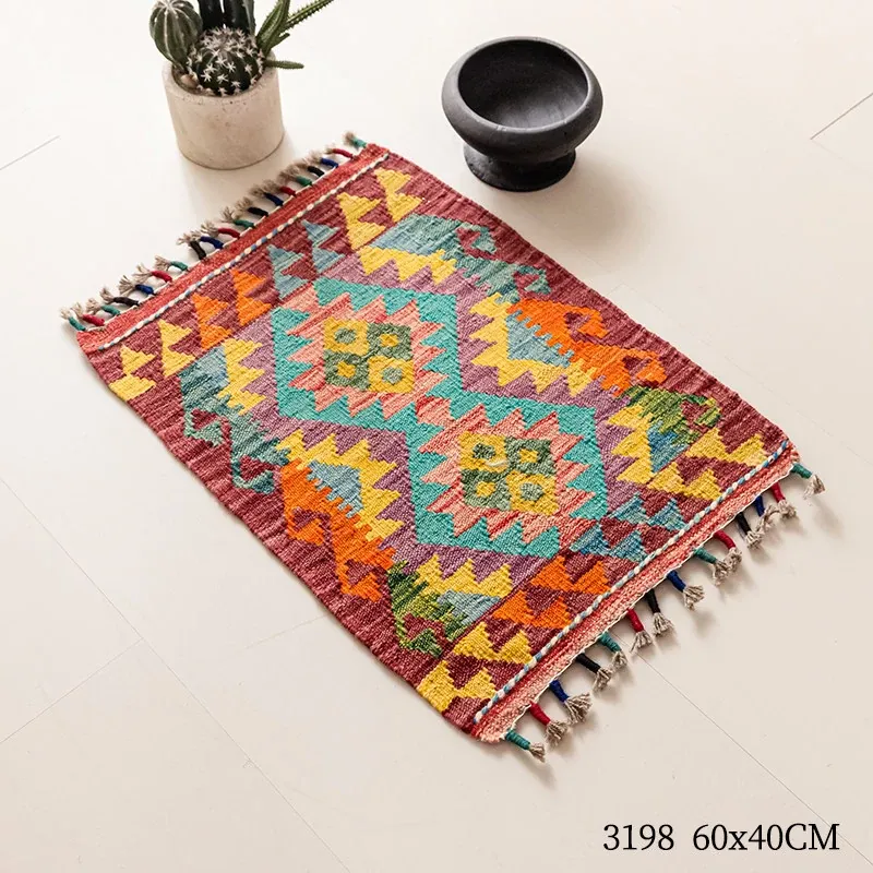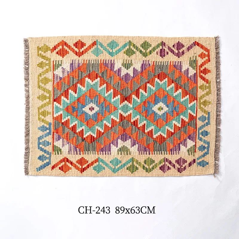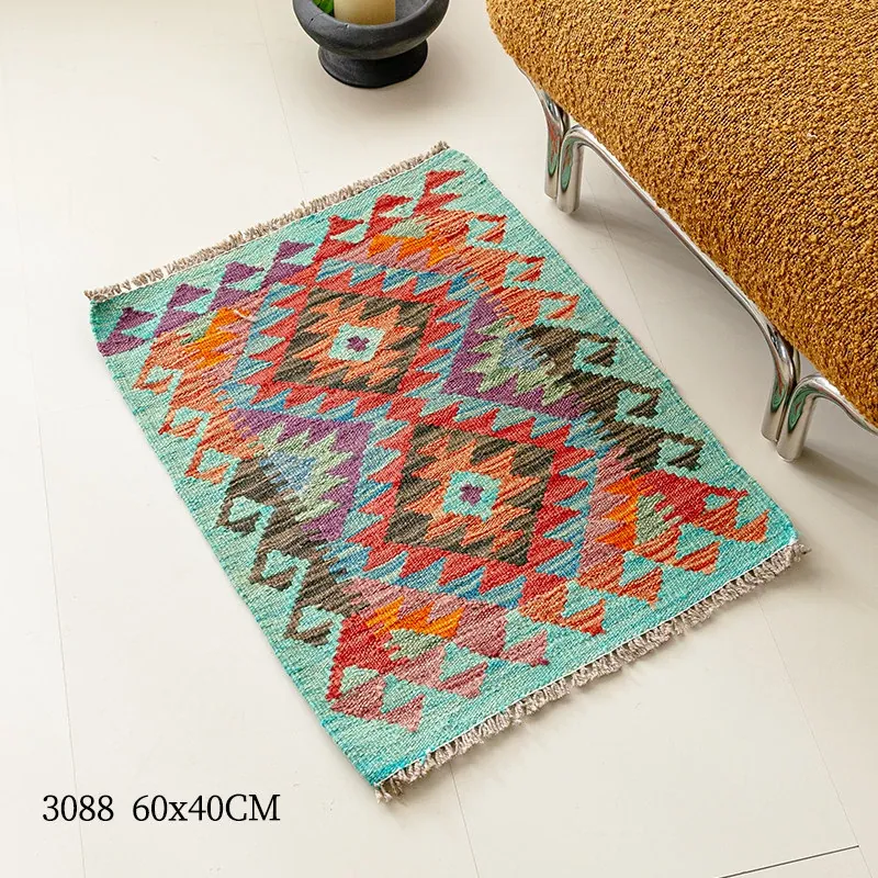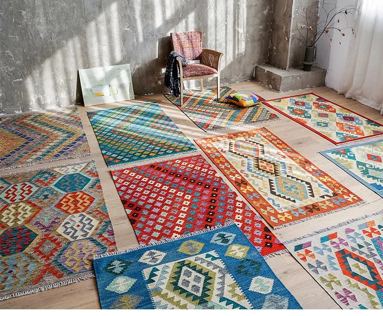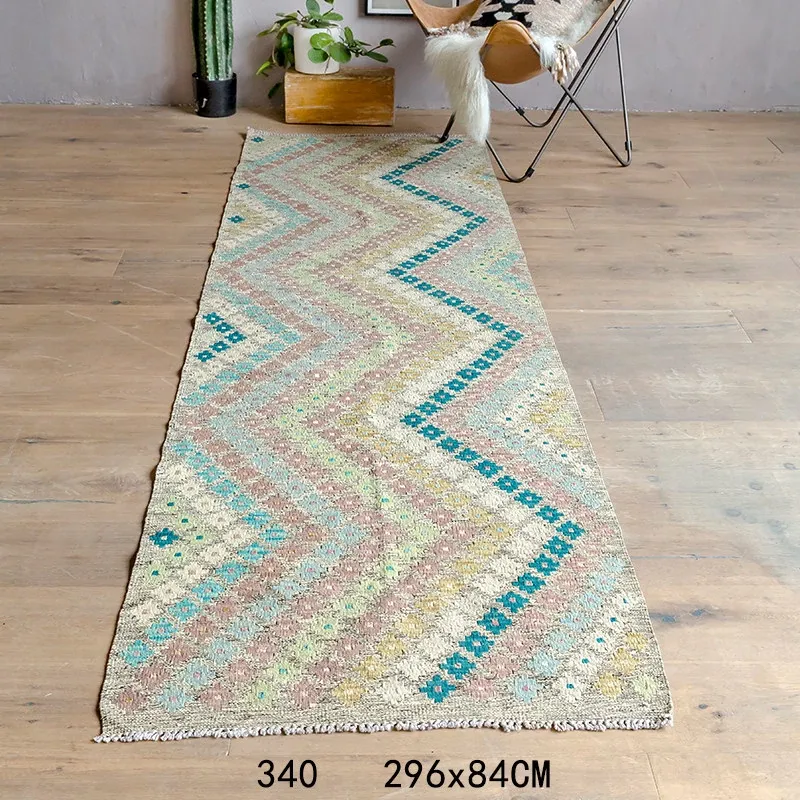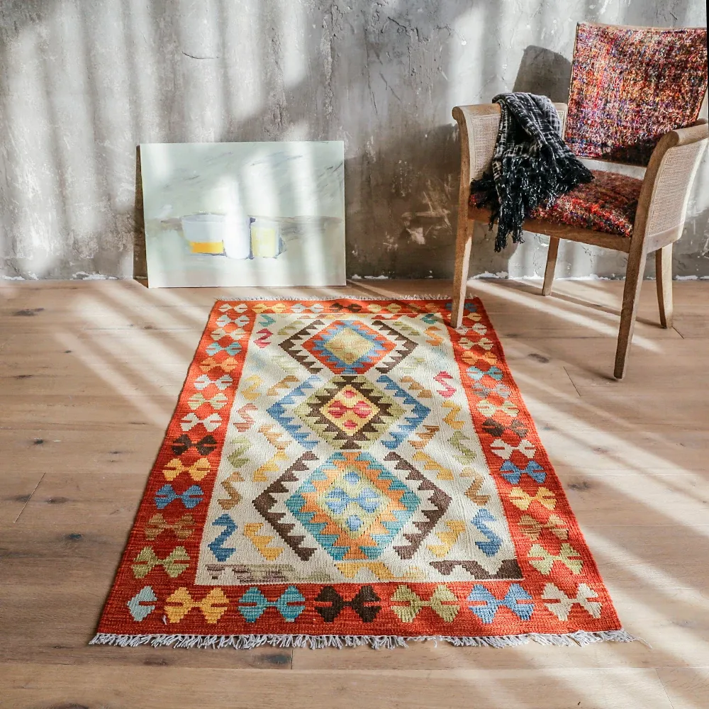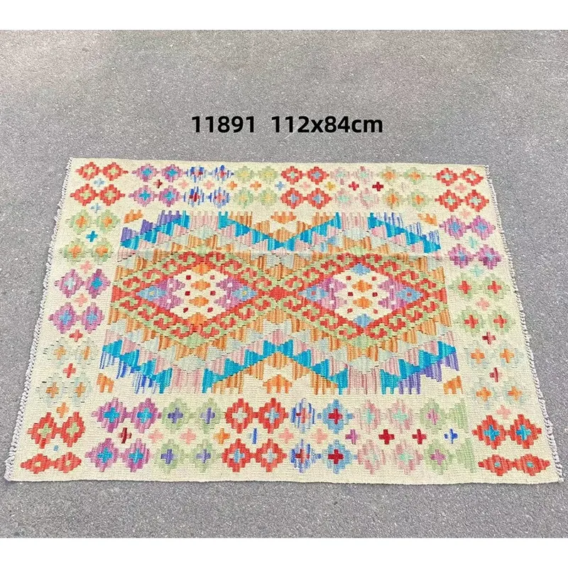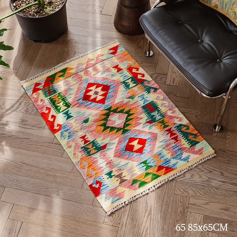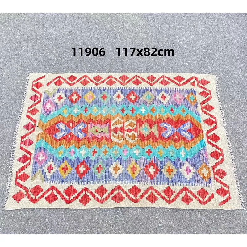 パキスタン直輸入!キリム風民族デザインのレトロ幾何学模様 北欧モダンリビング用ソファラグ/マット/タペストリー。インテリアに華やかさをプラスする一品です。