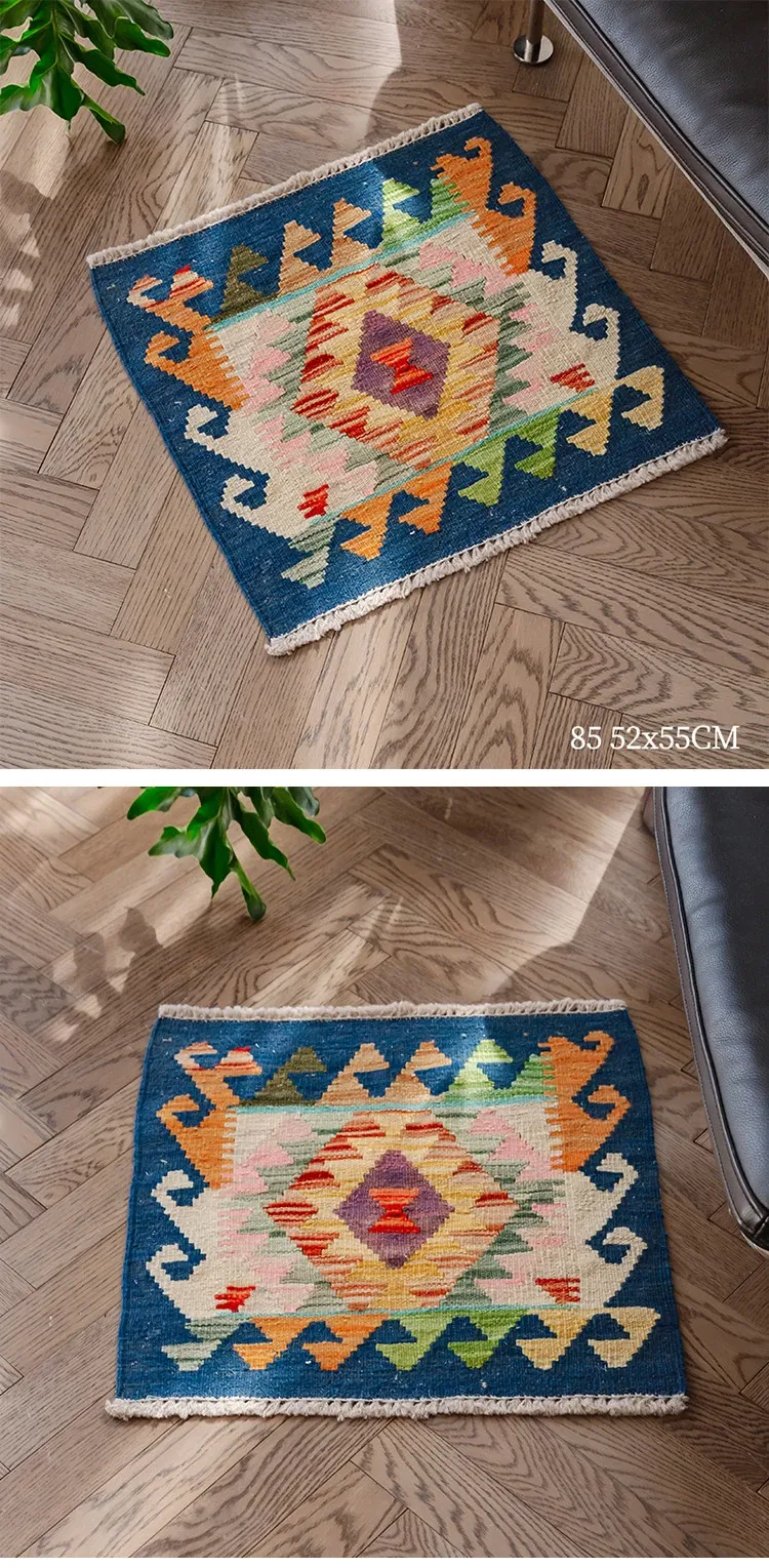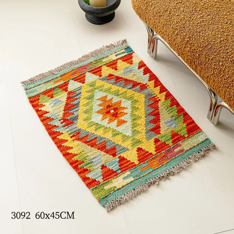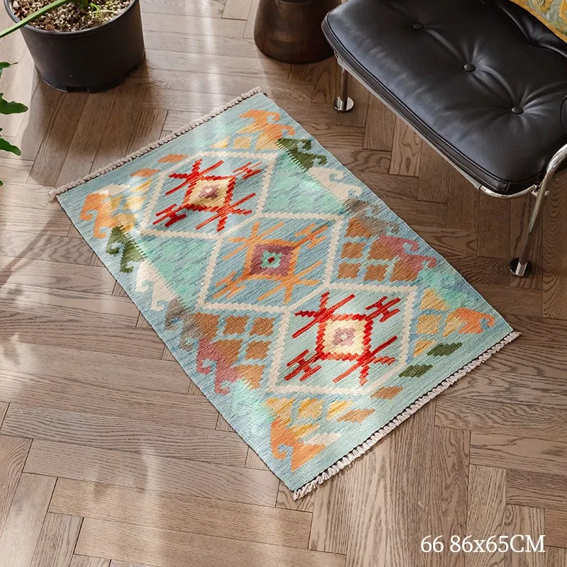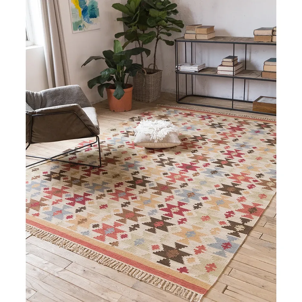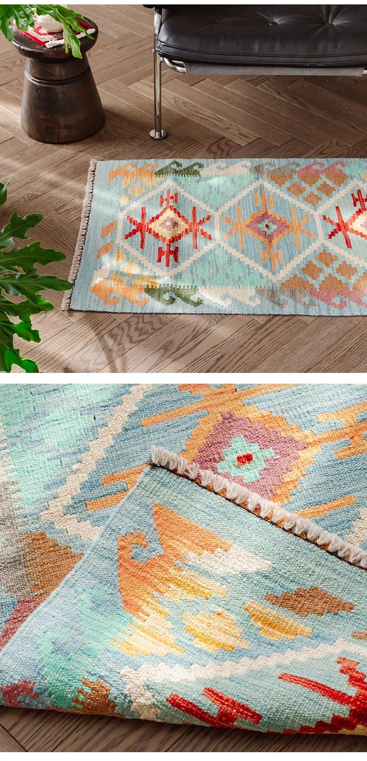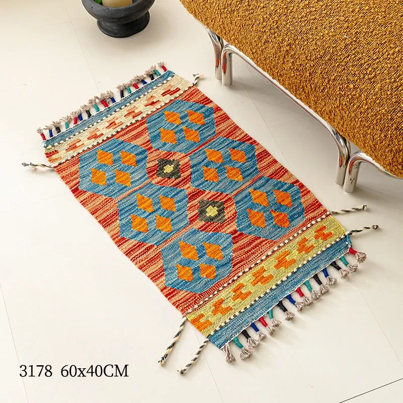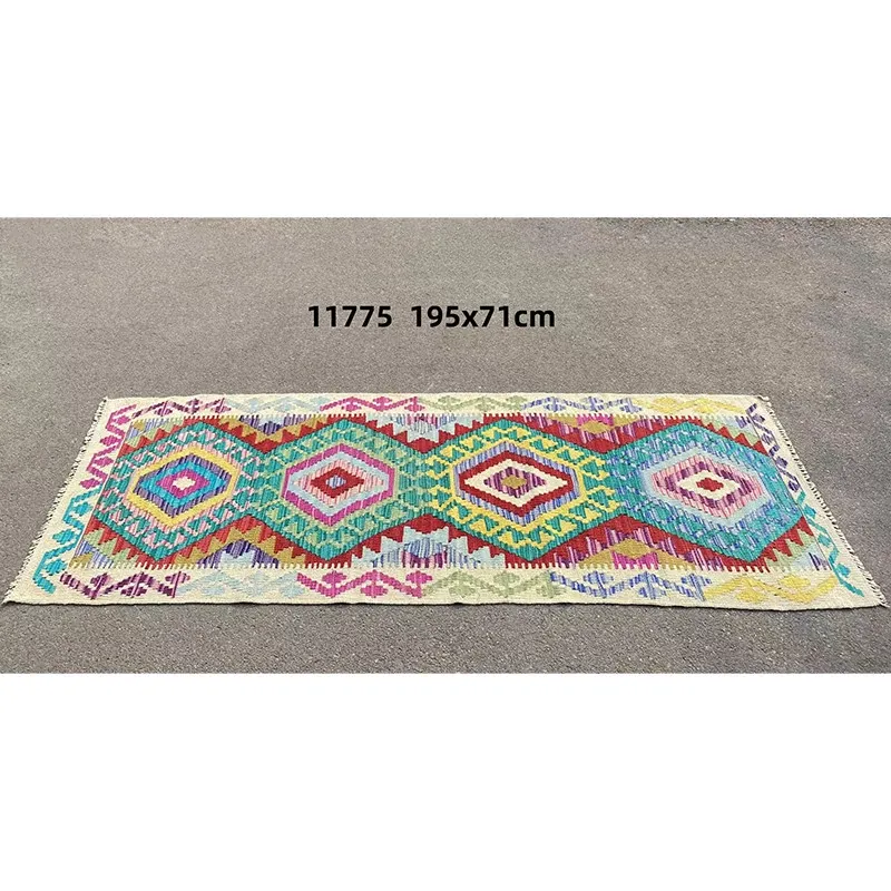 パキスタン直輸入!キリム風民族デザインのレトロ幾何学模様 北欧モダンリビング用ソファラグ/マット/タペストリー。インテリアに華やかさをプラスする一品です。