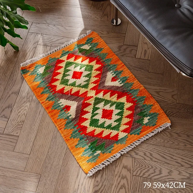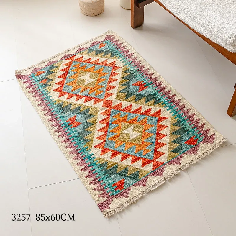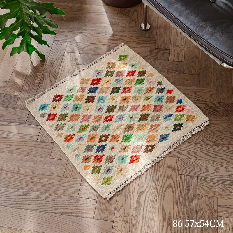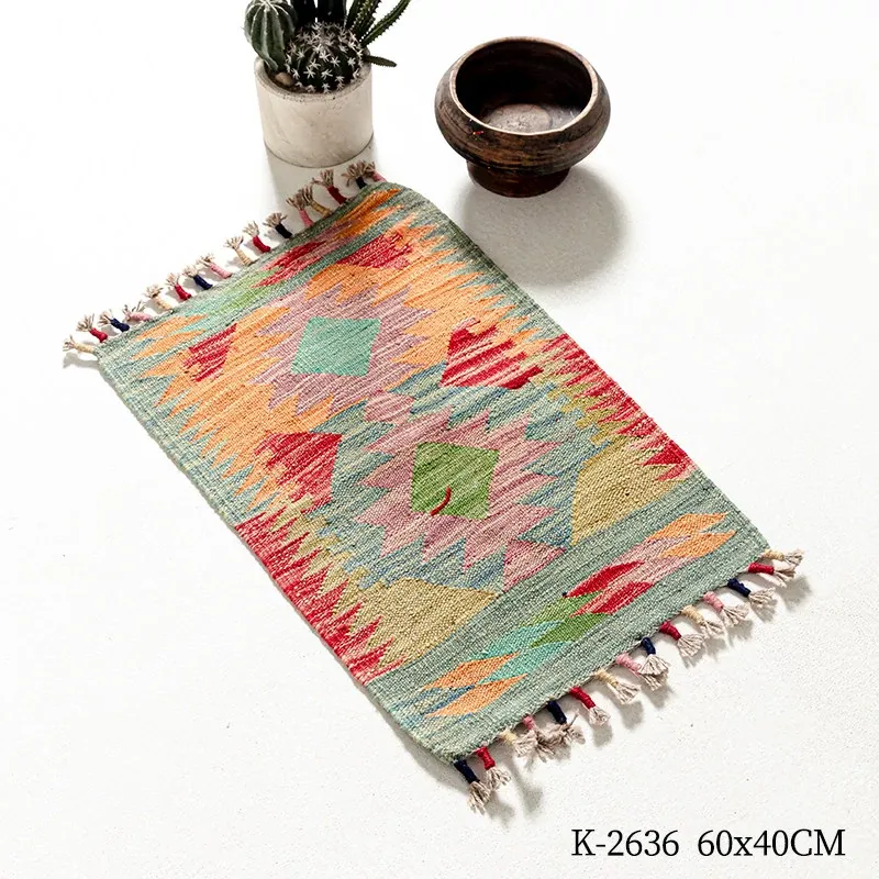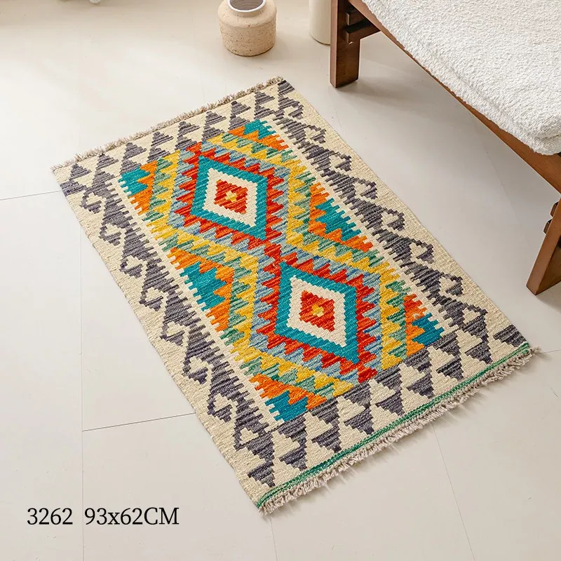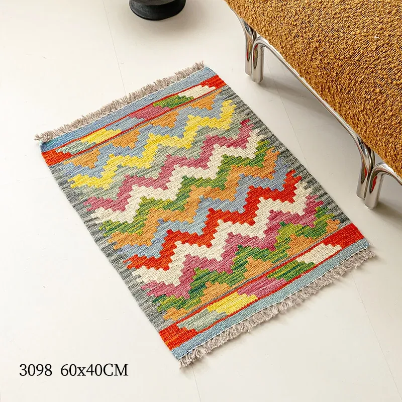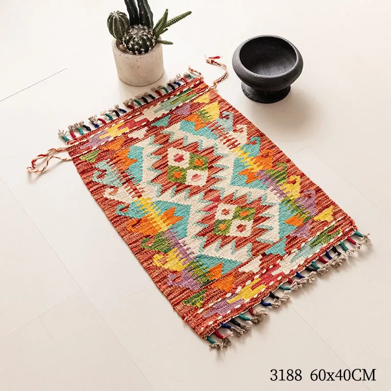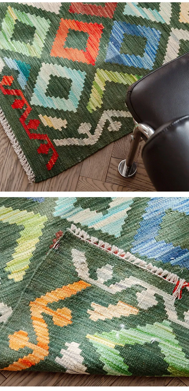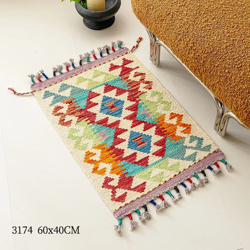 パキスタン直輸入!キリム風民族デザインのレトロ幾何学模様 北欧モダンリビング用ソファラグ/マット/タペストリー。インテリアに華やかさをプラスする一品です。