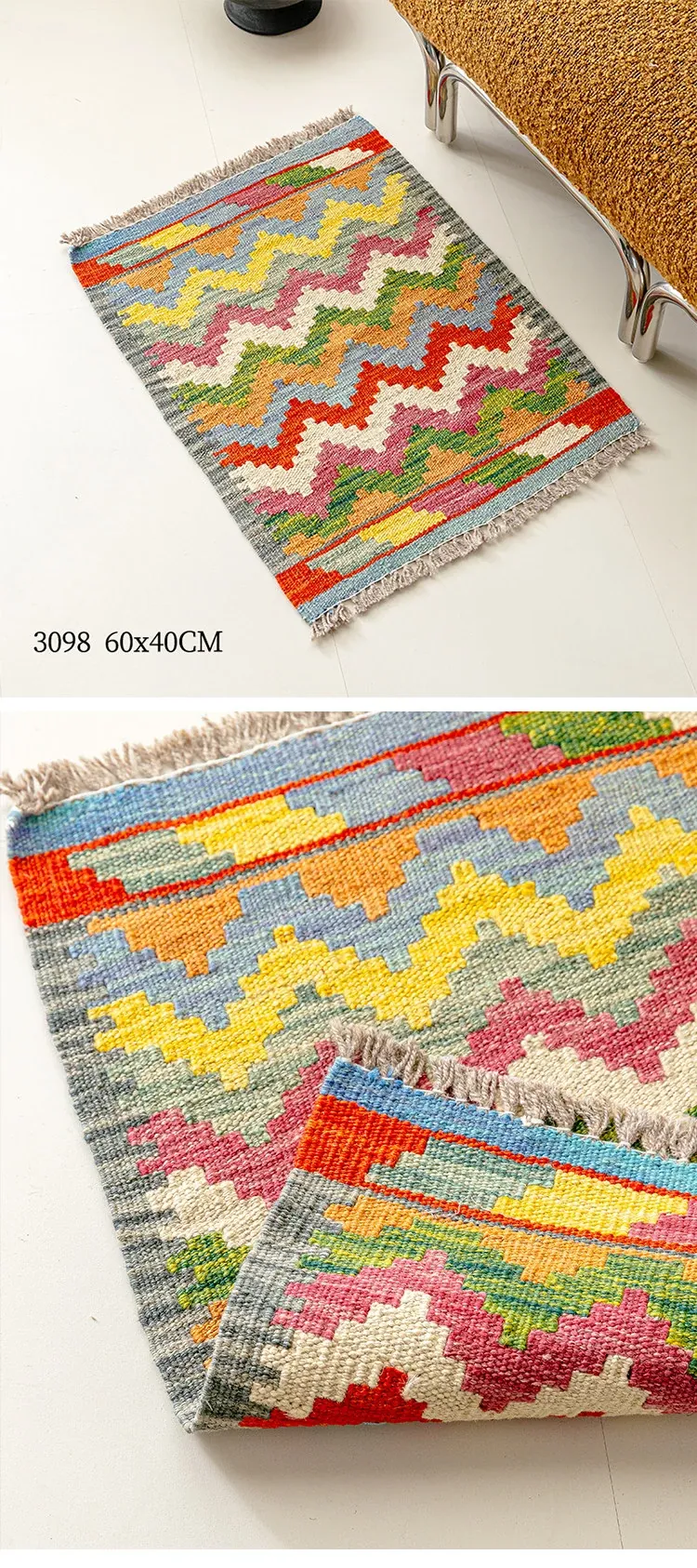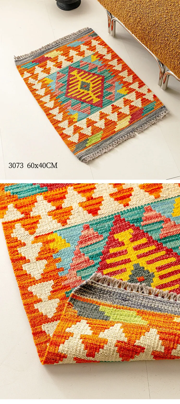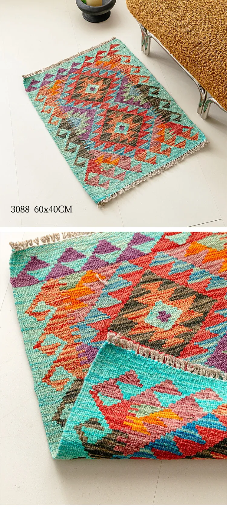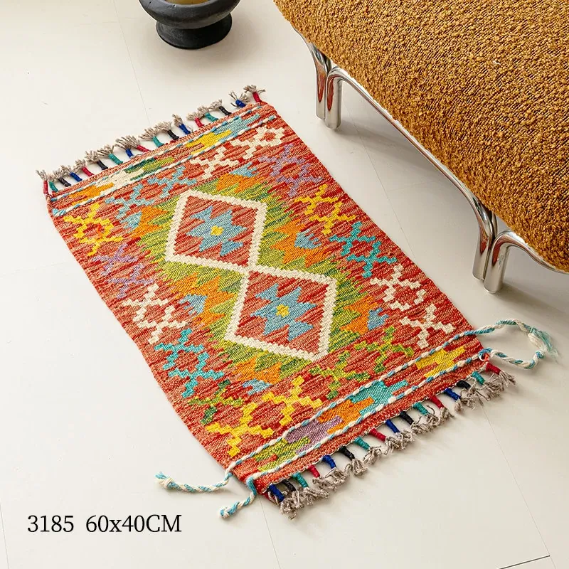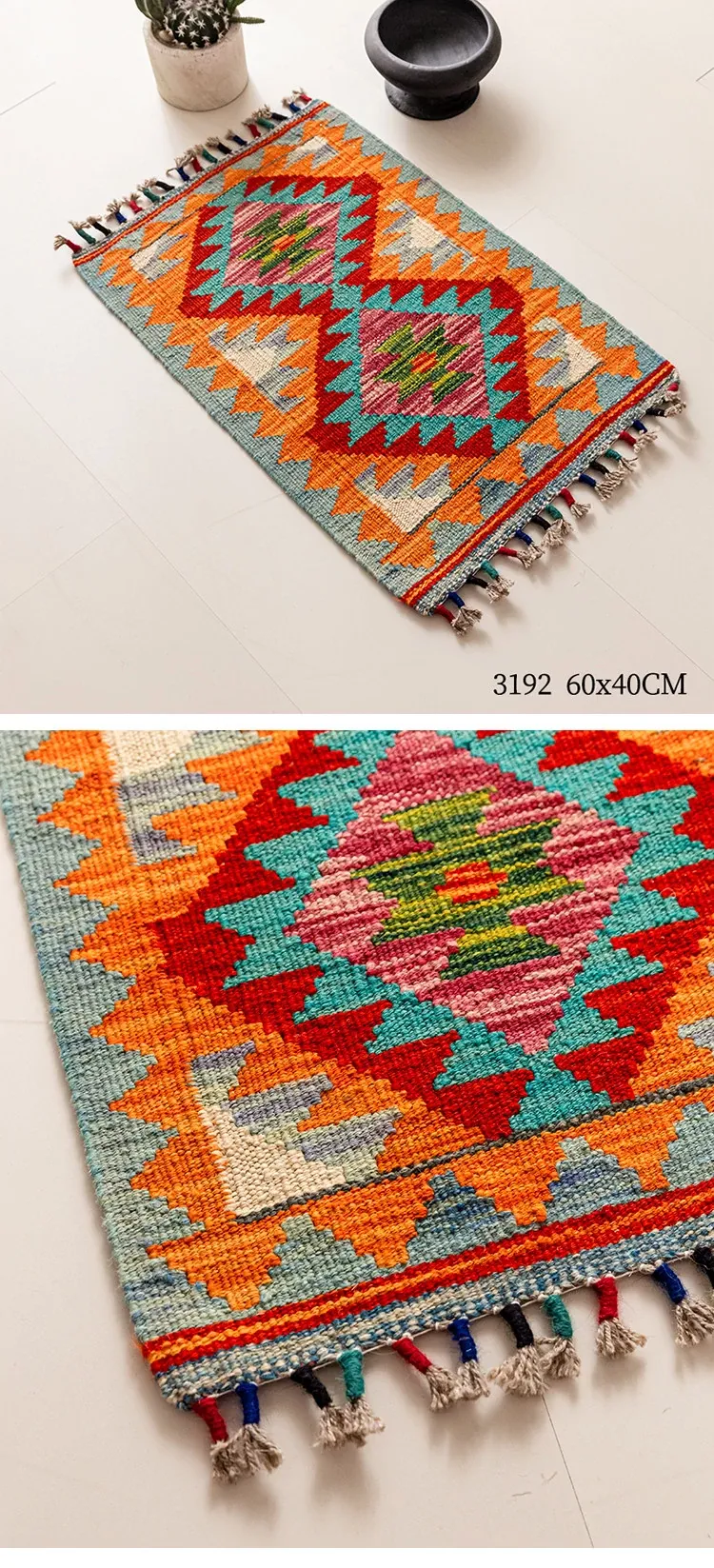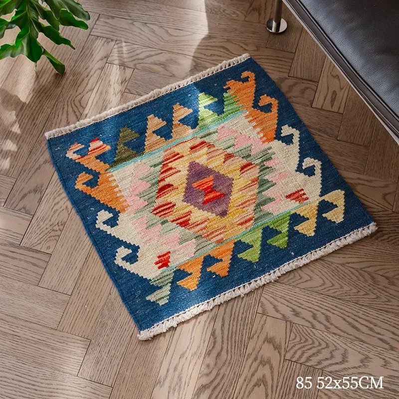 パキスタン直輸入!キリム風民族デザインのレトロ幾何学模様 北欧モダンリビング用ソファラグ/マット/タペストリー。インテリアに華やかさをプラスする一品です。