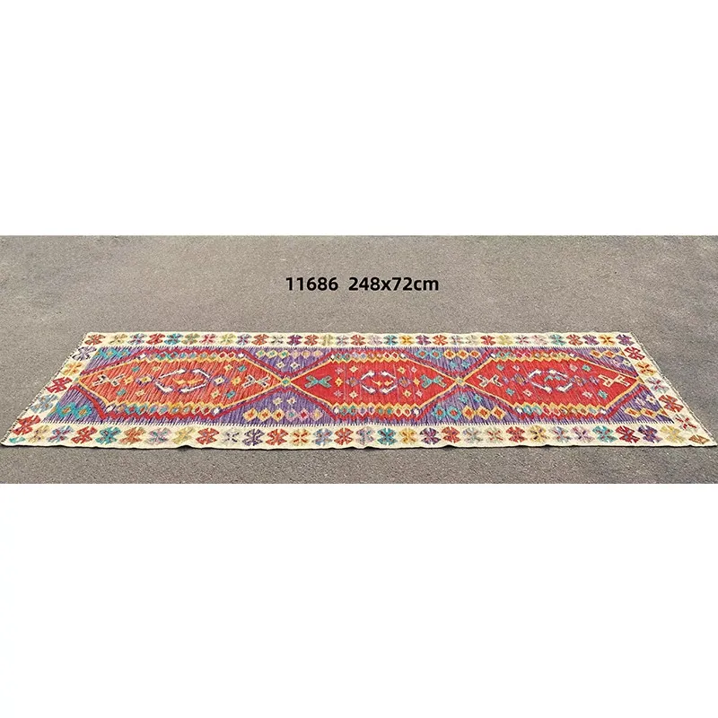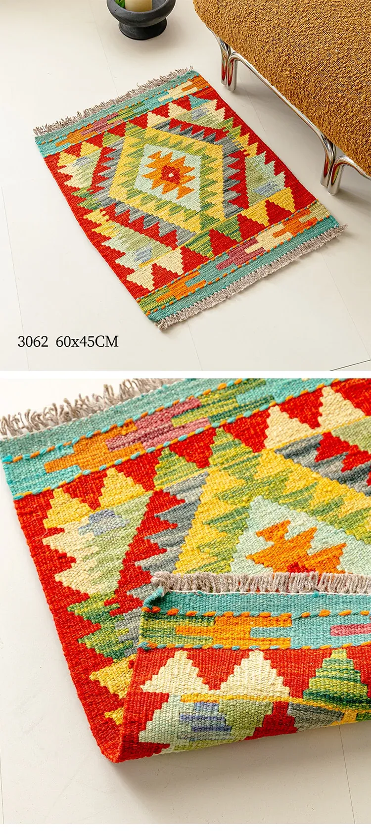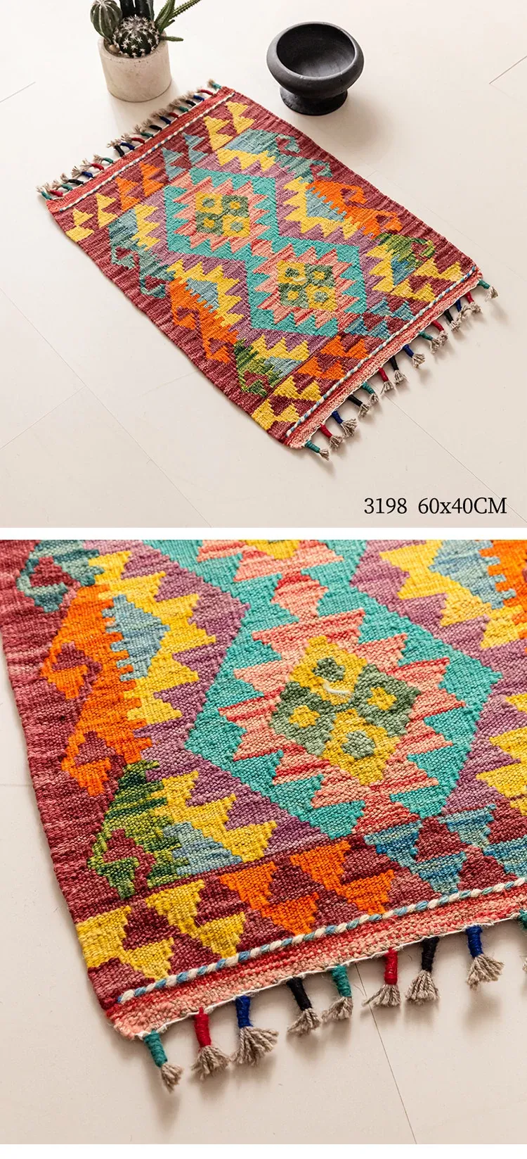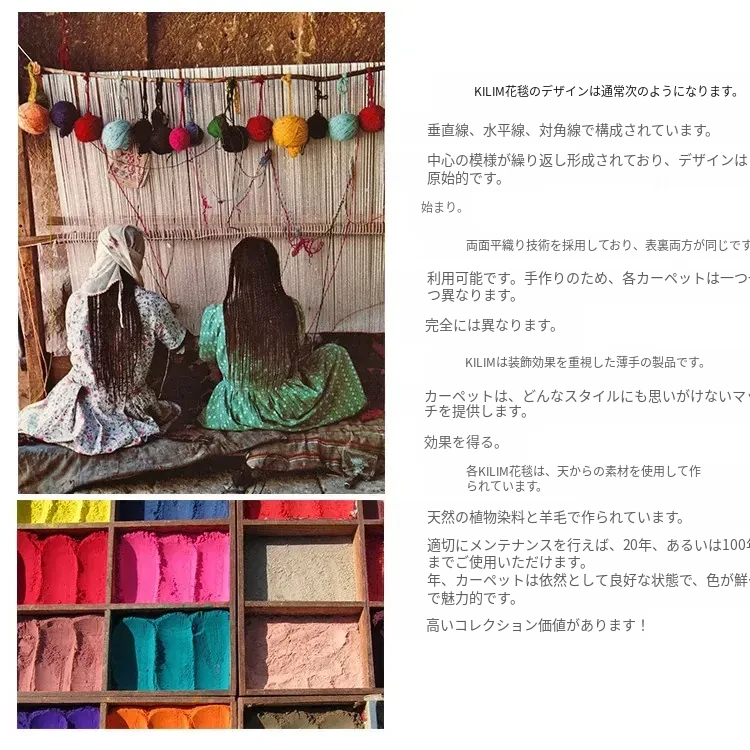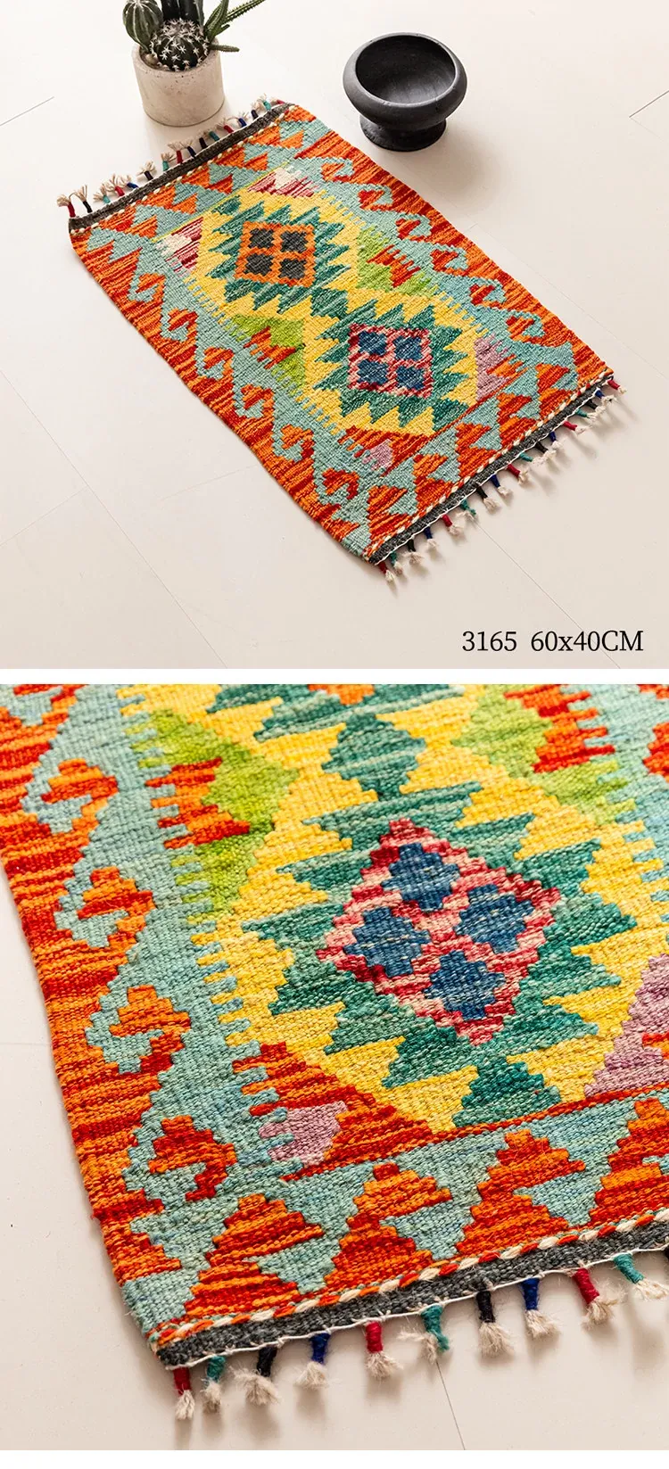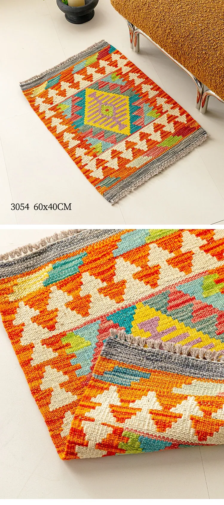パキスタン直輸入!キリム風民族デザインのレトロ幾何学模様 北欧モダンリビング用ソファラグ/マット/タペストリー。インテリアに華やかさをプラスする一品です。