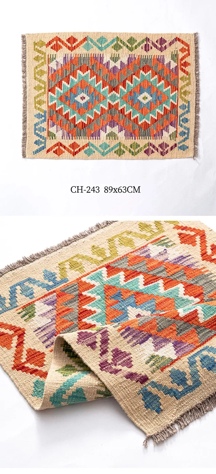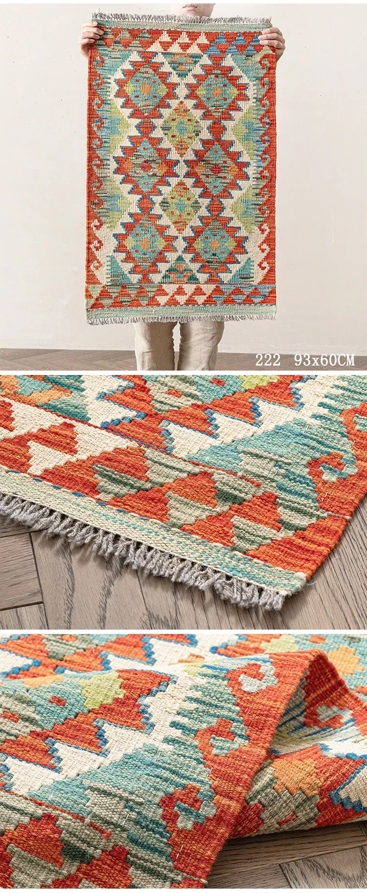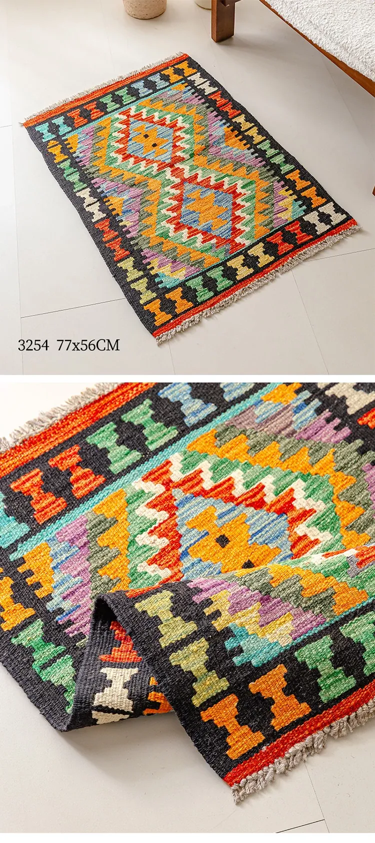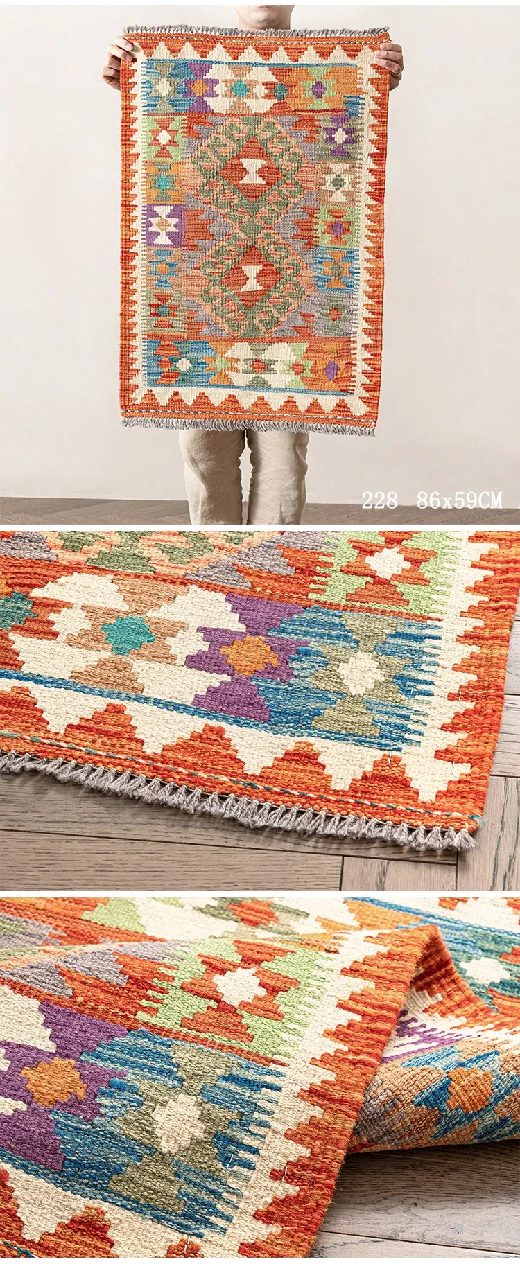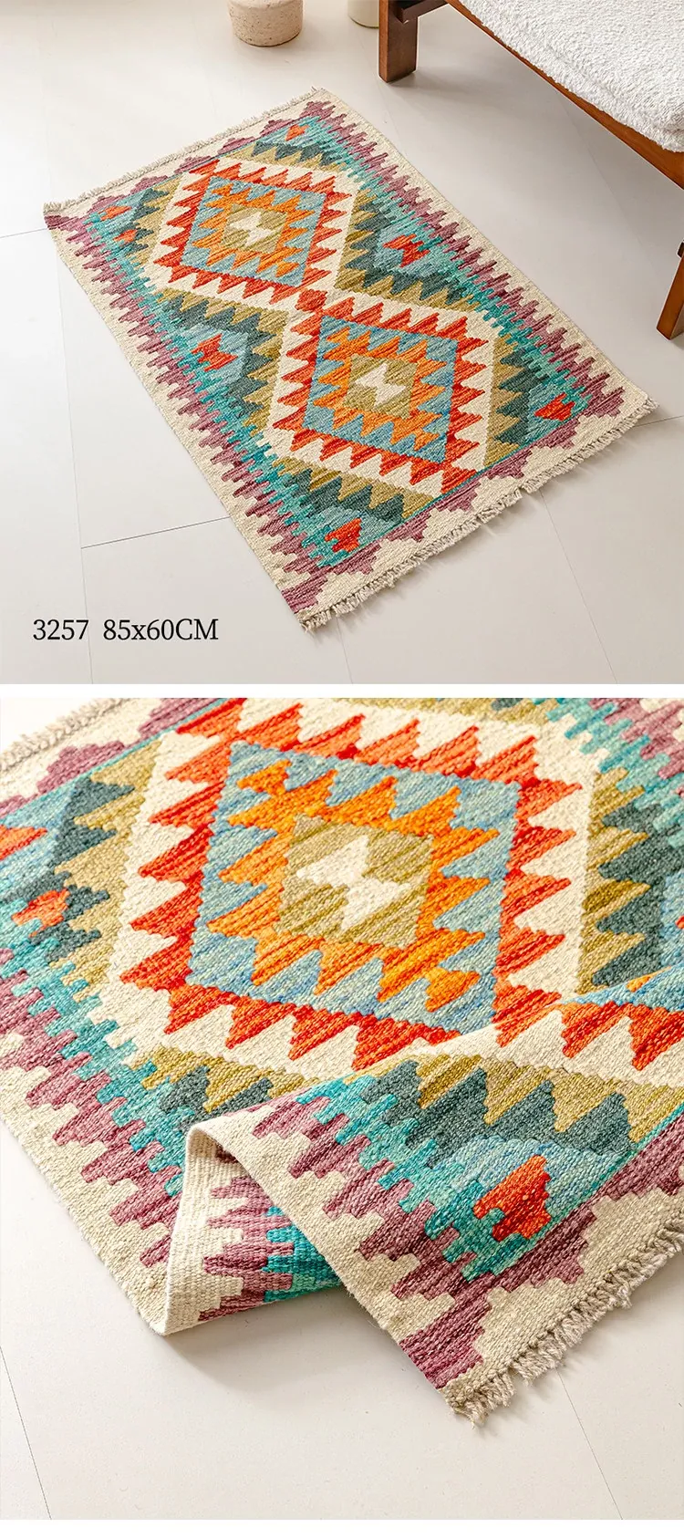 パキスタン直輸入!キリム風民族デザインのレトロ幾何学模様 北欧モダンリビング用ソファラグ/マット/タペストリー。インテリアに華やかさをプラスする一品です。