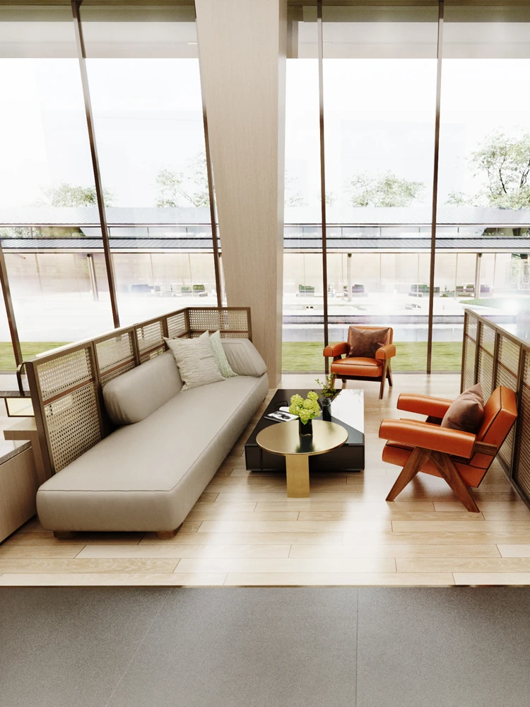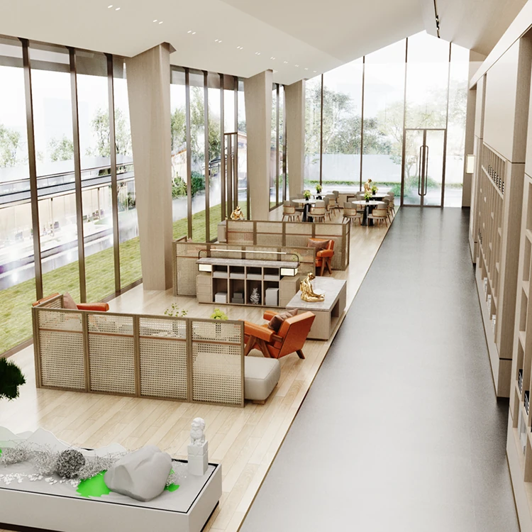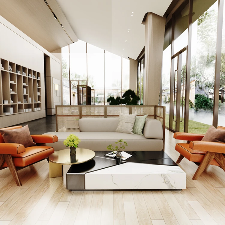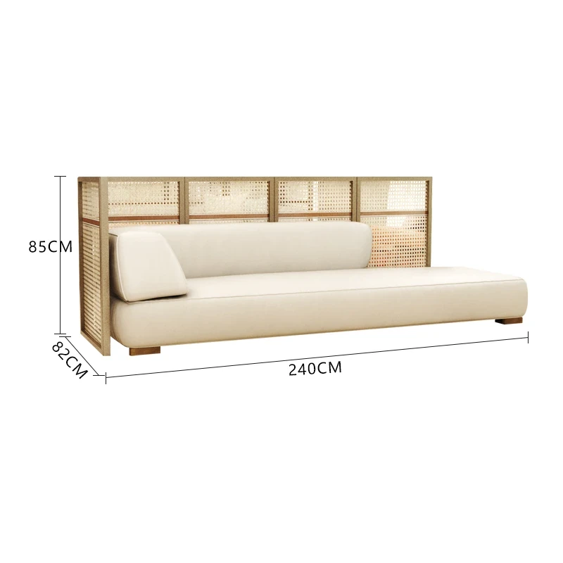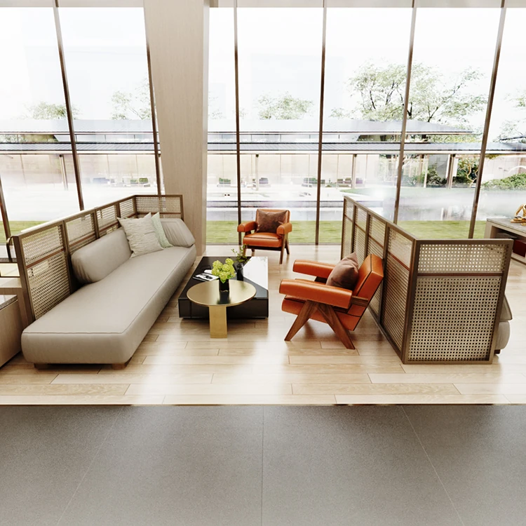 ホテルロビーに最適なポストモダン中式デザインの天然木とラタン編みソファセット。販売所や接待エリアにぴったりのスタイリッシュなソファチェアとコーヒーテーブルのコンビネーションで、洗練された空間を演出します。