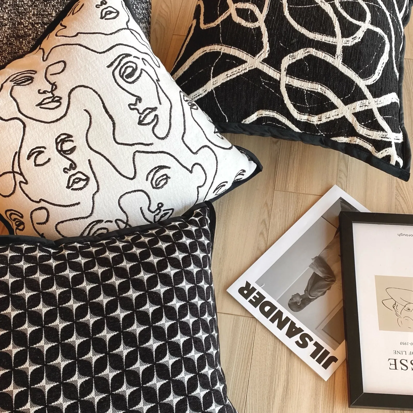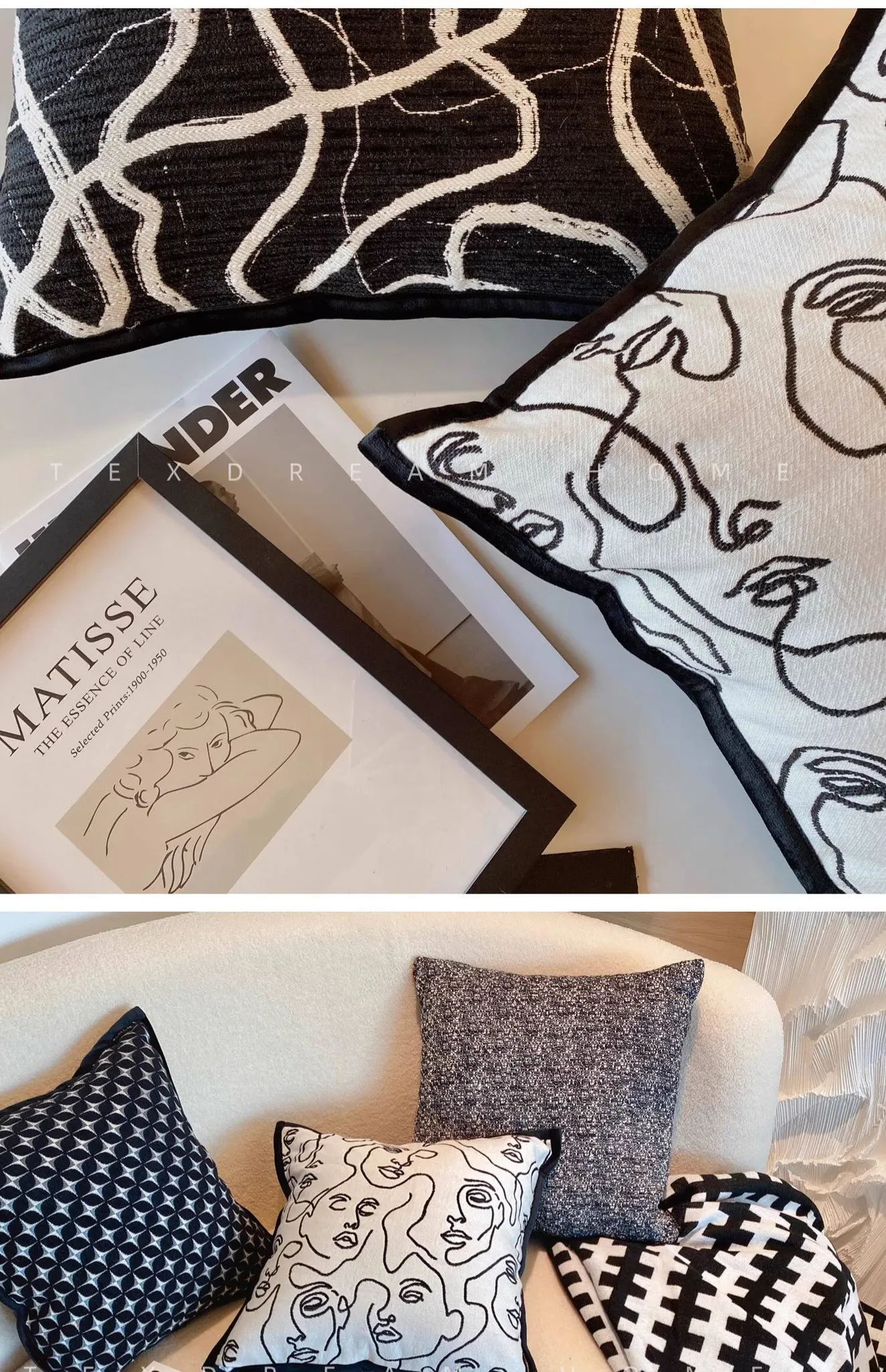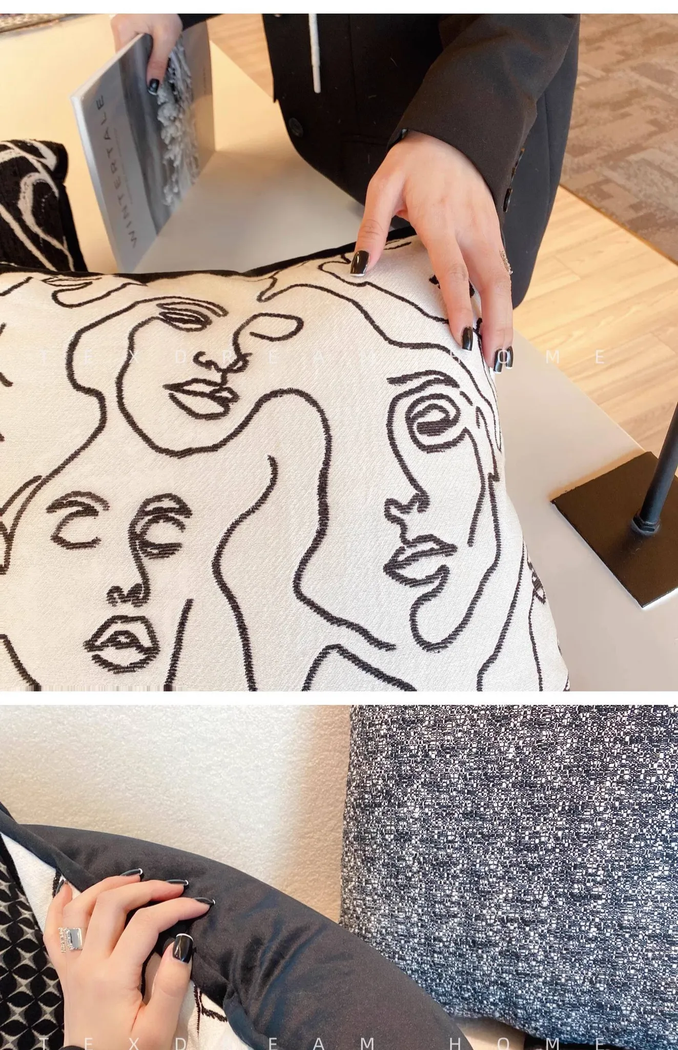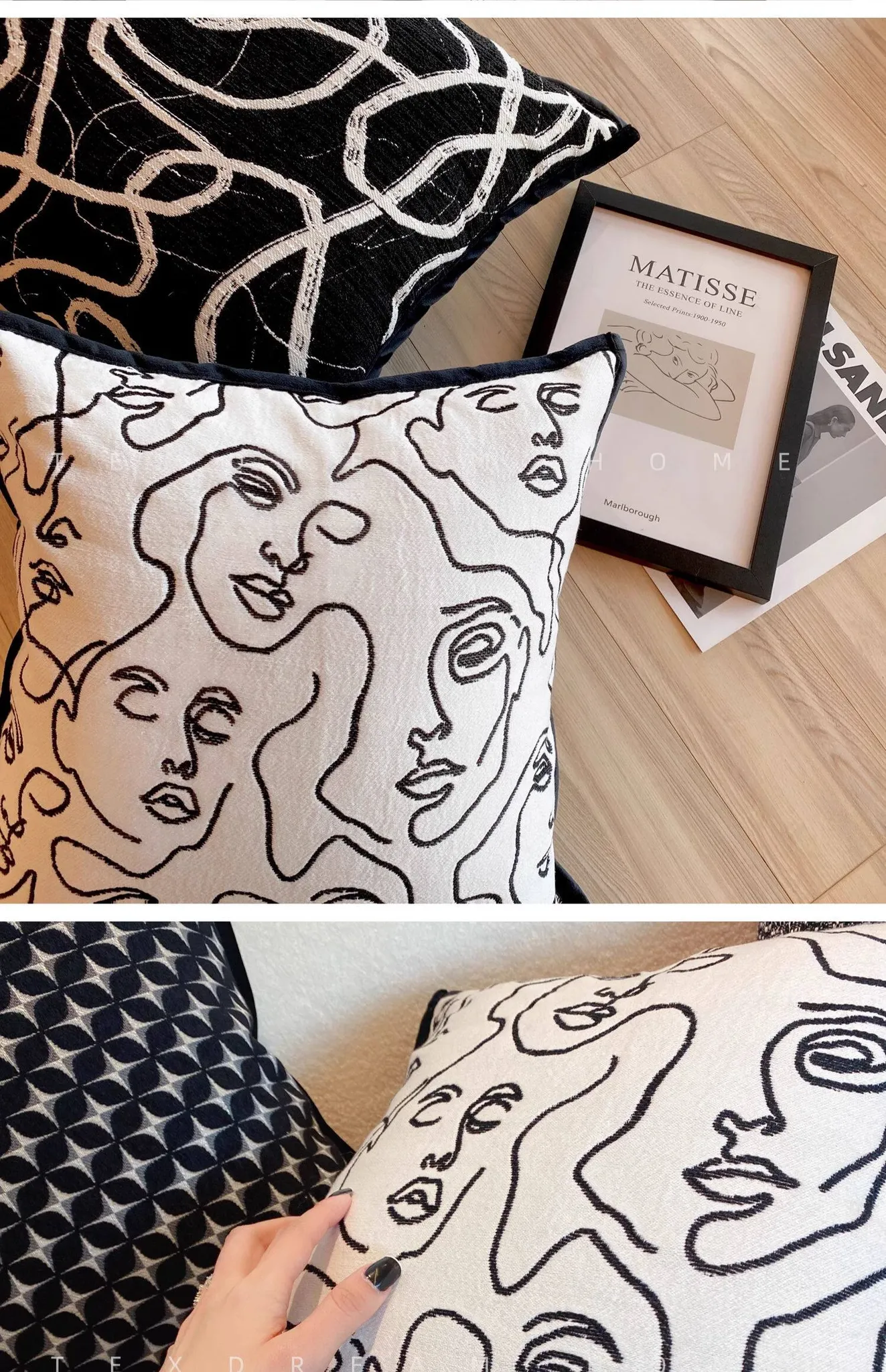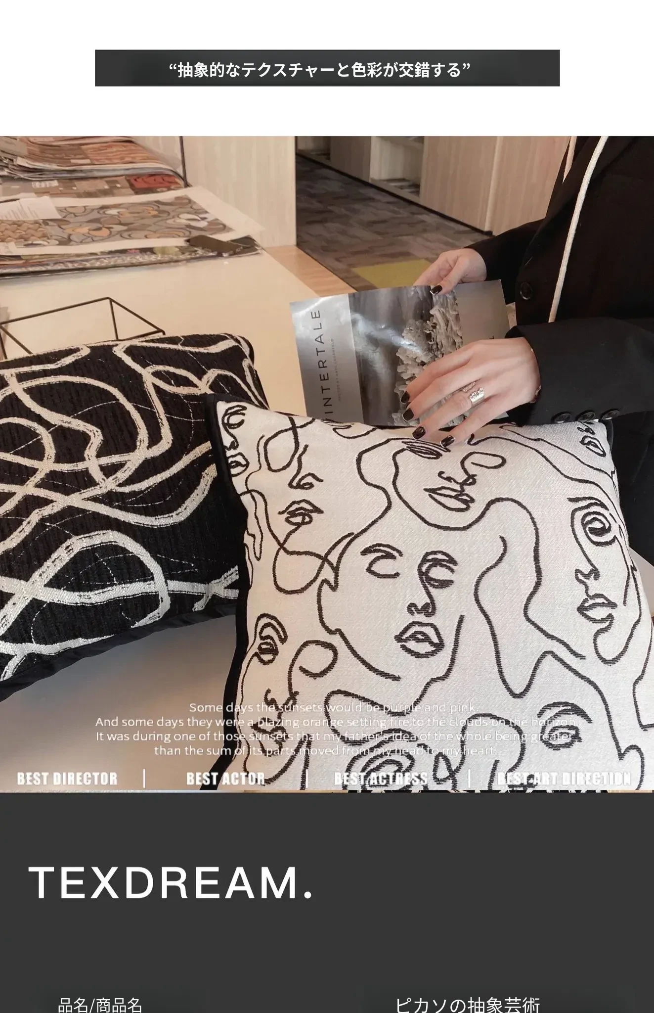 Texdreamのスタイル アブストラクトフェイス デザイナーズモノクロコットンリネン モダンリビングソファクッション 高級感漂うクッション