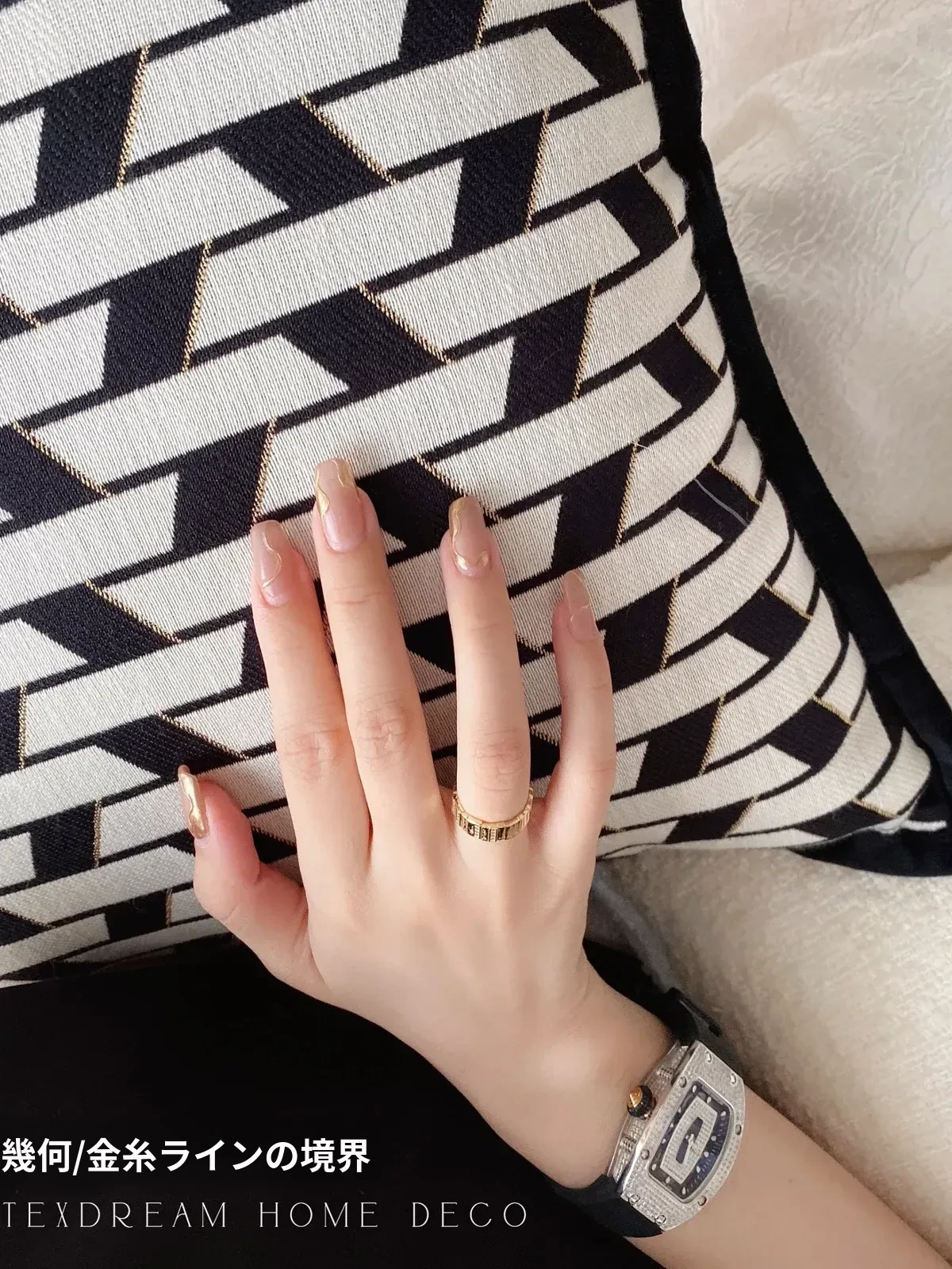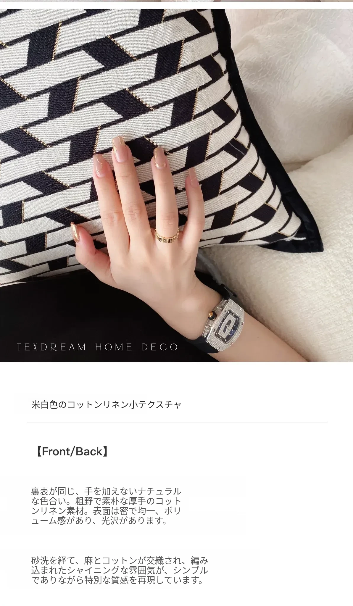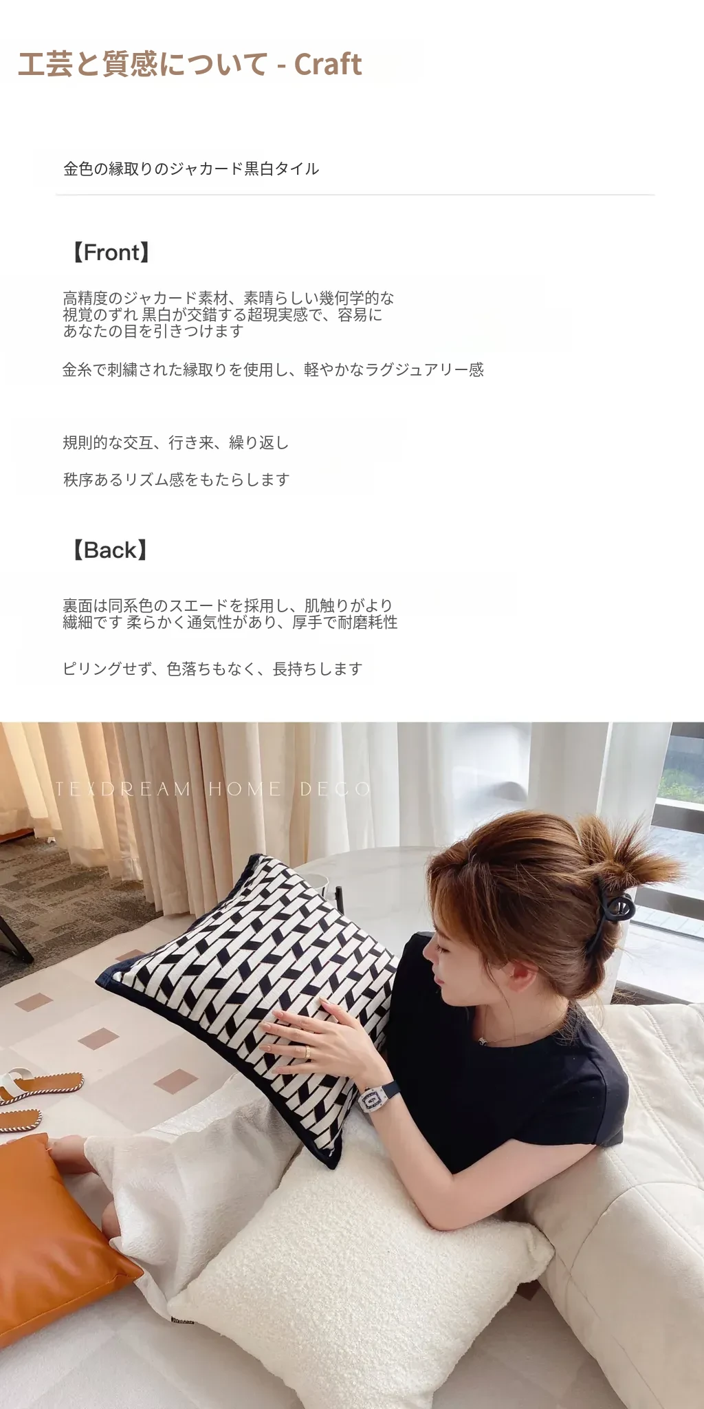 【金縁ジャガード黒白レンガクッション】