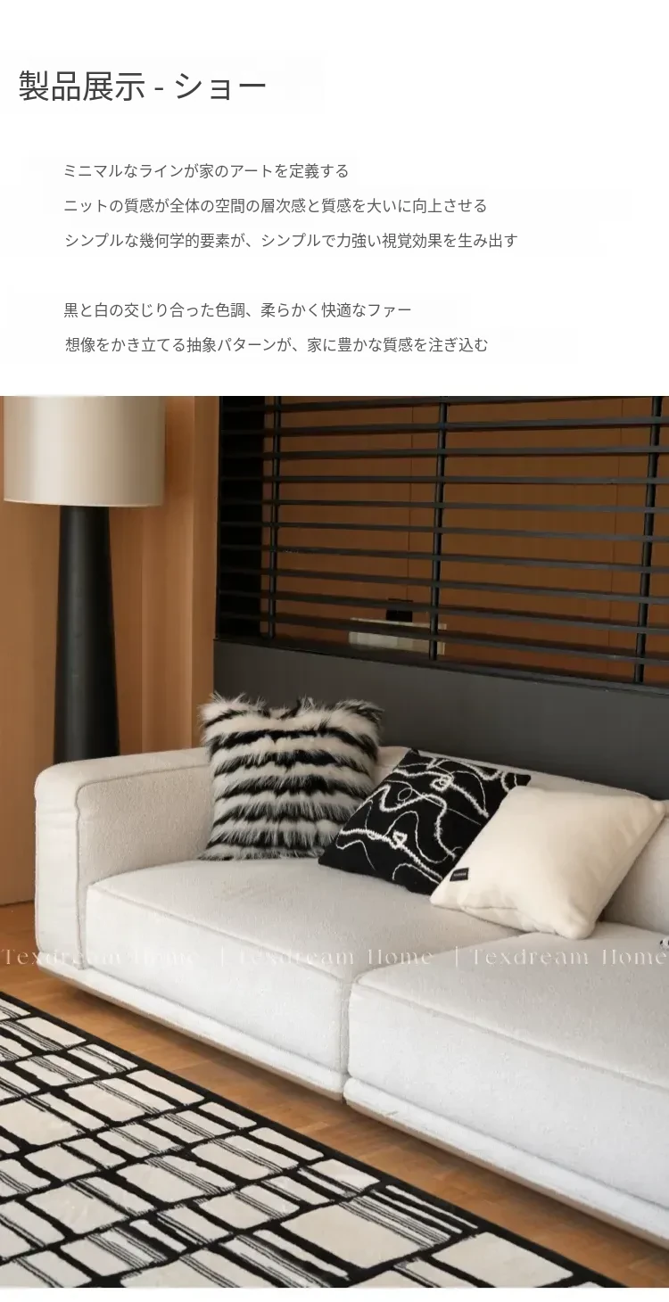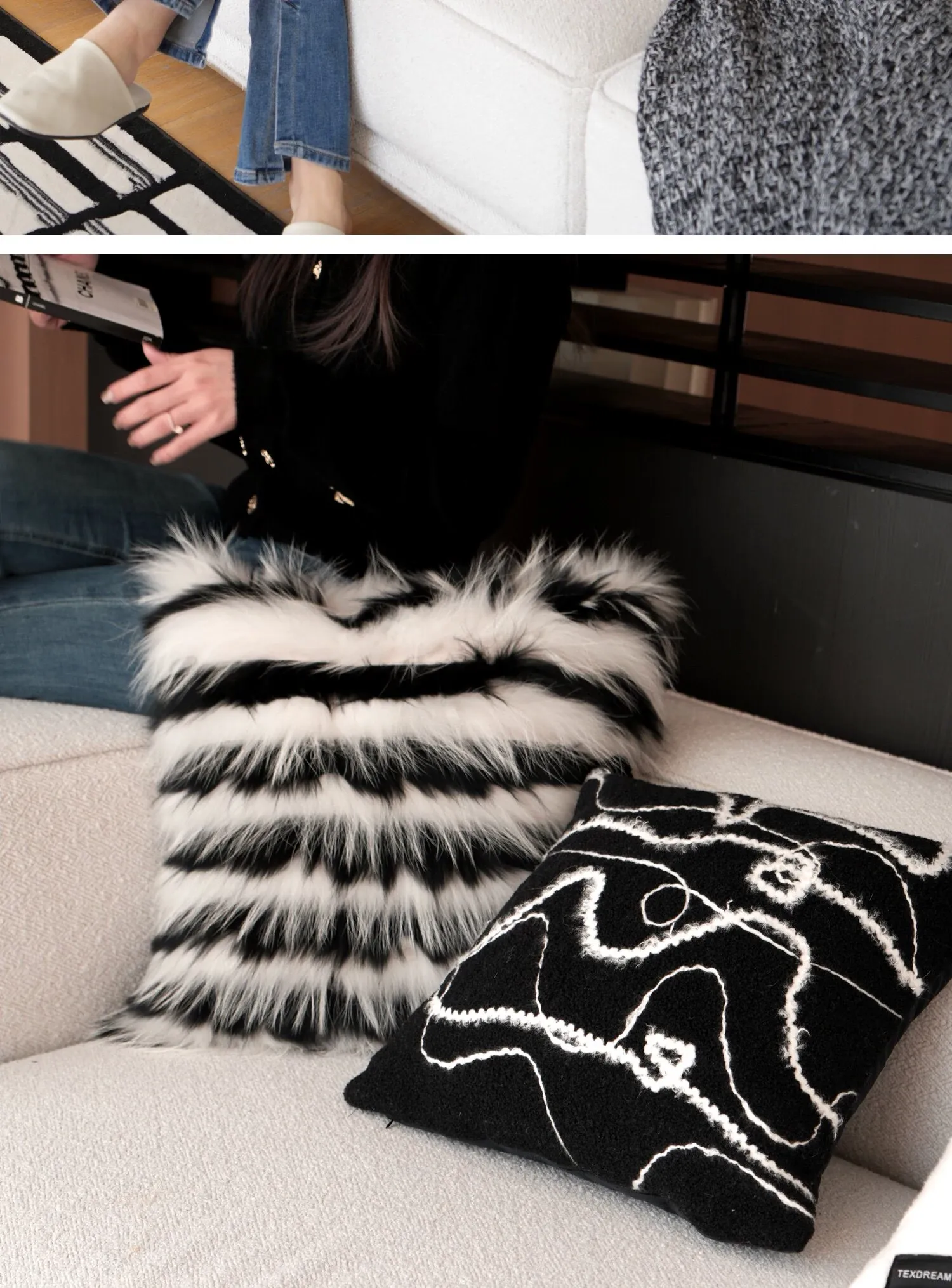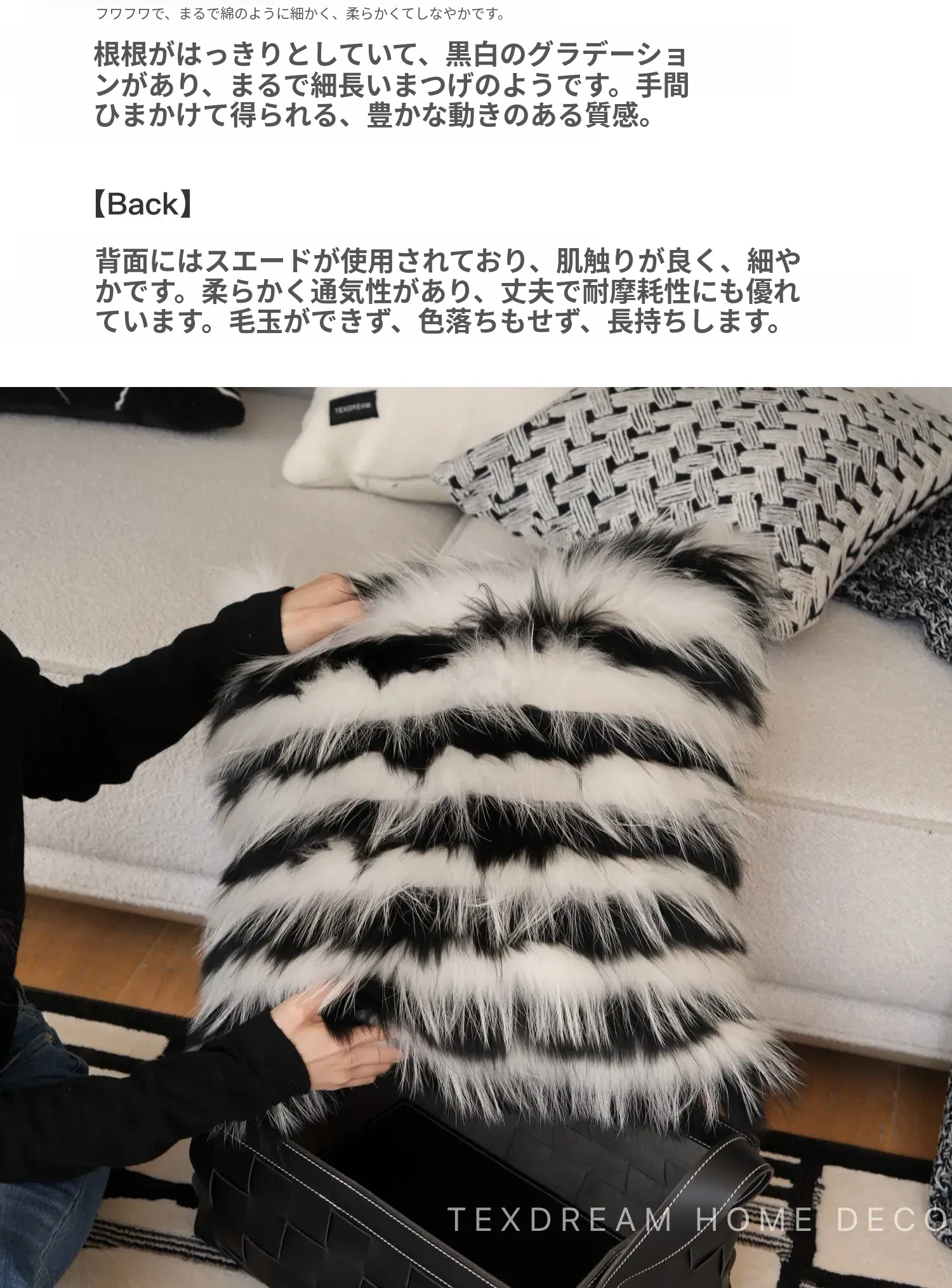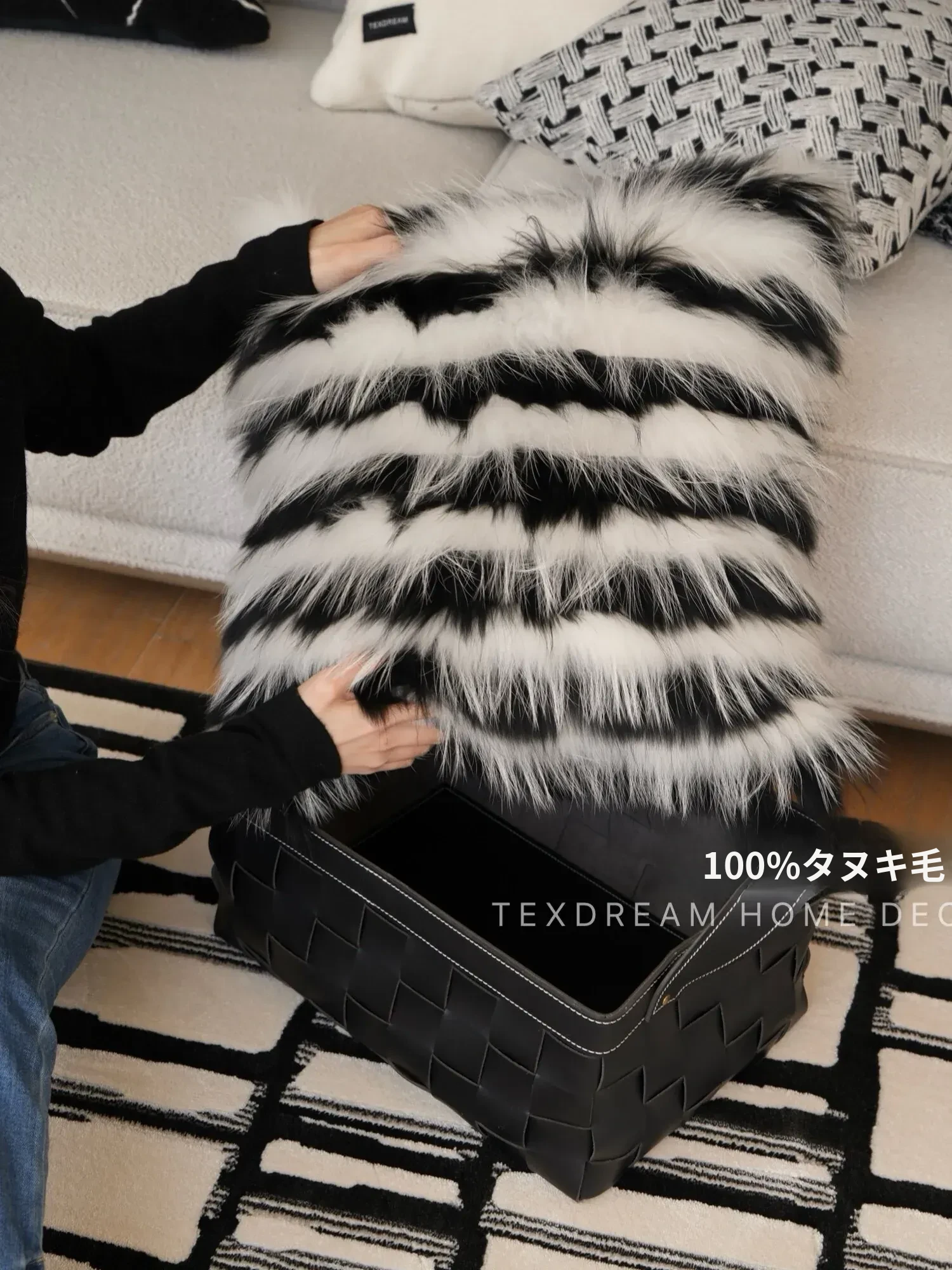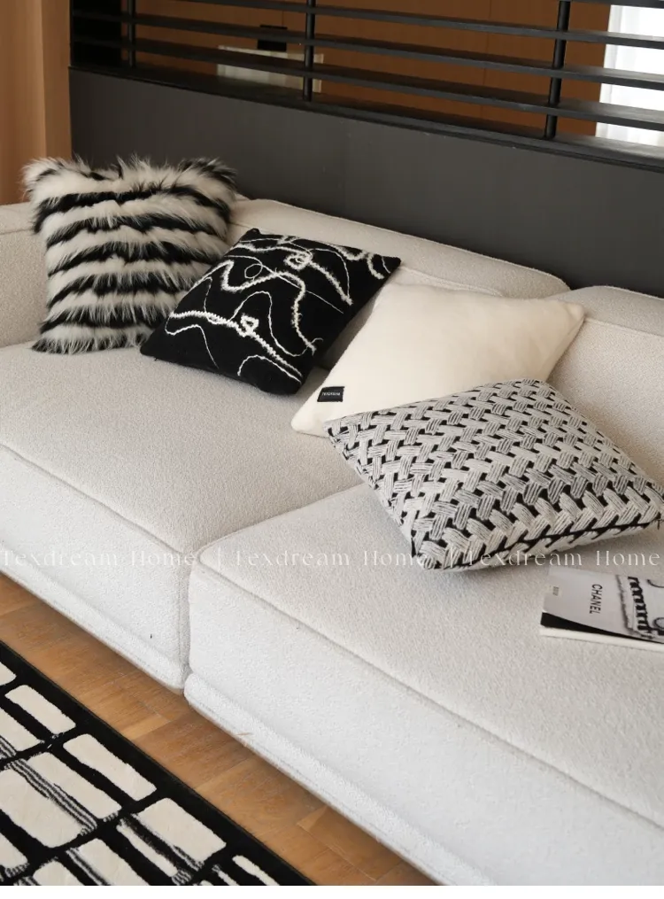 Texdreamのスタイル ブラック&ホワイトのテクスチャー モダンでラグジュアリーなミンクファーの抱き枕 ソファやモデルルームにぴったりの高級感あふれるクッション