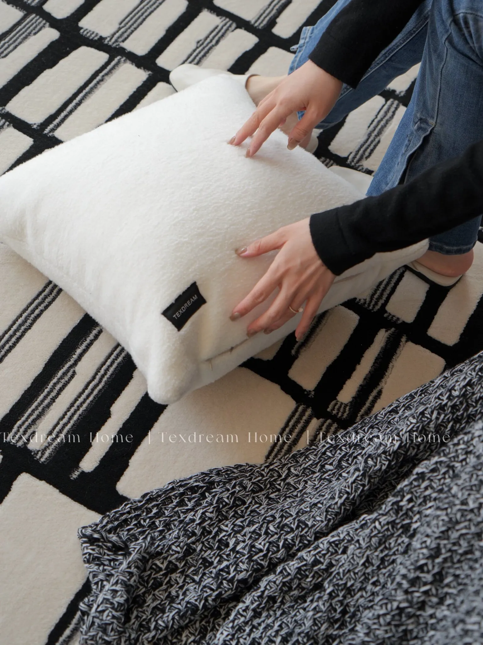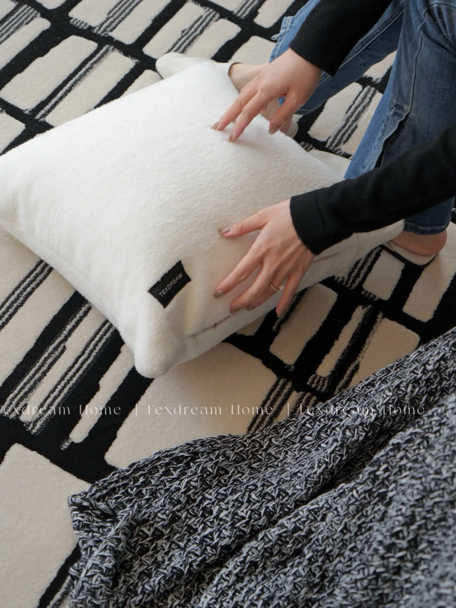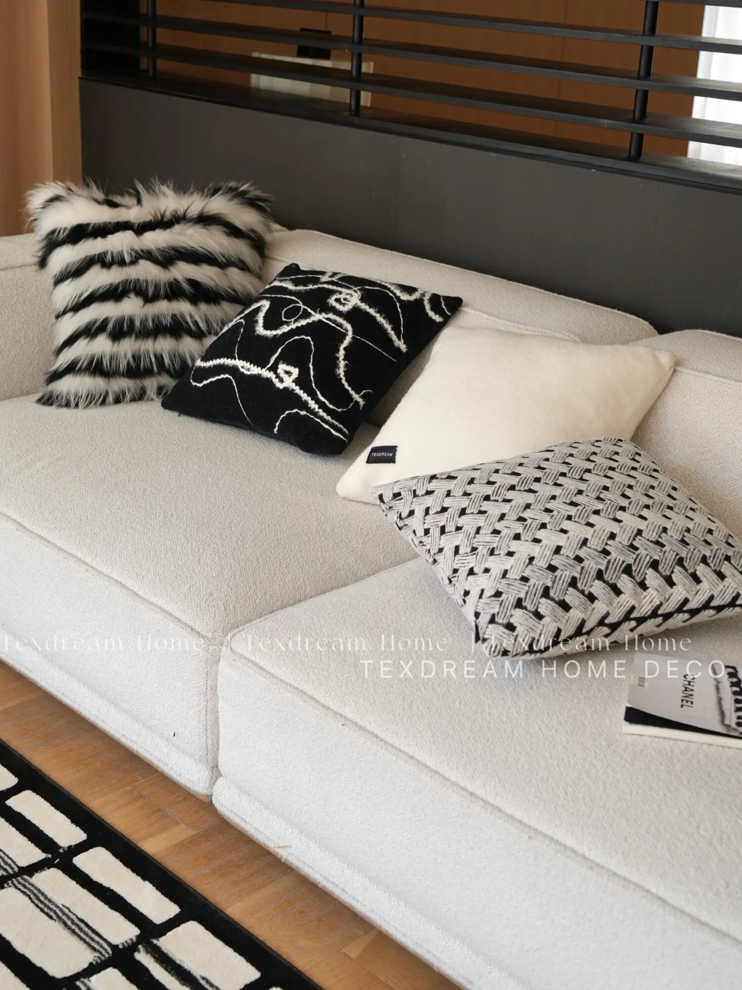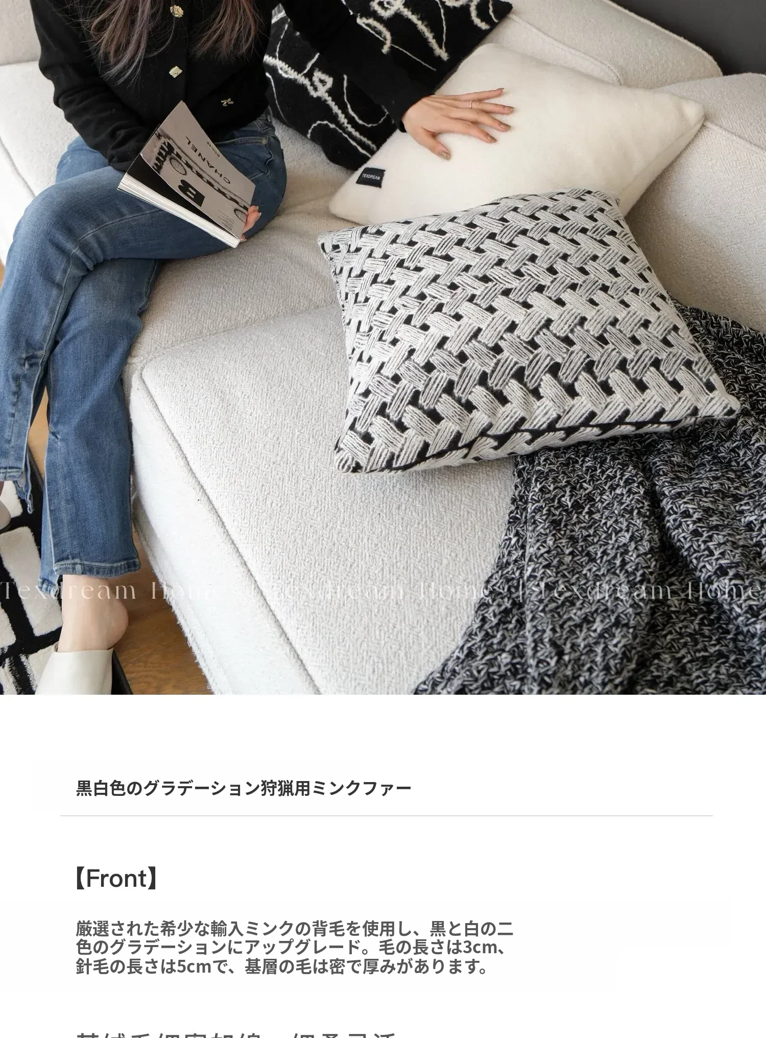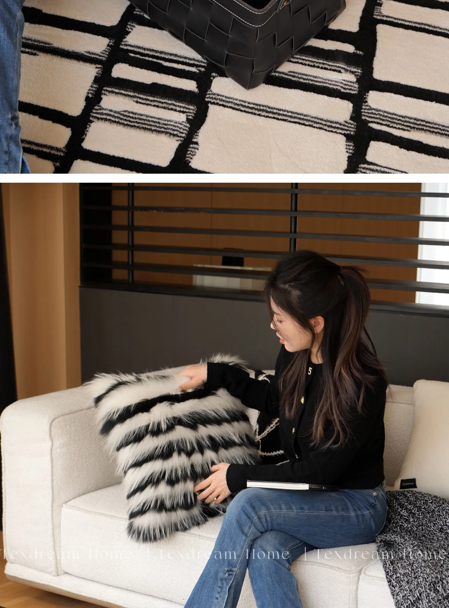 Texdreamのスタイル ブラック&ホワイトのテクスチャー モダンでラグジュアリーなミンクファーの抱き枕 ソファやモデルルームにぴったりの高級感あふれるクッション