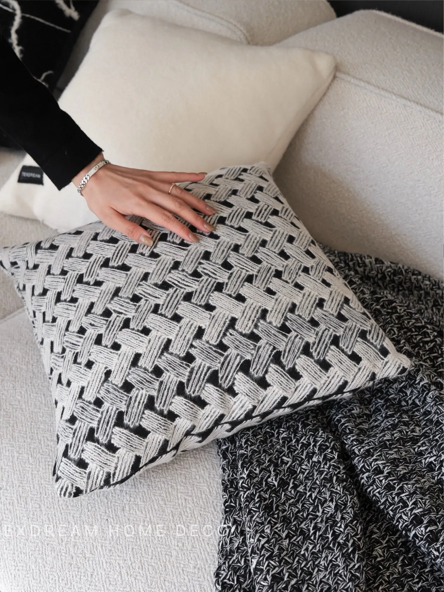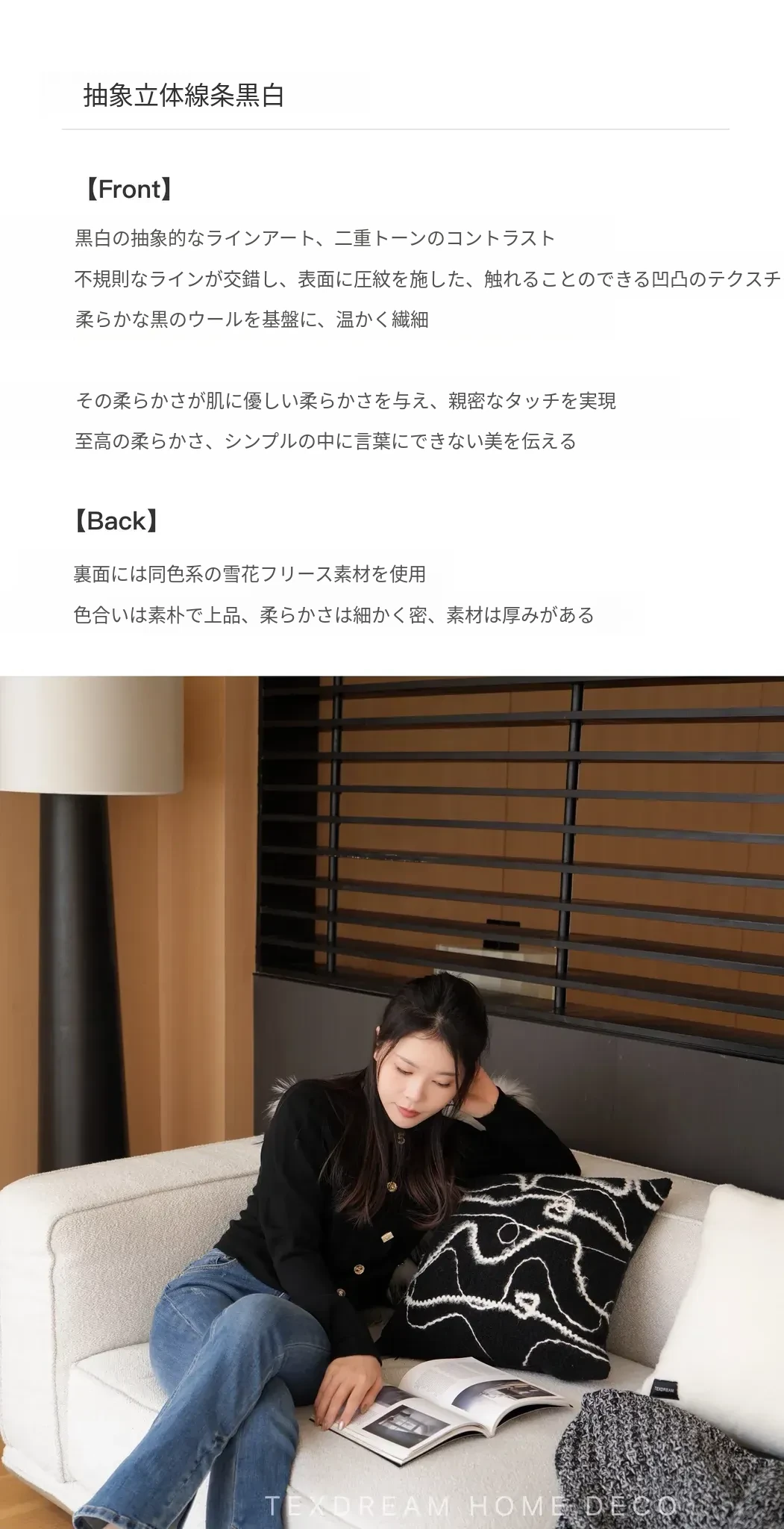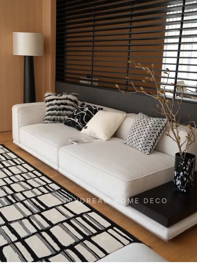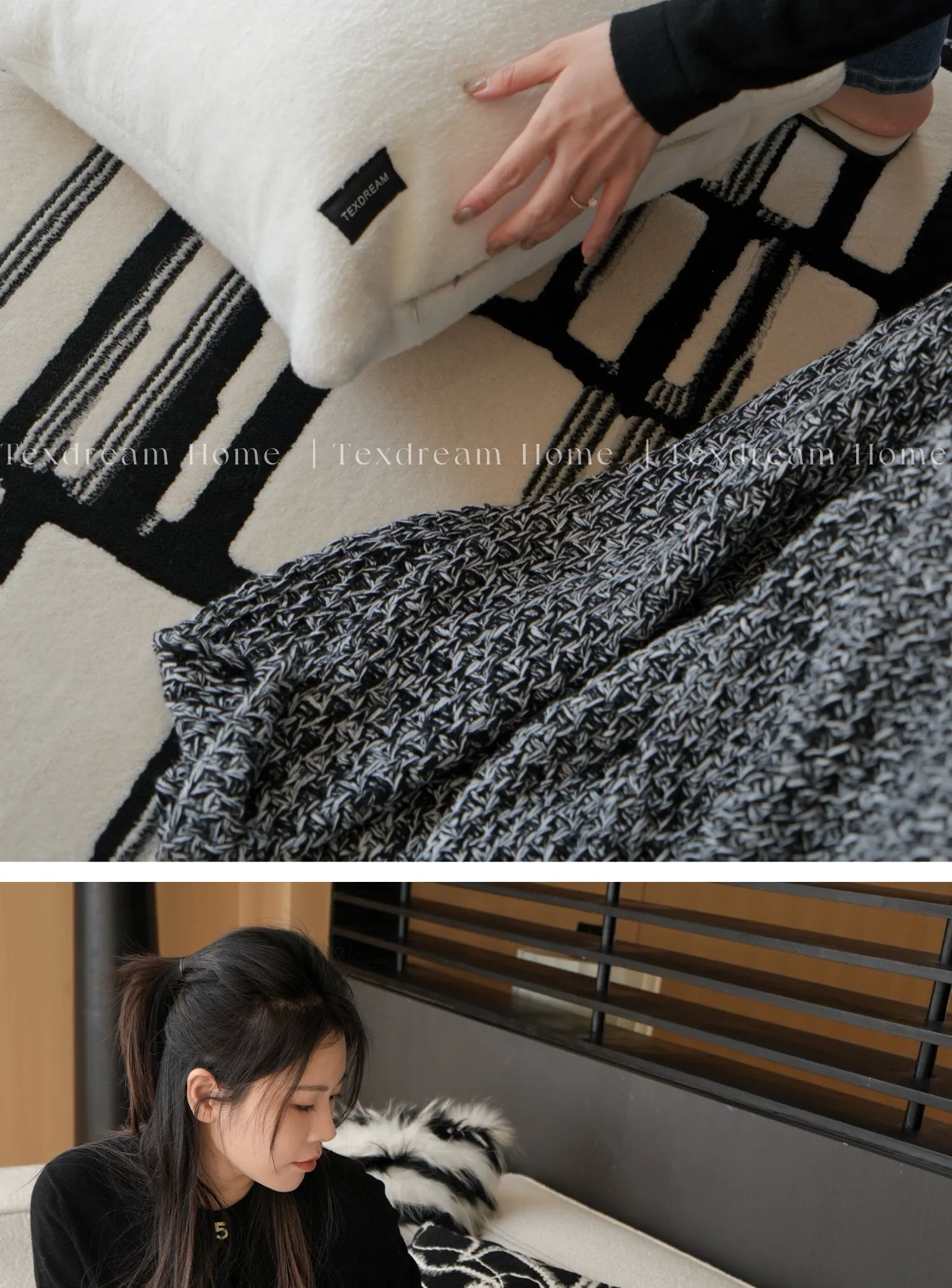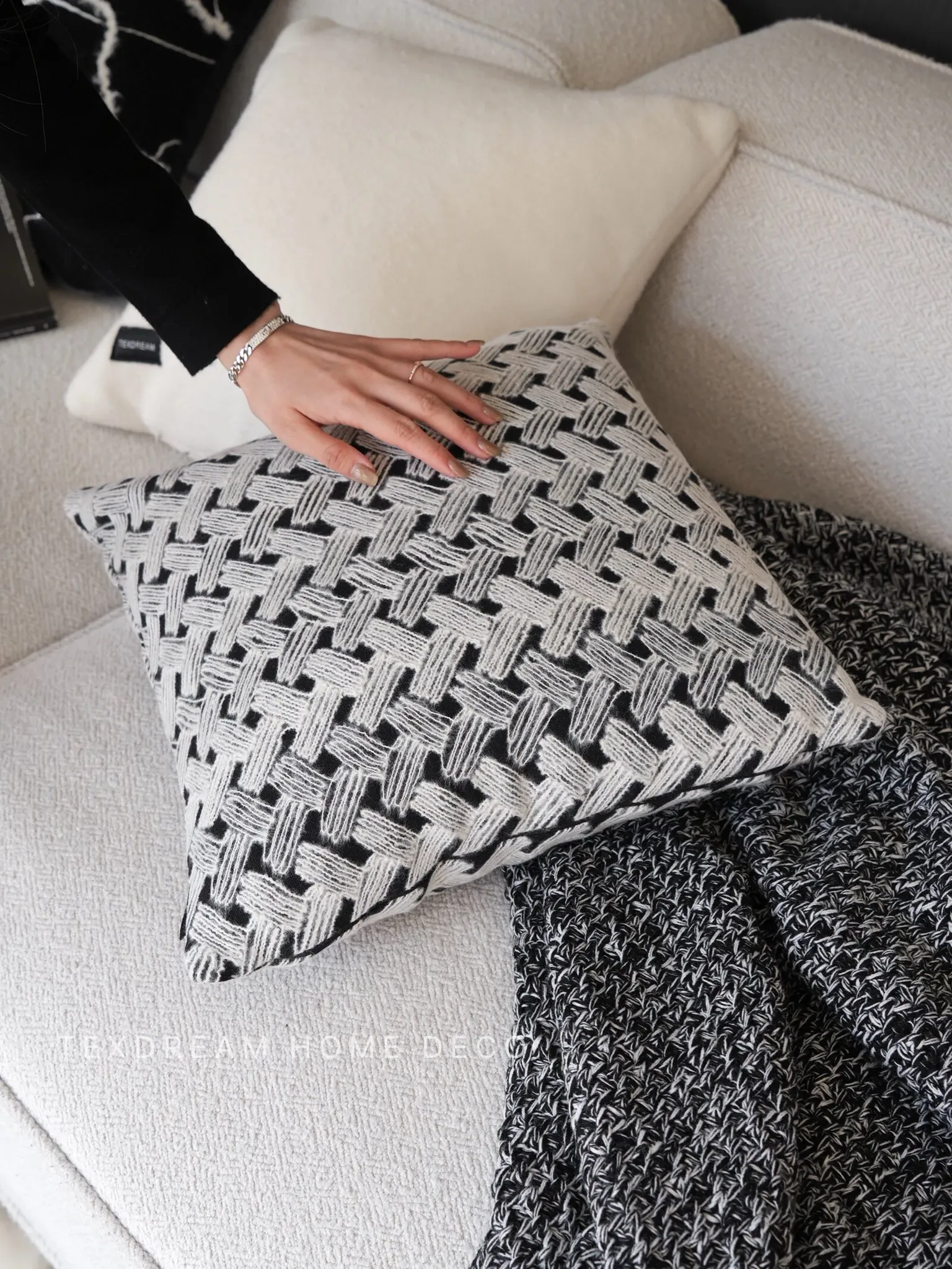 Texdreamのスタイル ブラック&ホワイトのテクスチャー モダンでラグジュアリーなミンクファーの抱き枕 ソファやモデルルームにぴったりの高級感あふれるクッション
