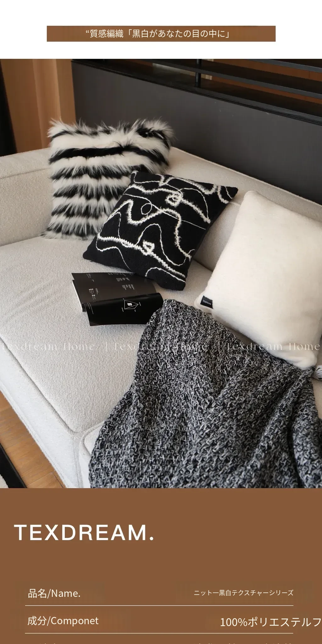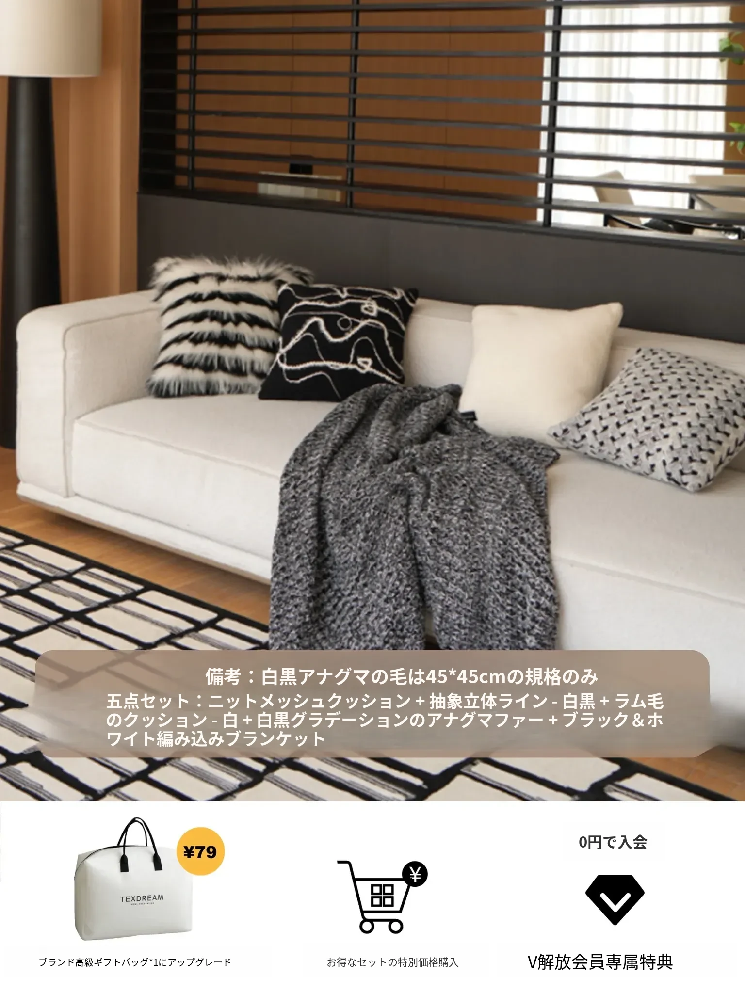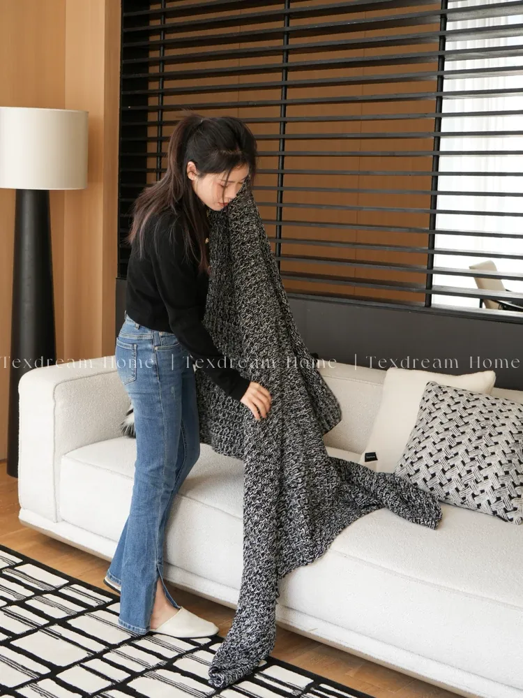 【黒白のテクスチャー | 5点セット(クッション4個 + カバー毛布1個)】