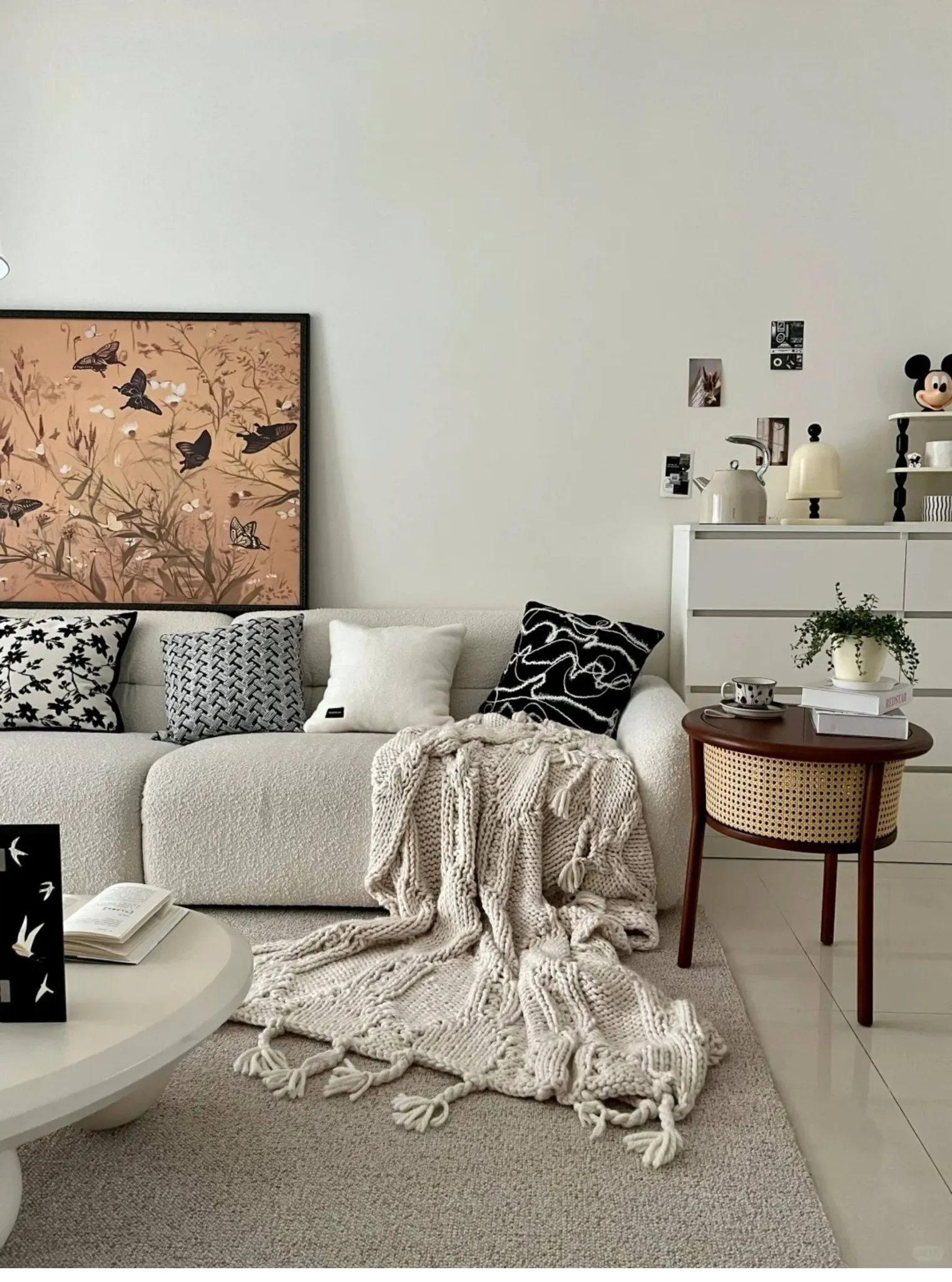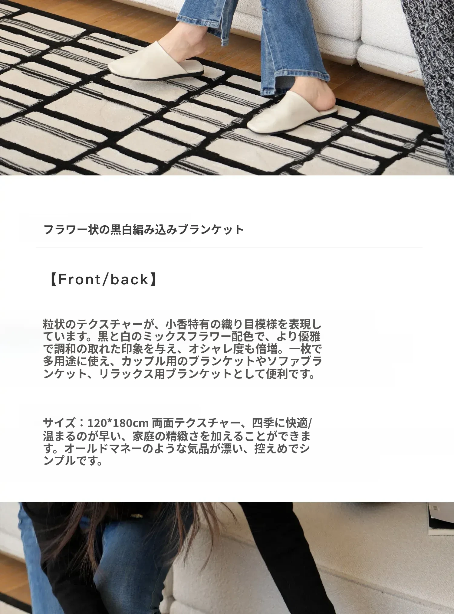 【花柄の黒白編み込みブランケット】