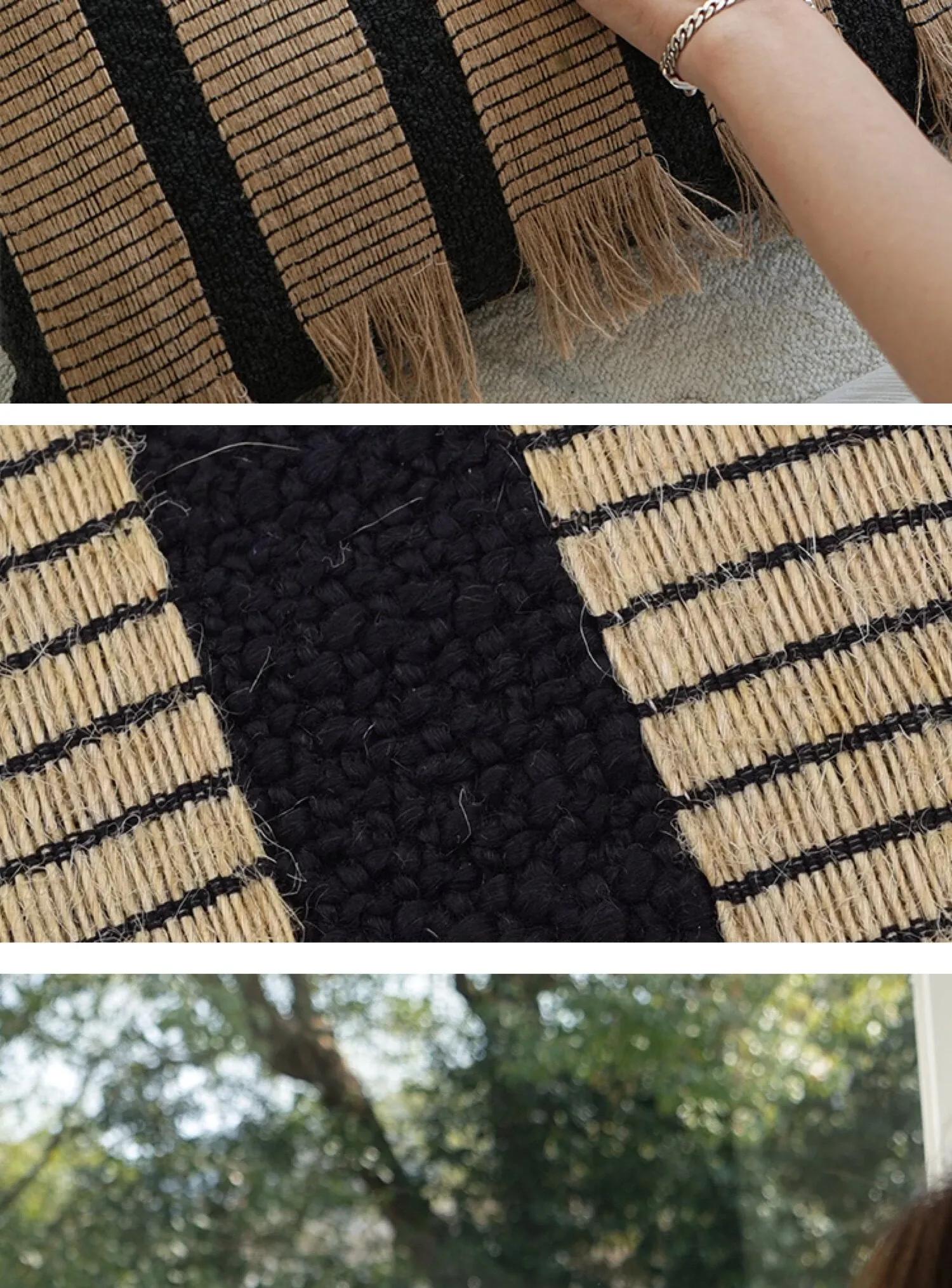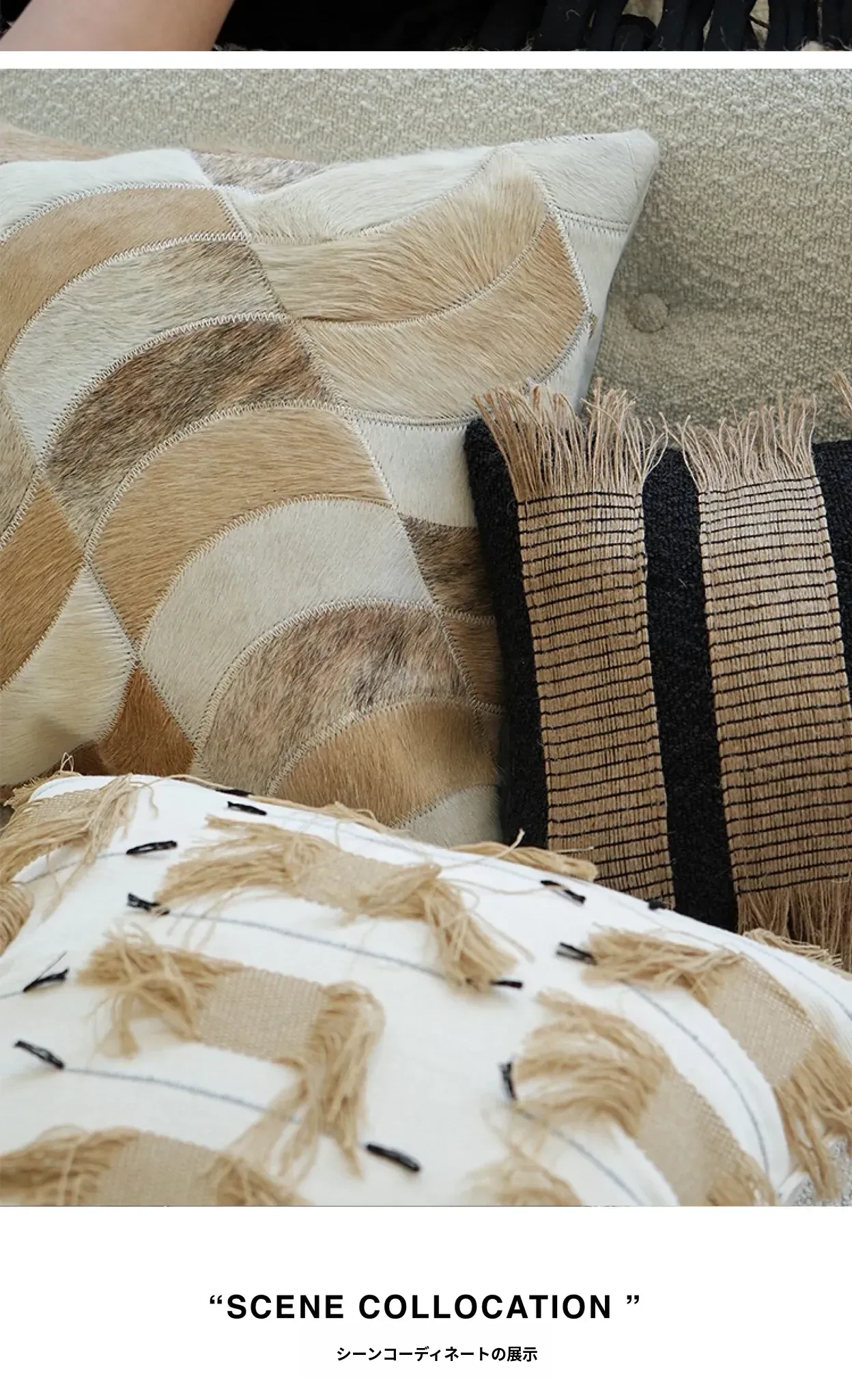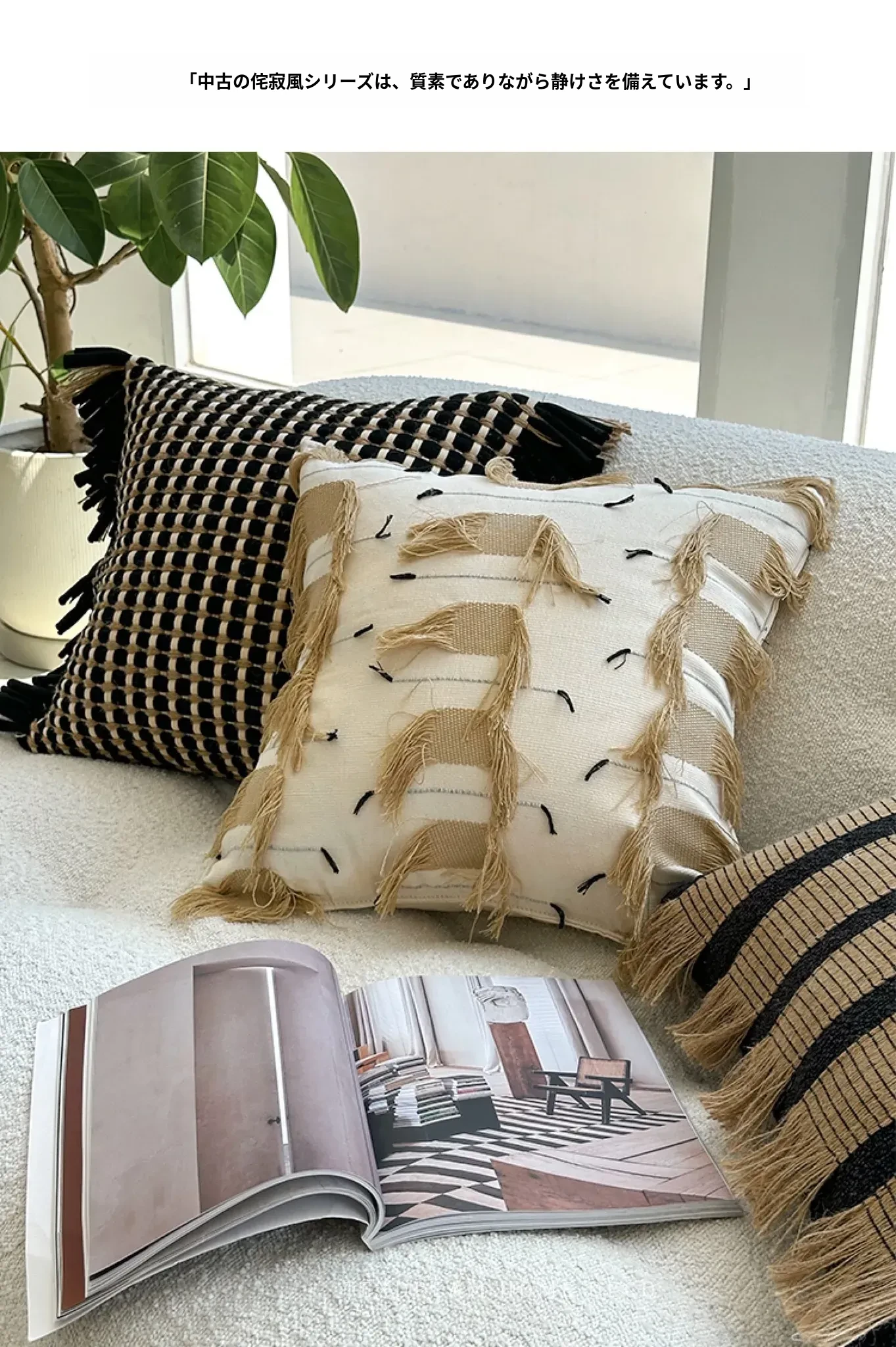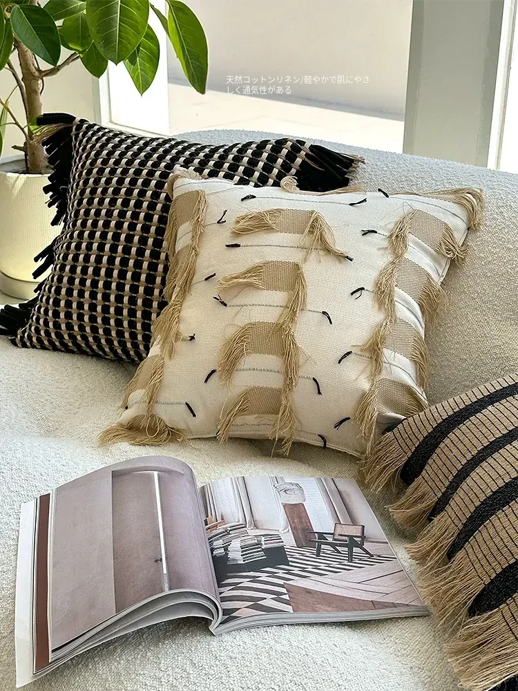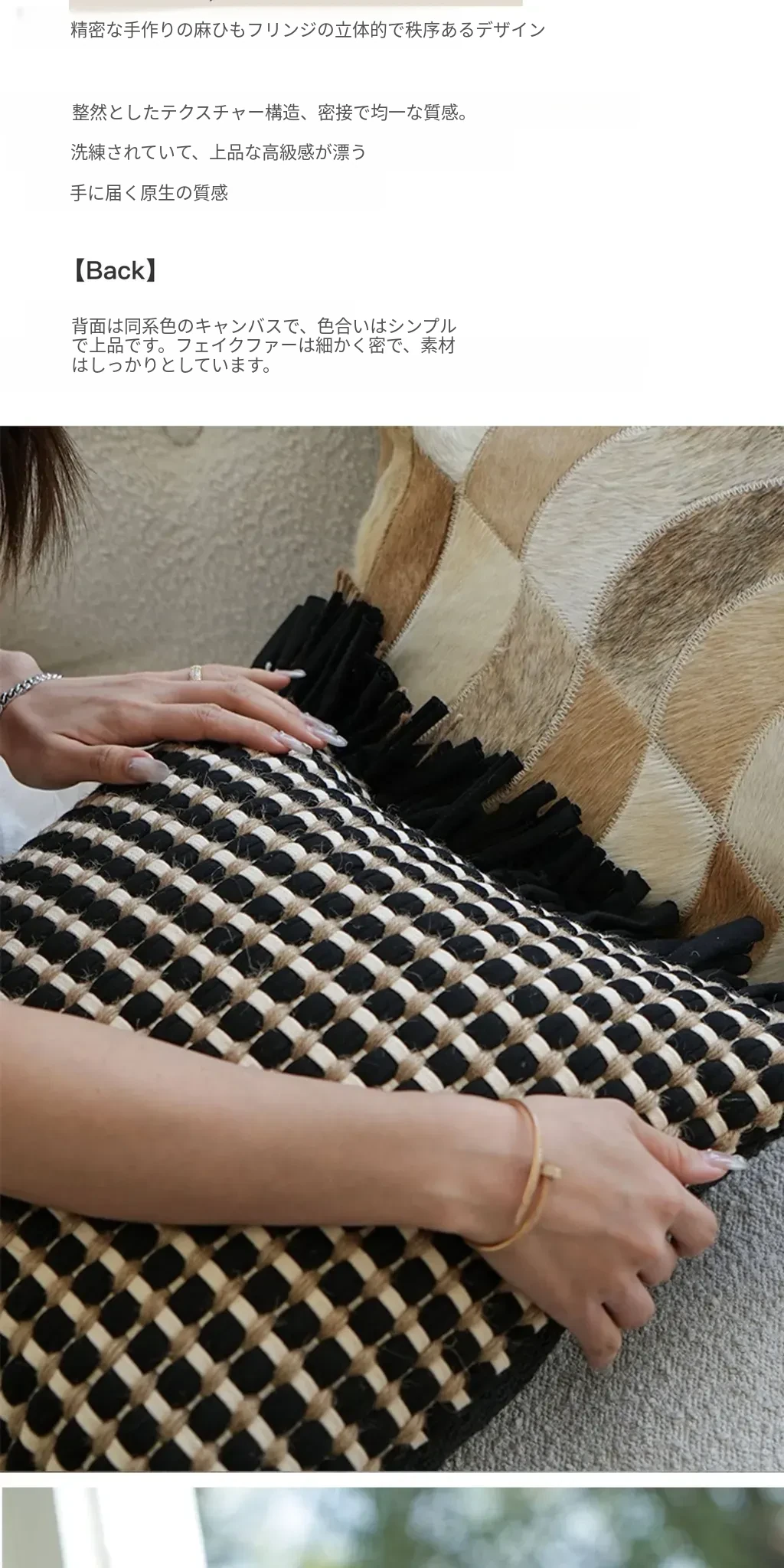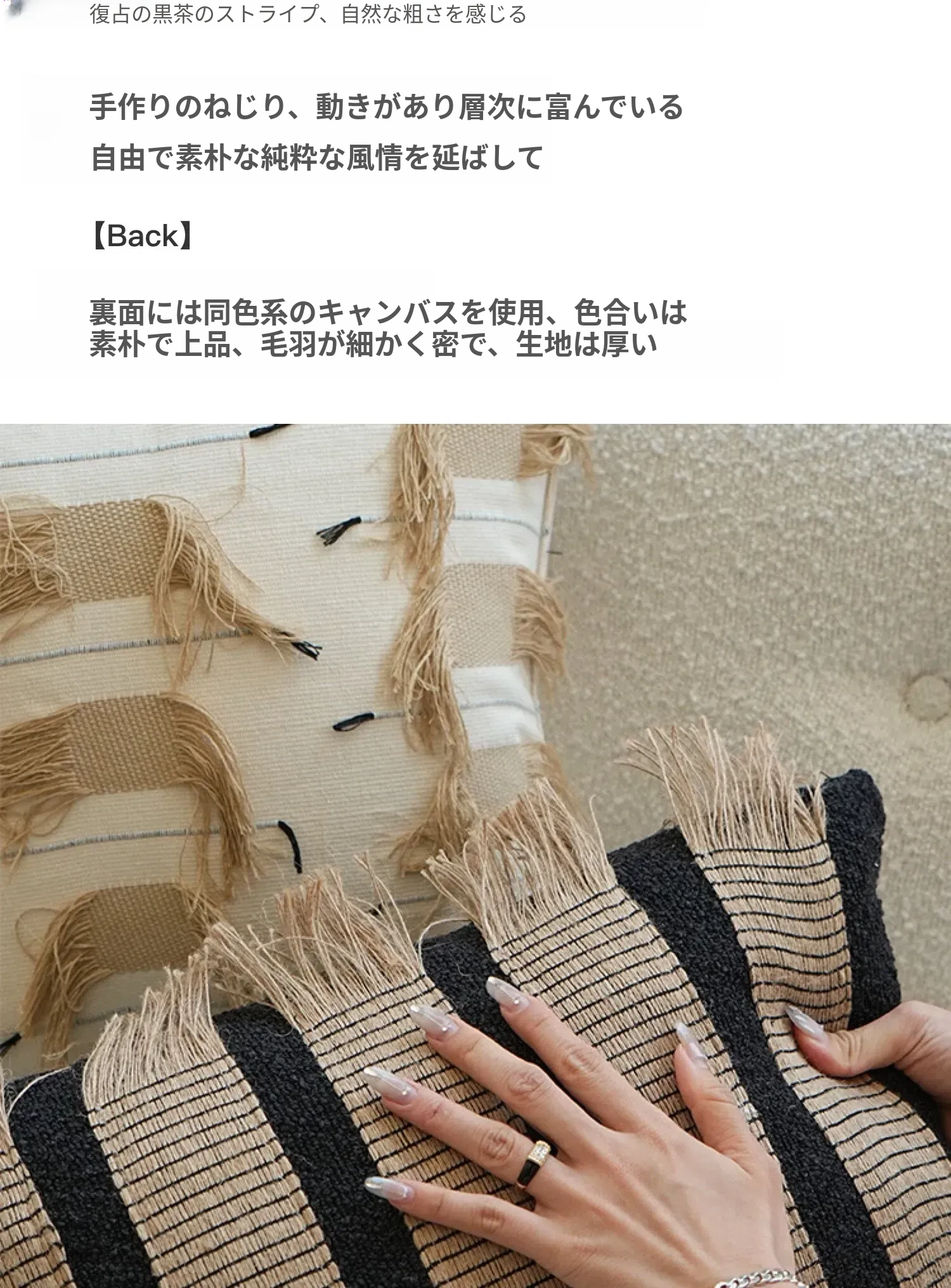 Texdream ブラックブラウン フリンジクッション - 天然コットンリネンの軽やかさで、ラグジュアリーなリビングルームや寝室にぴったりな高級クッション。あなたのインテリアを華やかに彩ります!