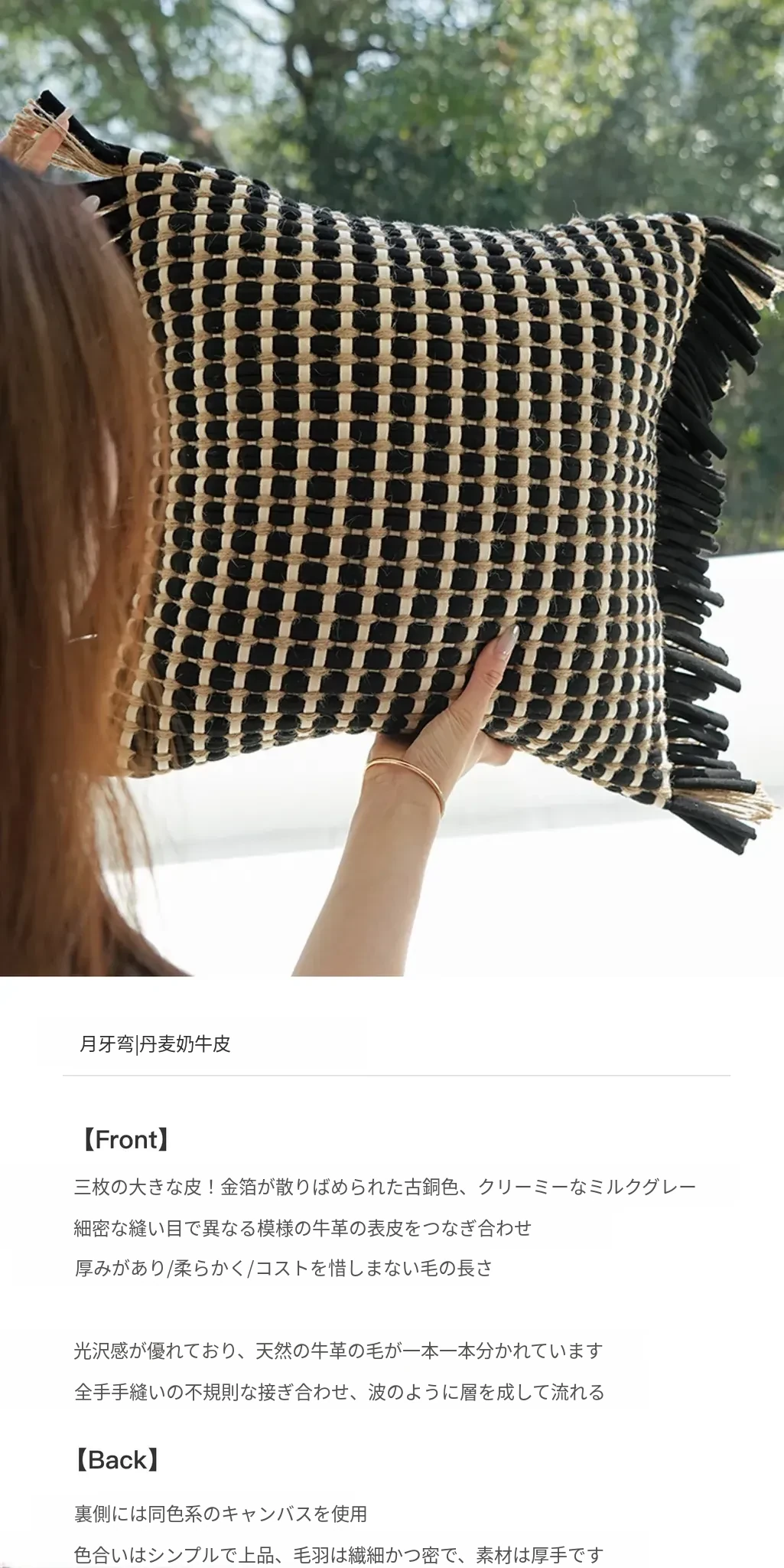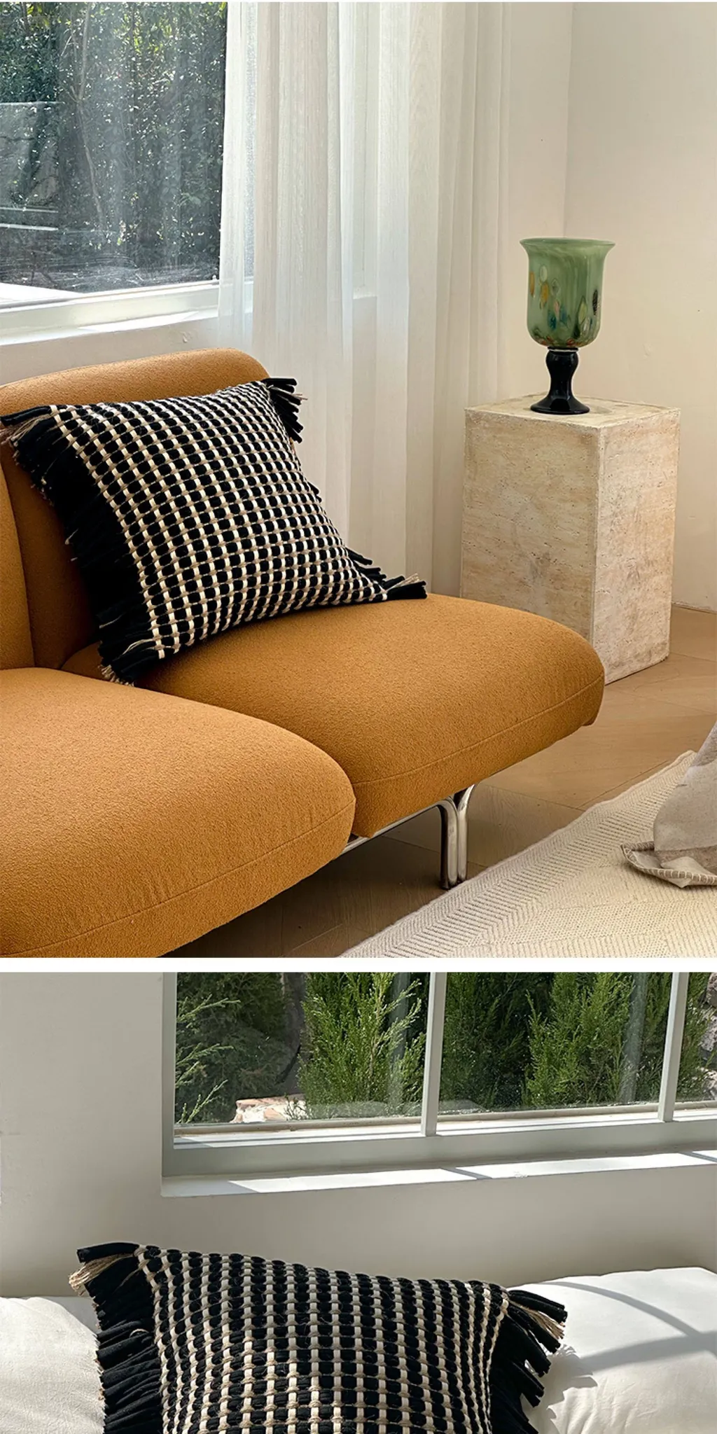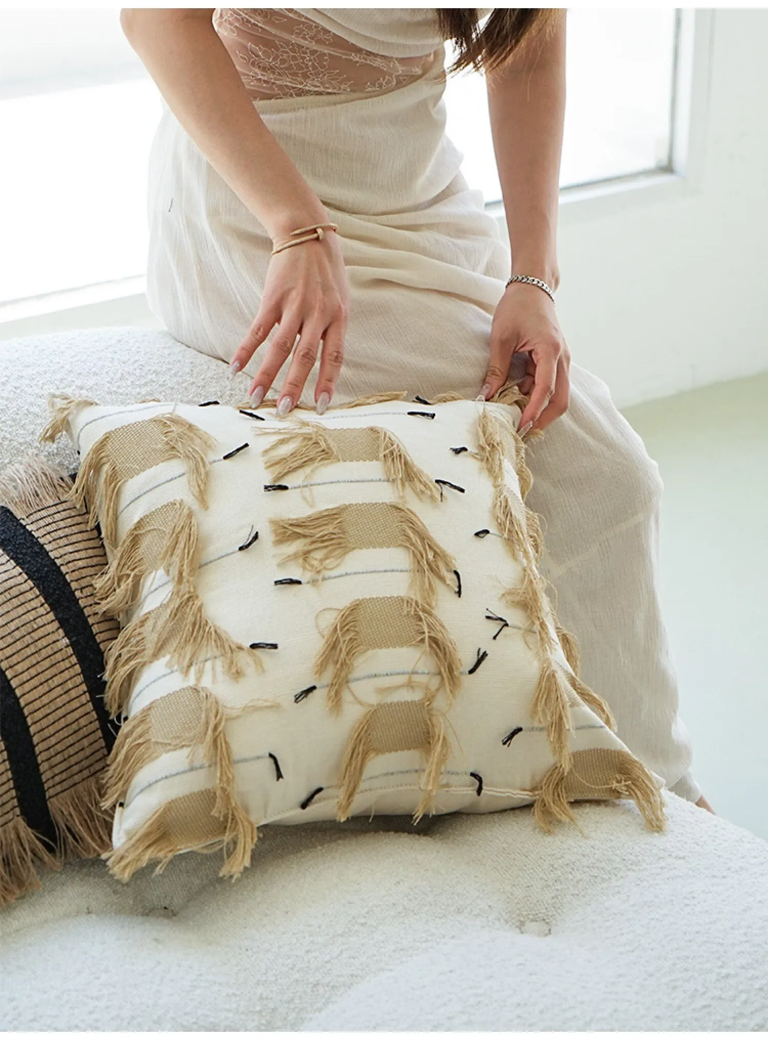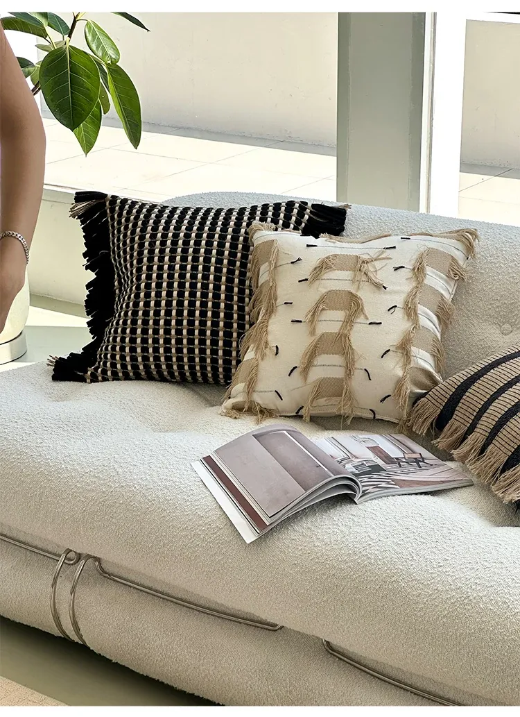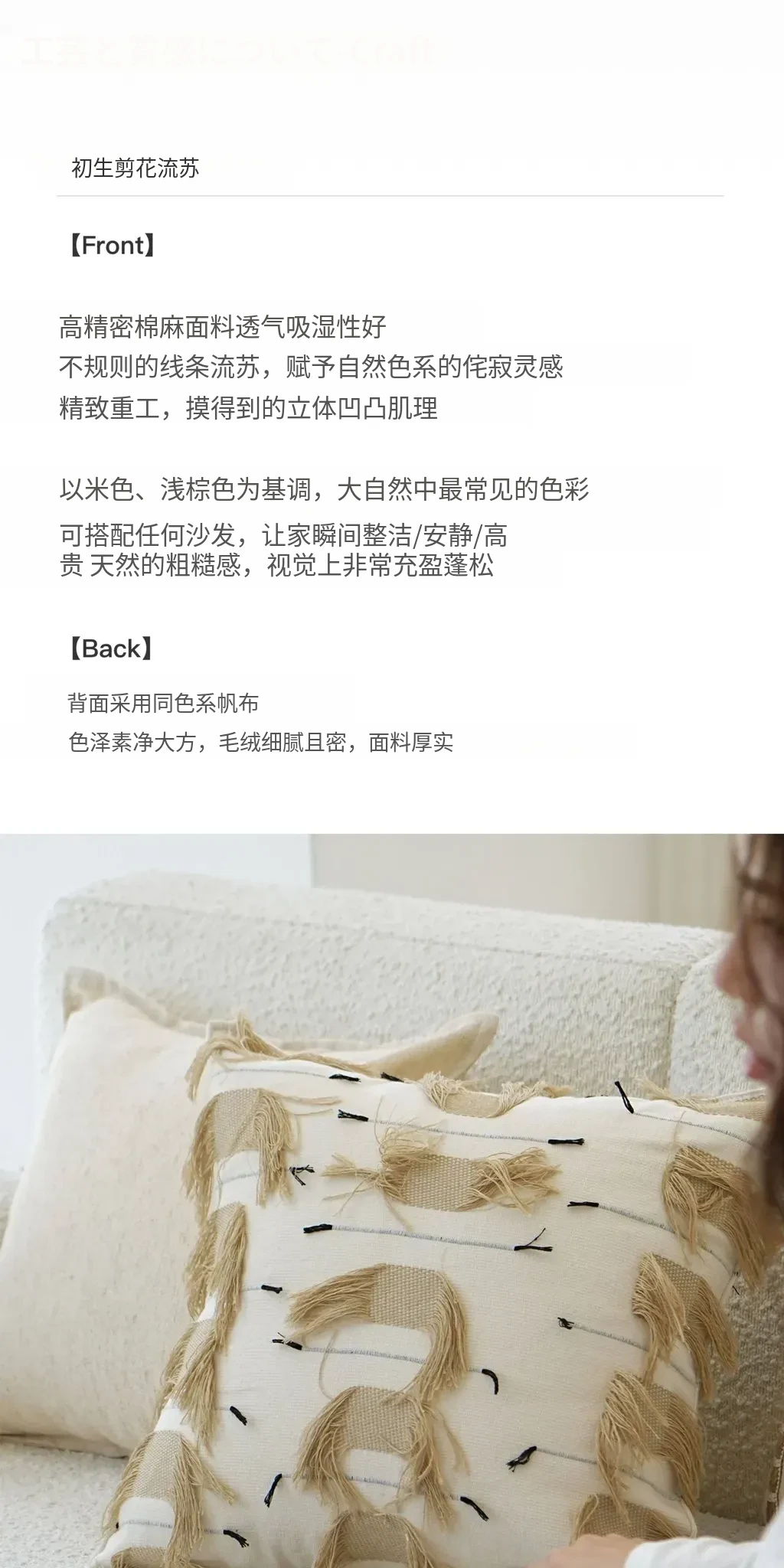Texdream ブラックブラウン フリンジクッション - 天然コットンリネンの軽やかさで、ラグジュアリーなリビングルームや寝室にぴったりな高級クッション。あなたのインテリアを華やかに彩ります!