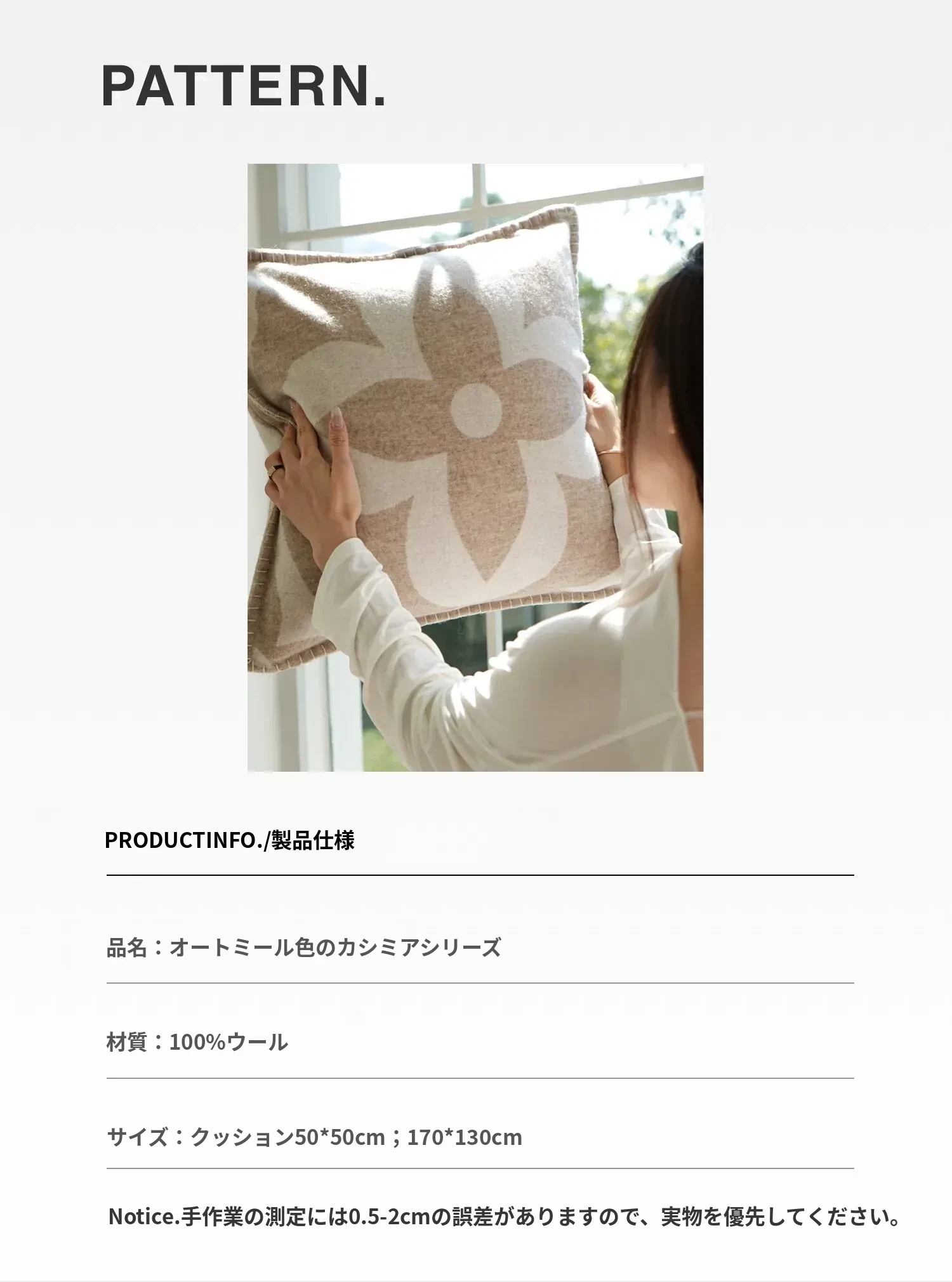 【オートミールカラー | カシミヤクッション】 素材ロットが異なるため、若干の色ムラがあります