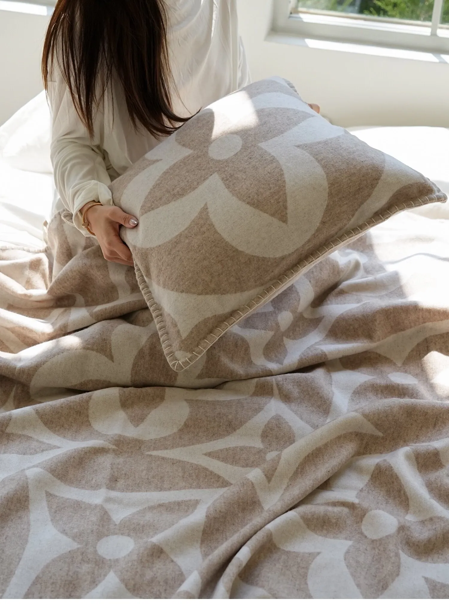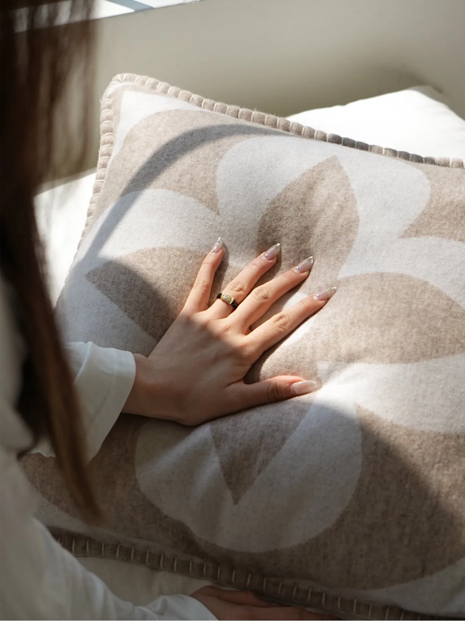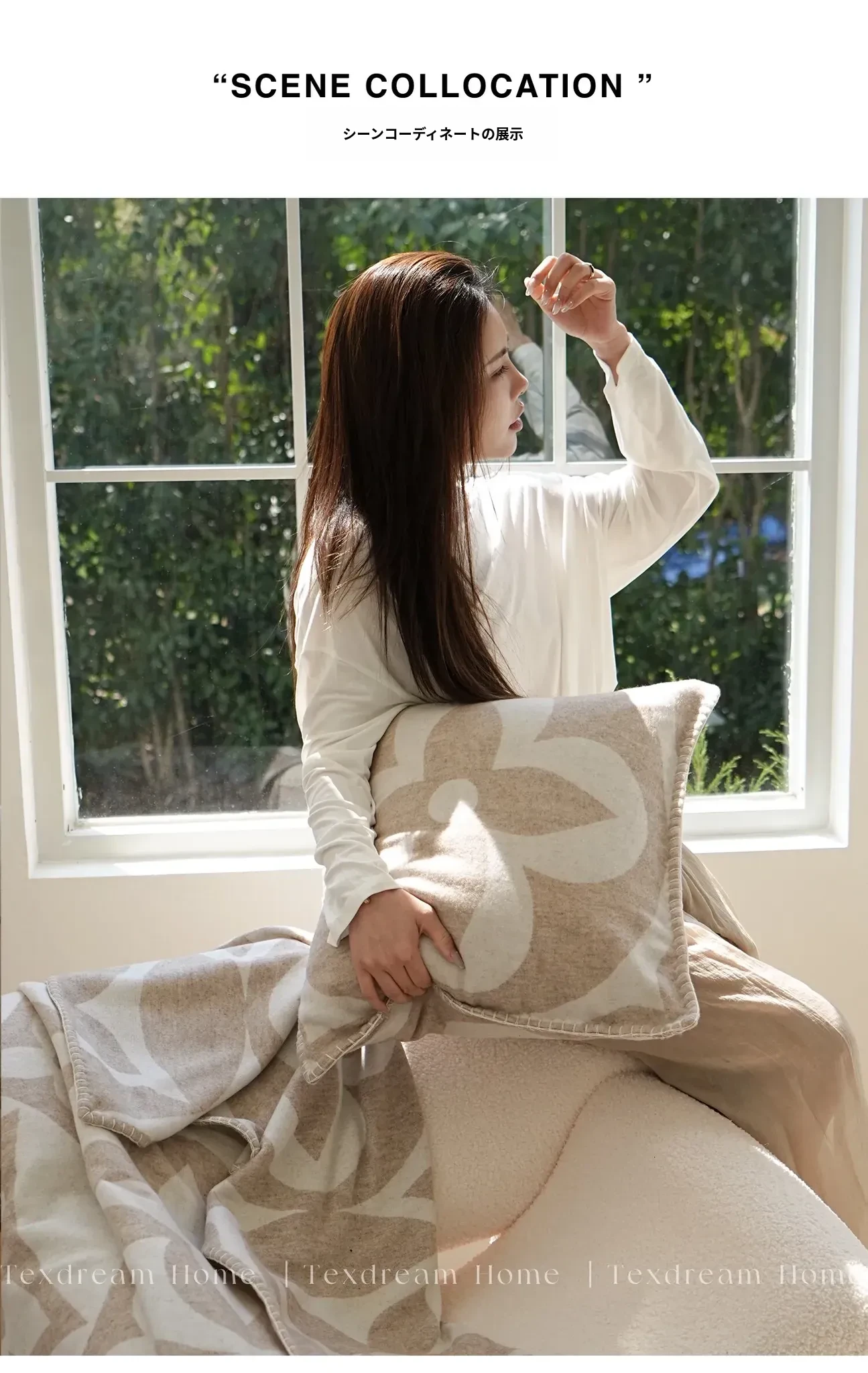 テックスドリームのクールなクローバーデザイン!モダンなライトラグジュアリーのカシミヤクッションとリラックスブランケット。リビングルームやソファ、ベッドサイドにぴったりのスタイリッシュなアイテムです。