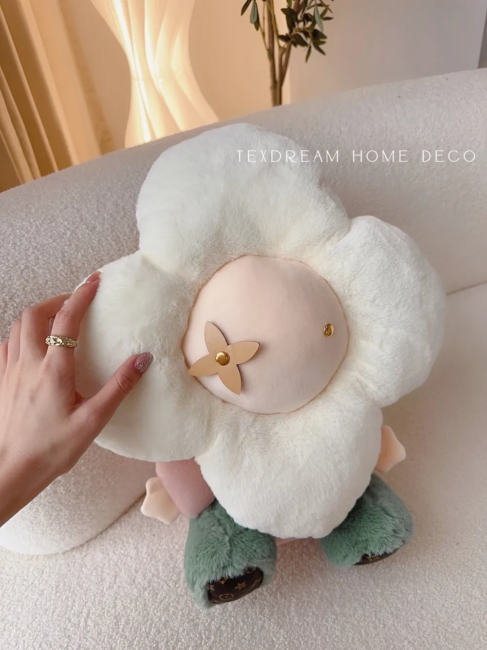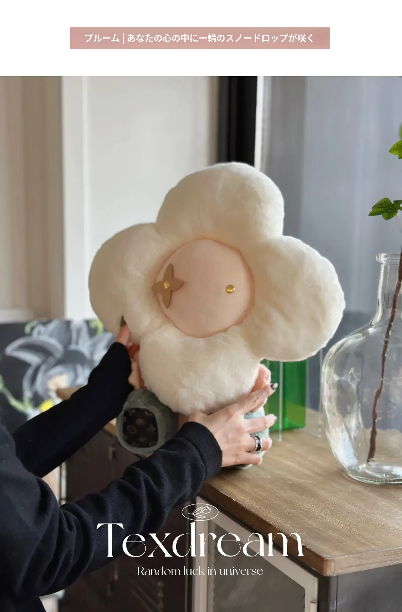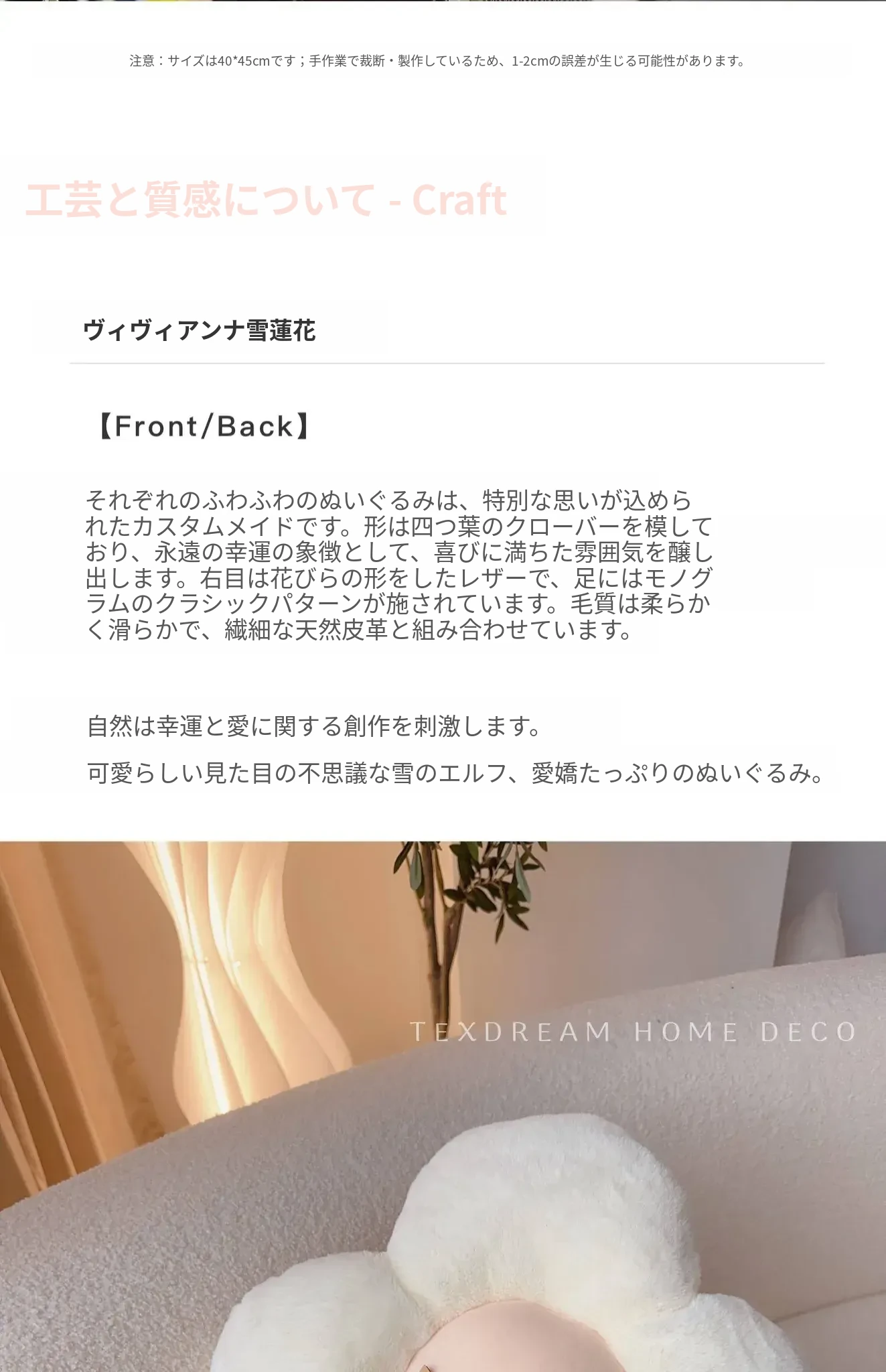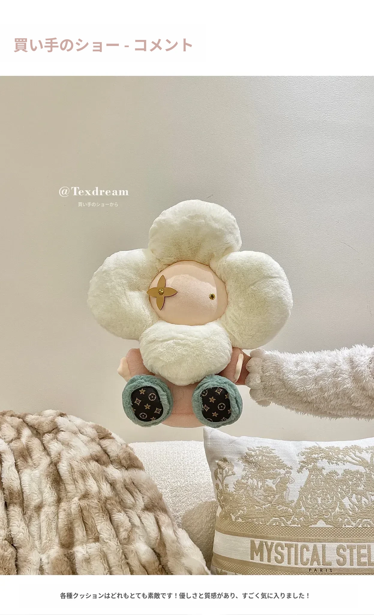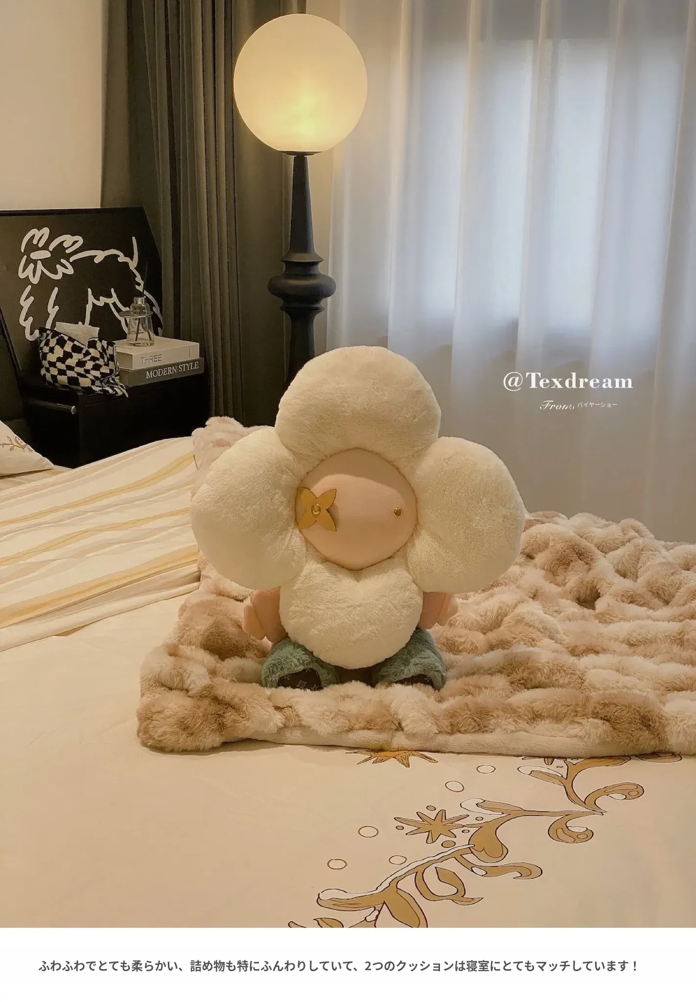 テックスドリームの雪の花クッション、かわいいカートゥーンデザインのふわふわラウンドぬいぐるみ!おしゃれなソファやリビングにぴったり!昼寝やリラックスタイムに最適な抱き枕です。