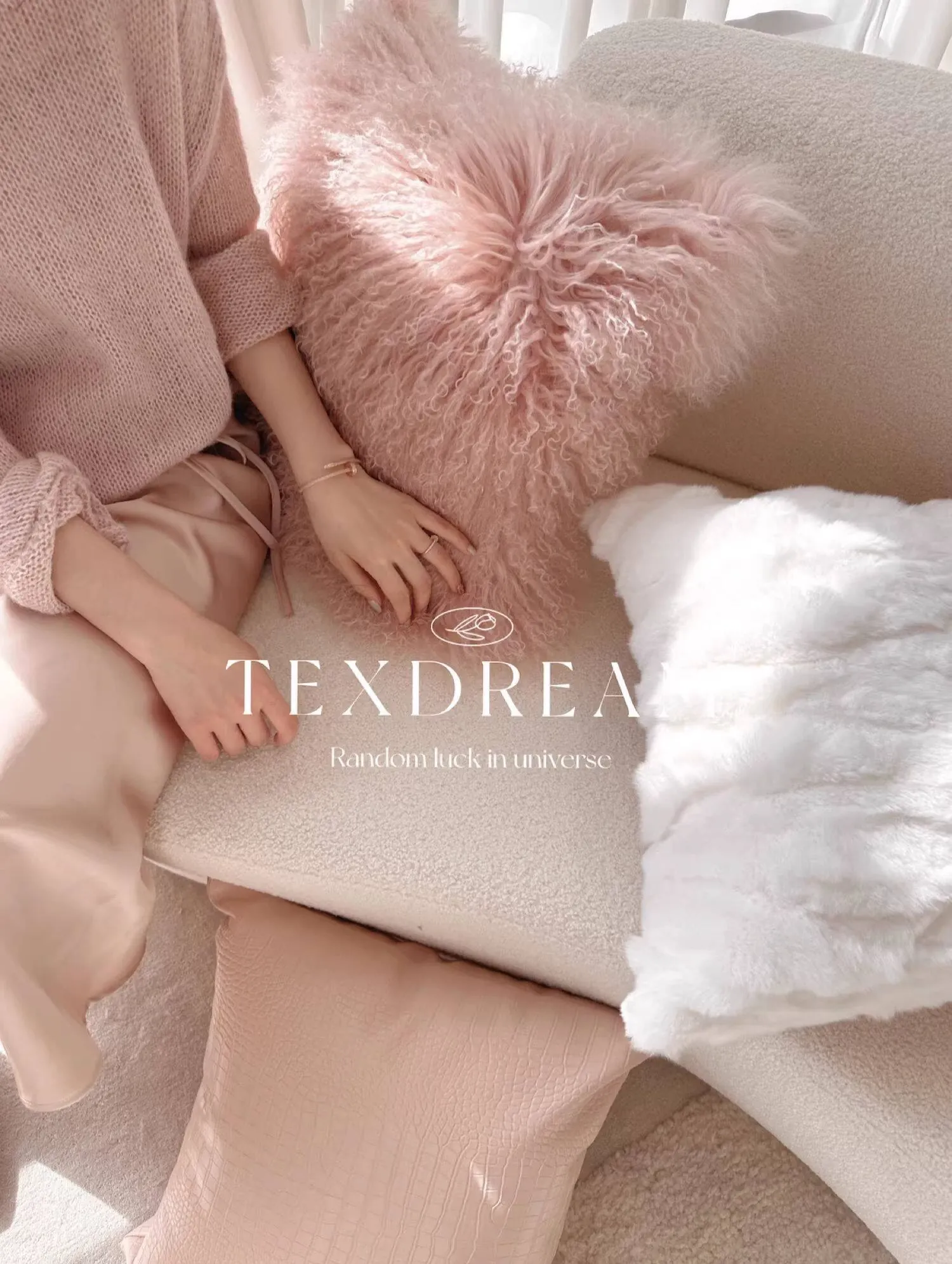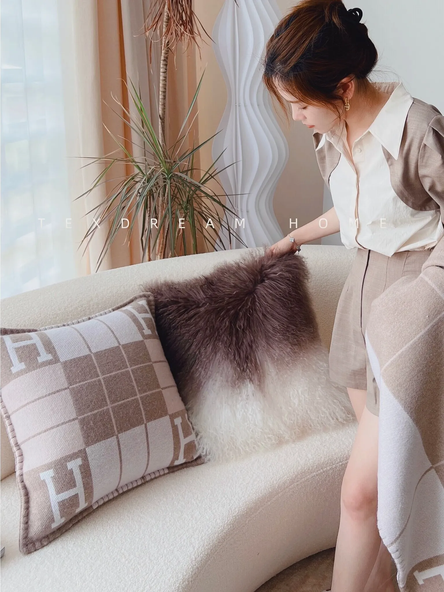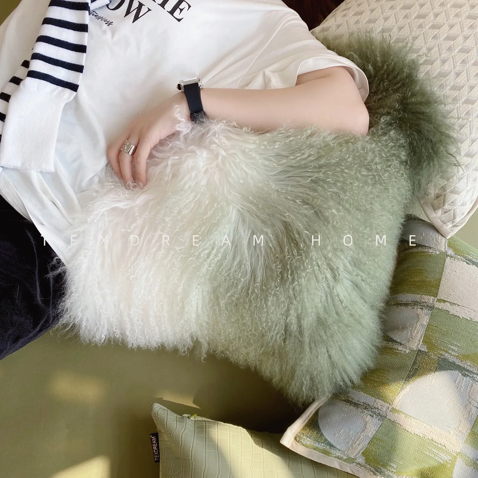 Texdreamのスタイル 羊毛レザー製クッションカバー|インテリアにぴったりのラグジュアリー感!高級感あふれるサンプルルームやソファ、ベッドヘッドに最適なアイテムです。