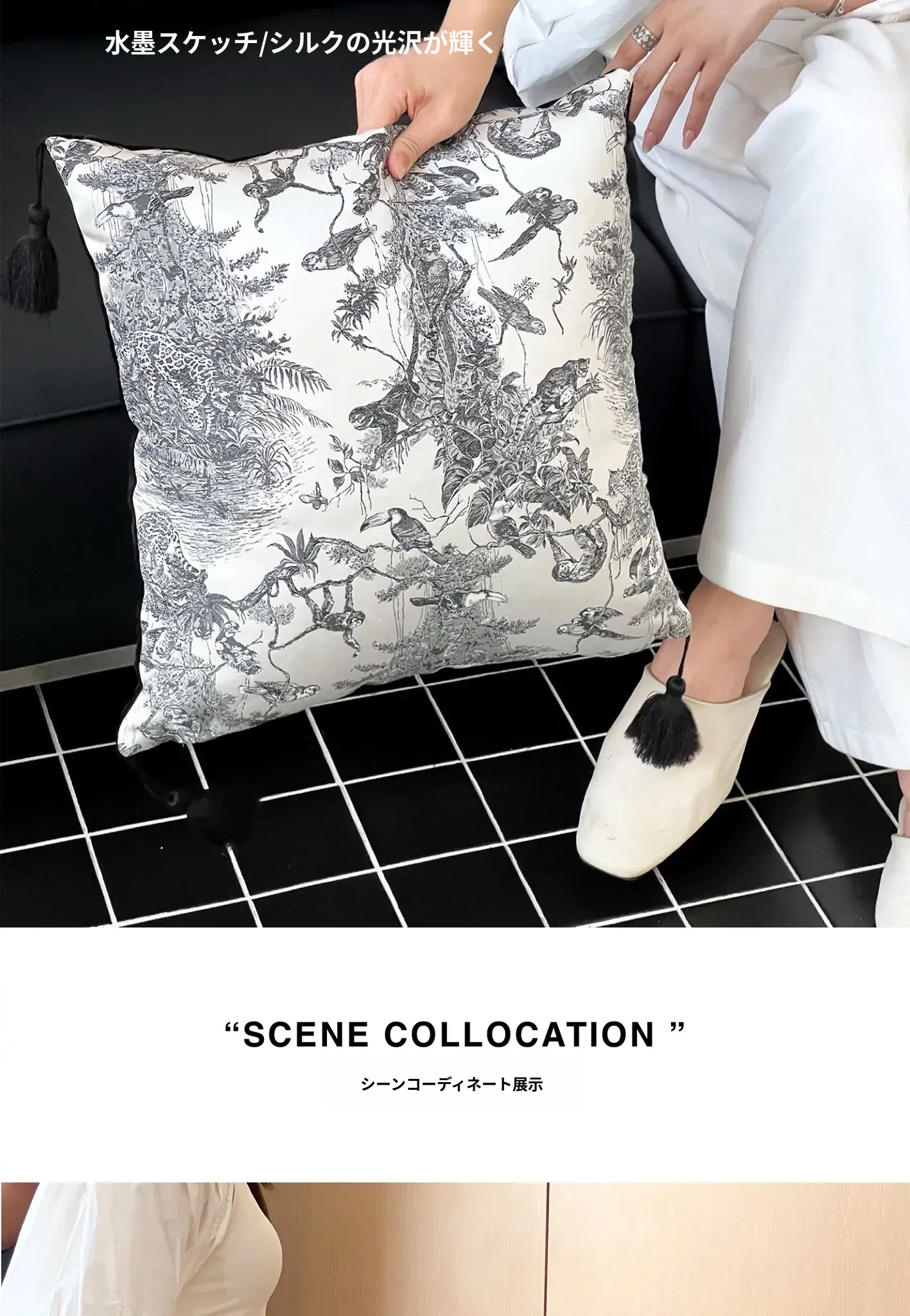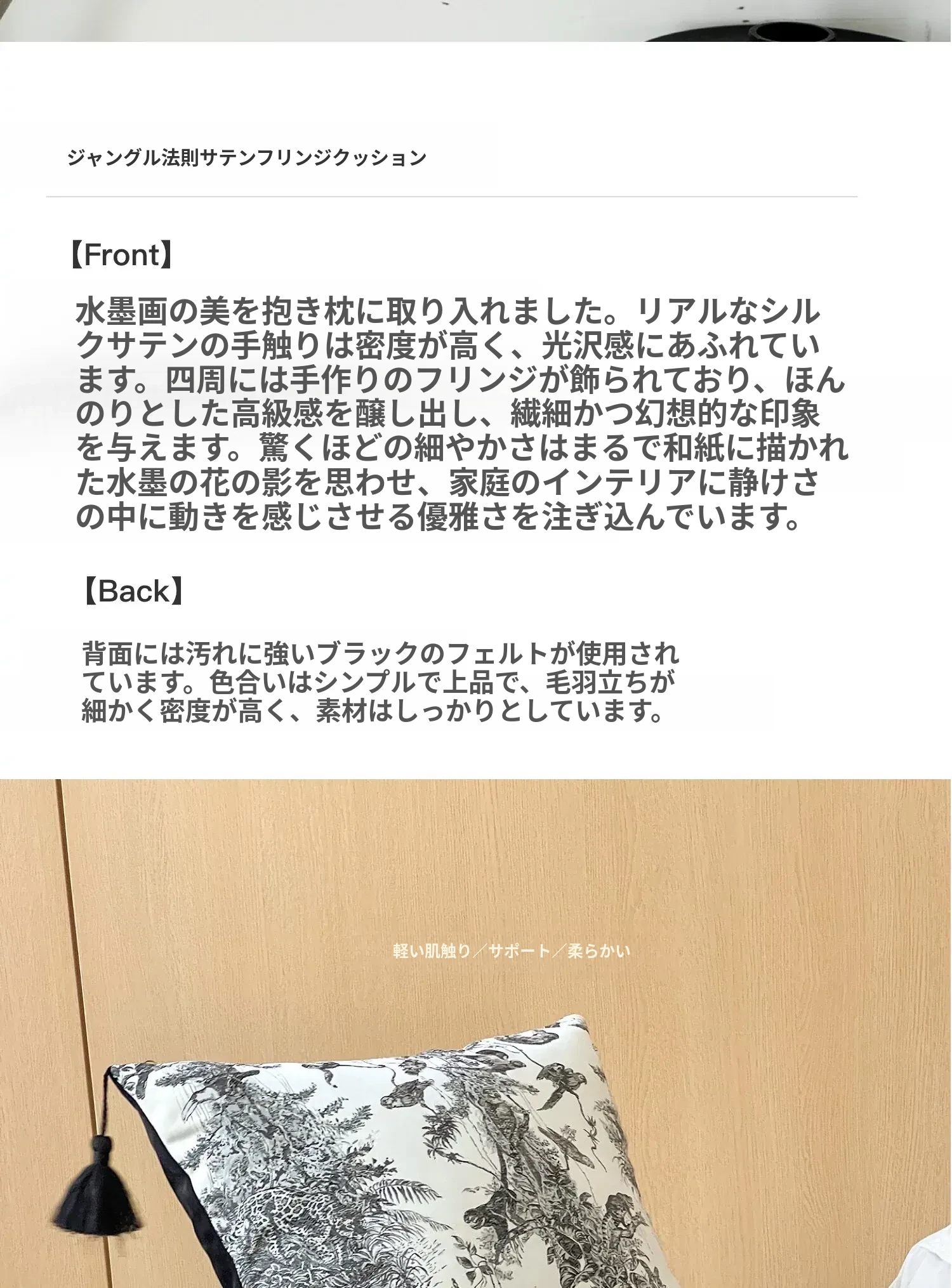 水墨流れるフリンジサテンカバークッション | ブラック