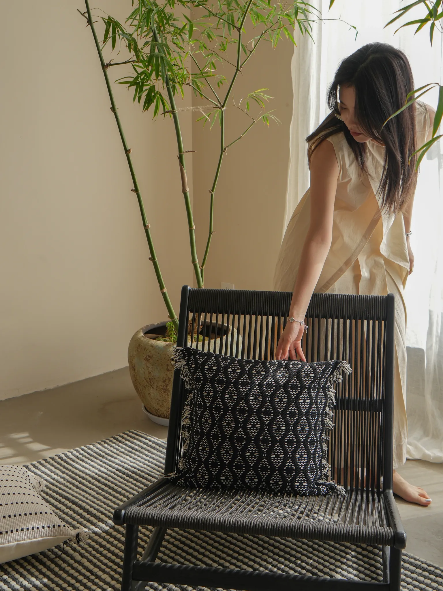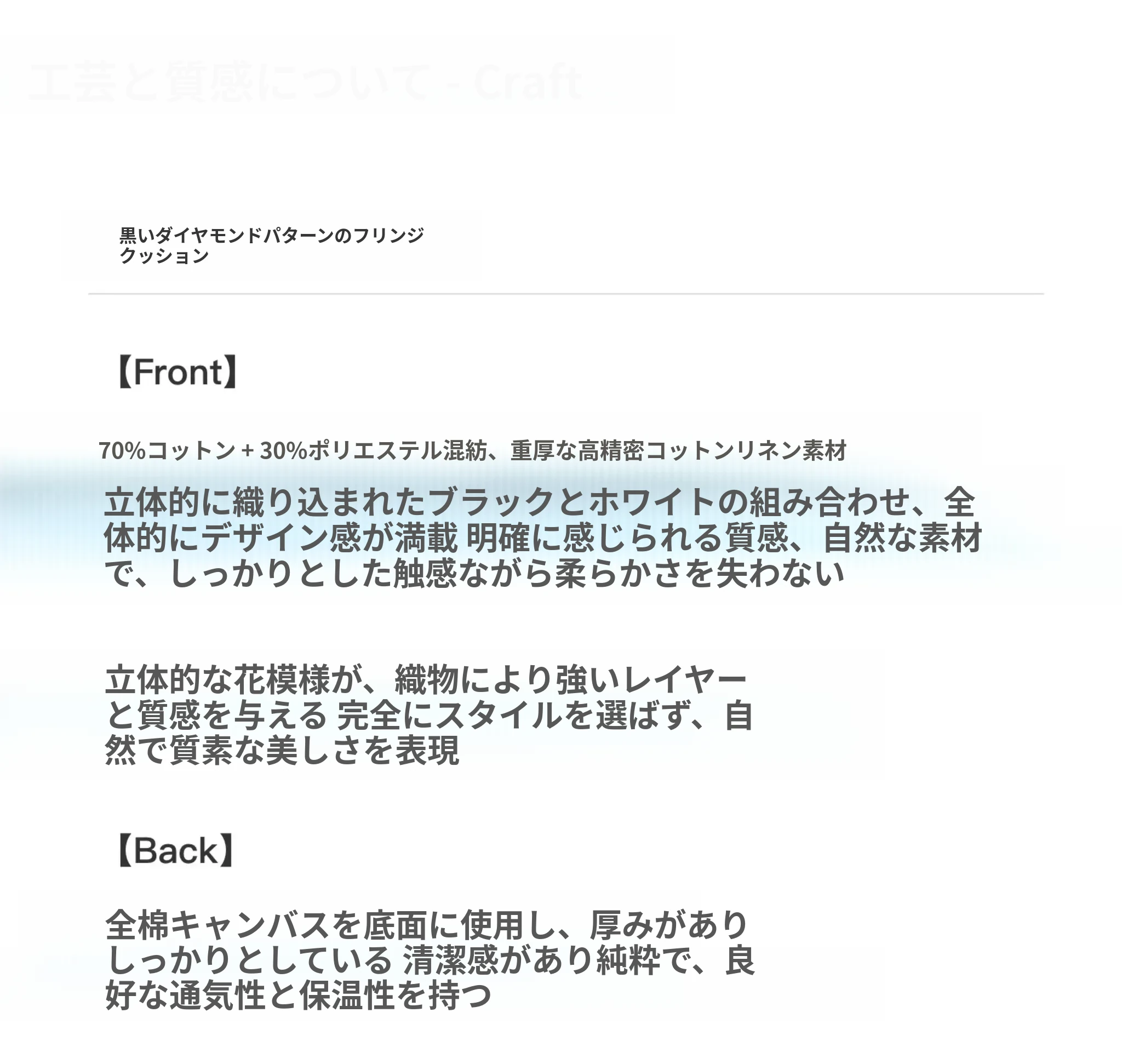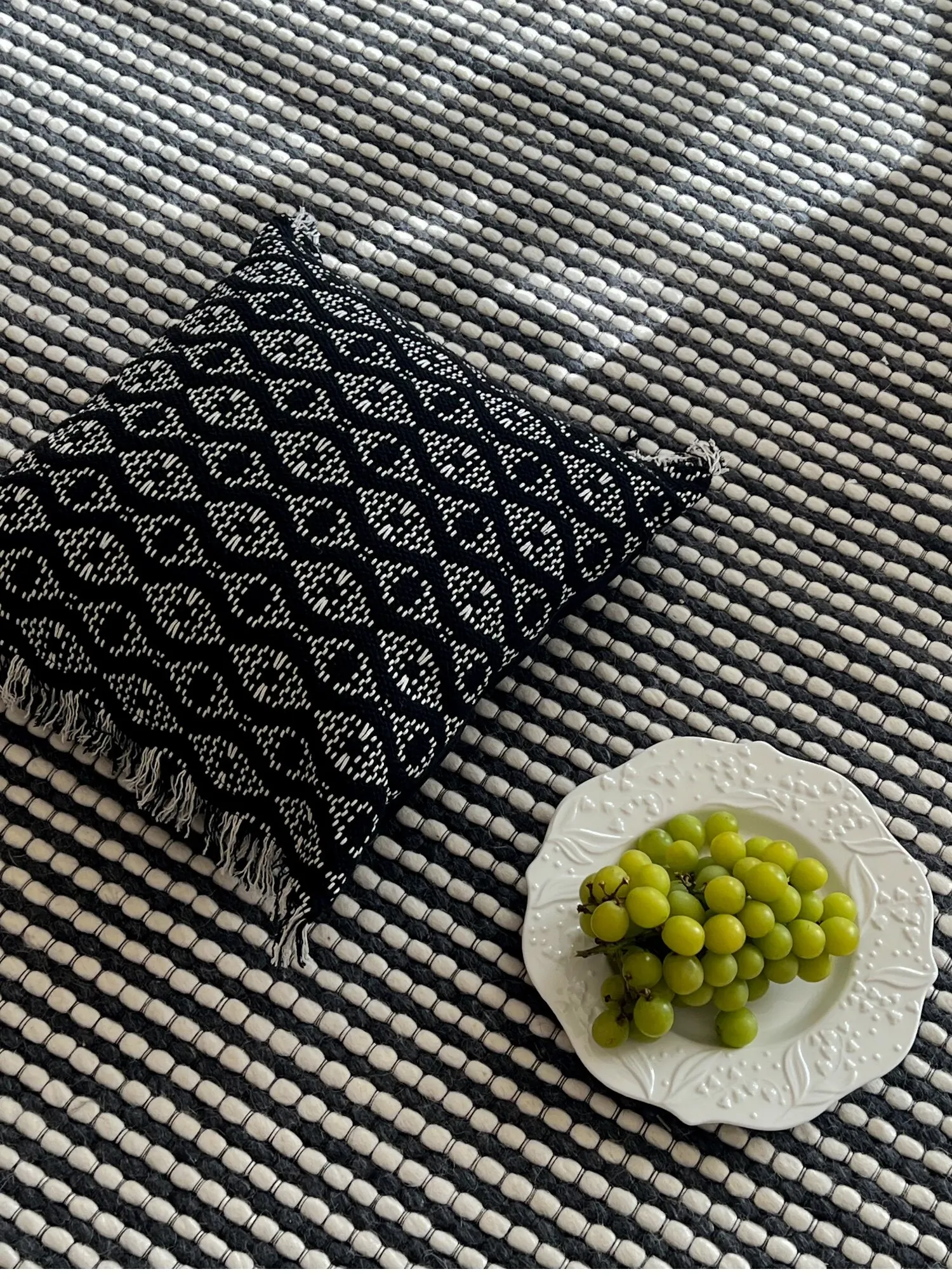 【黒いダイヤモンド模様のタッセルクッション】