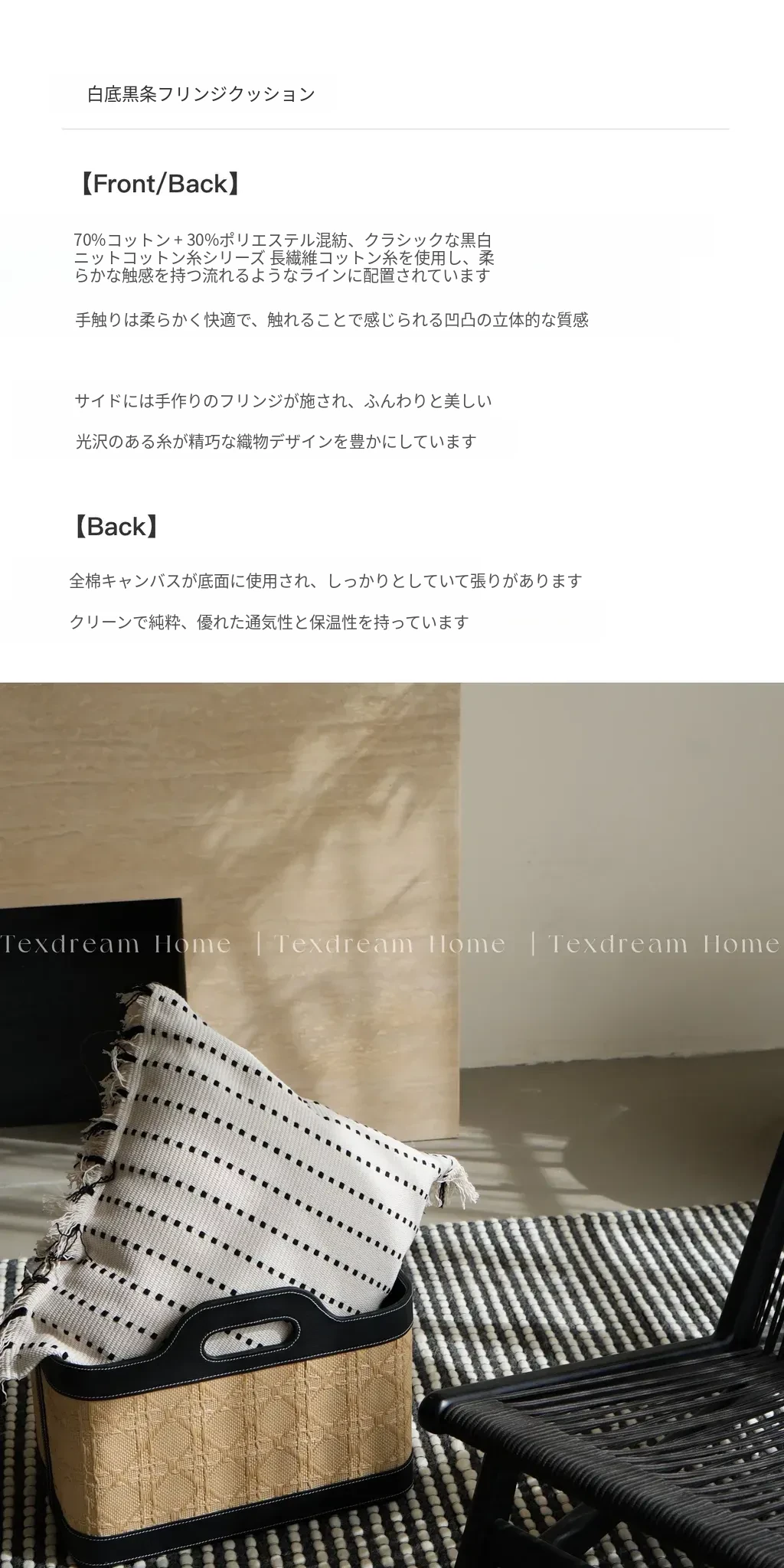 【白地に黒ストライプのタッセルクッション】