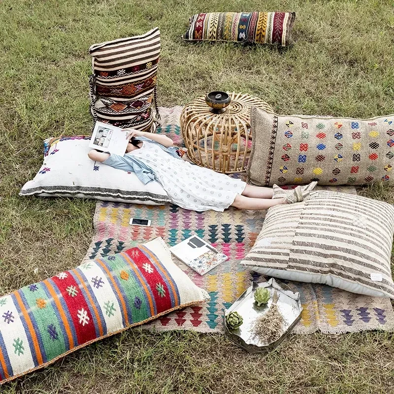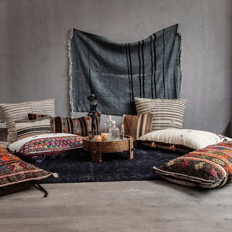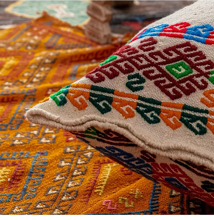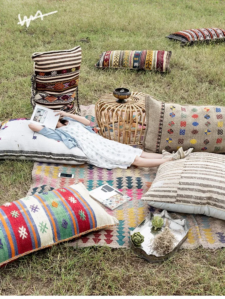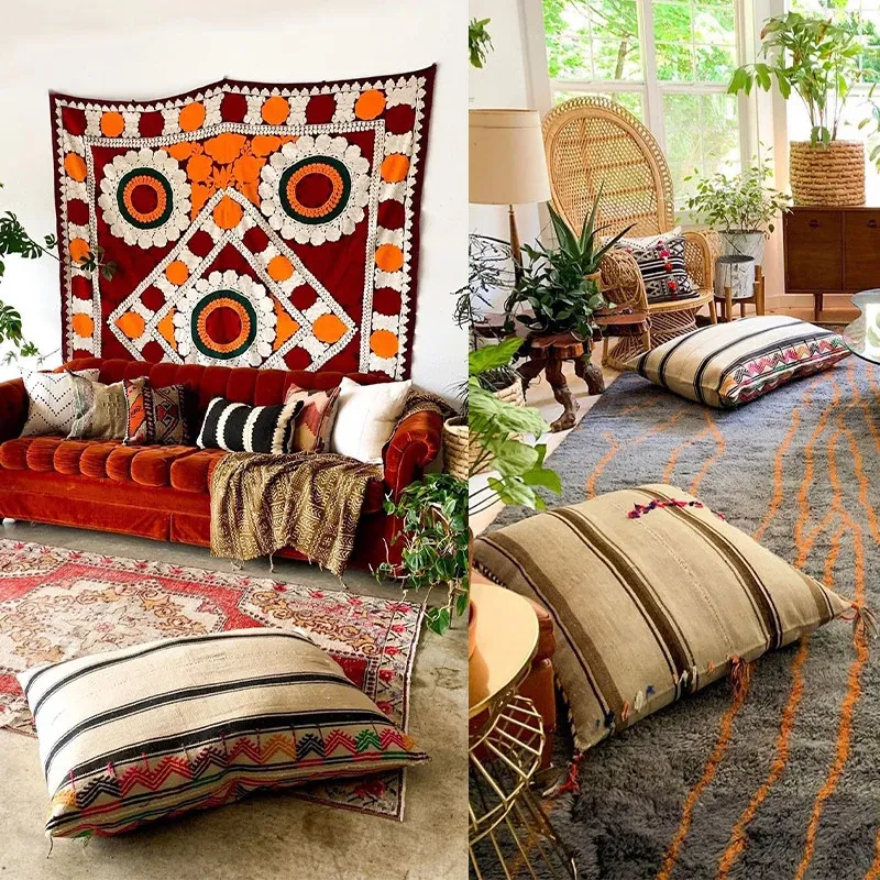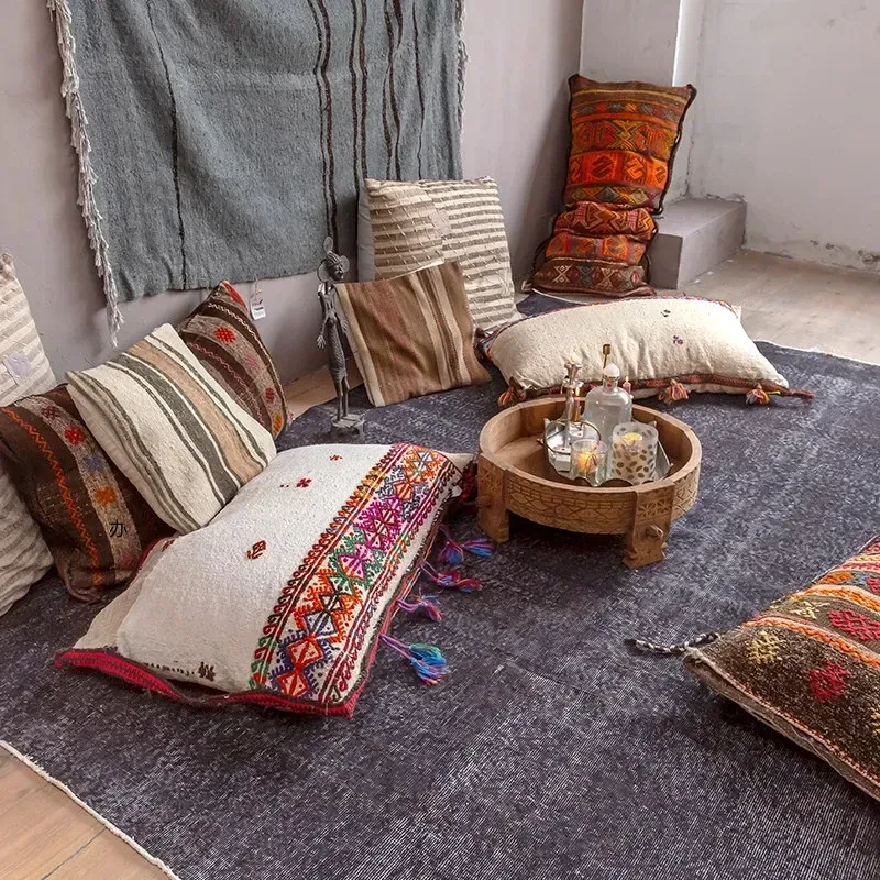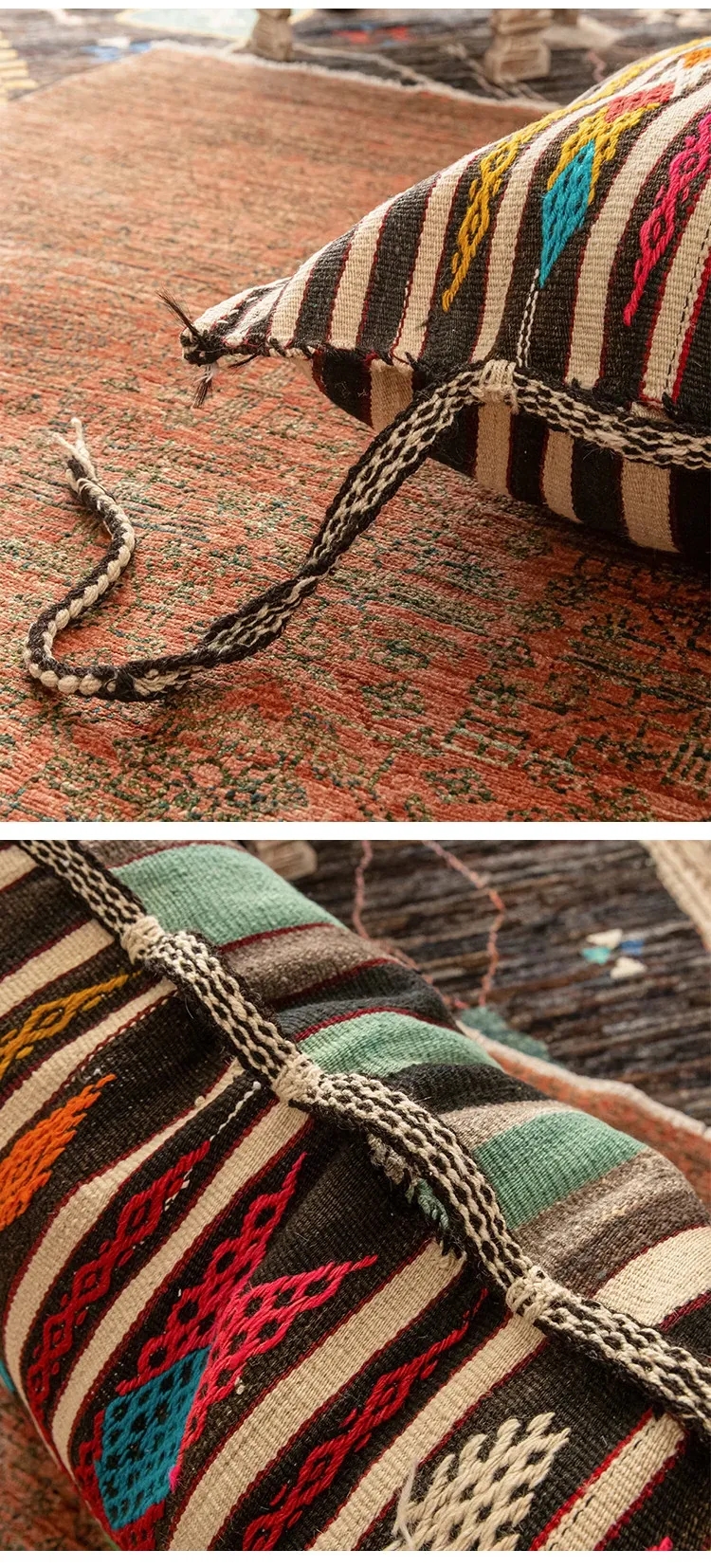 トルコ直輸入の手作りウールビッグクッション!タタミスタイルの民宿にぴったりな、魅力的なデザインのクッションマット&壁掛け装飾。居心地の良い空間を演出し、視覚と味覚を楽しむアイテムです!