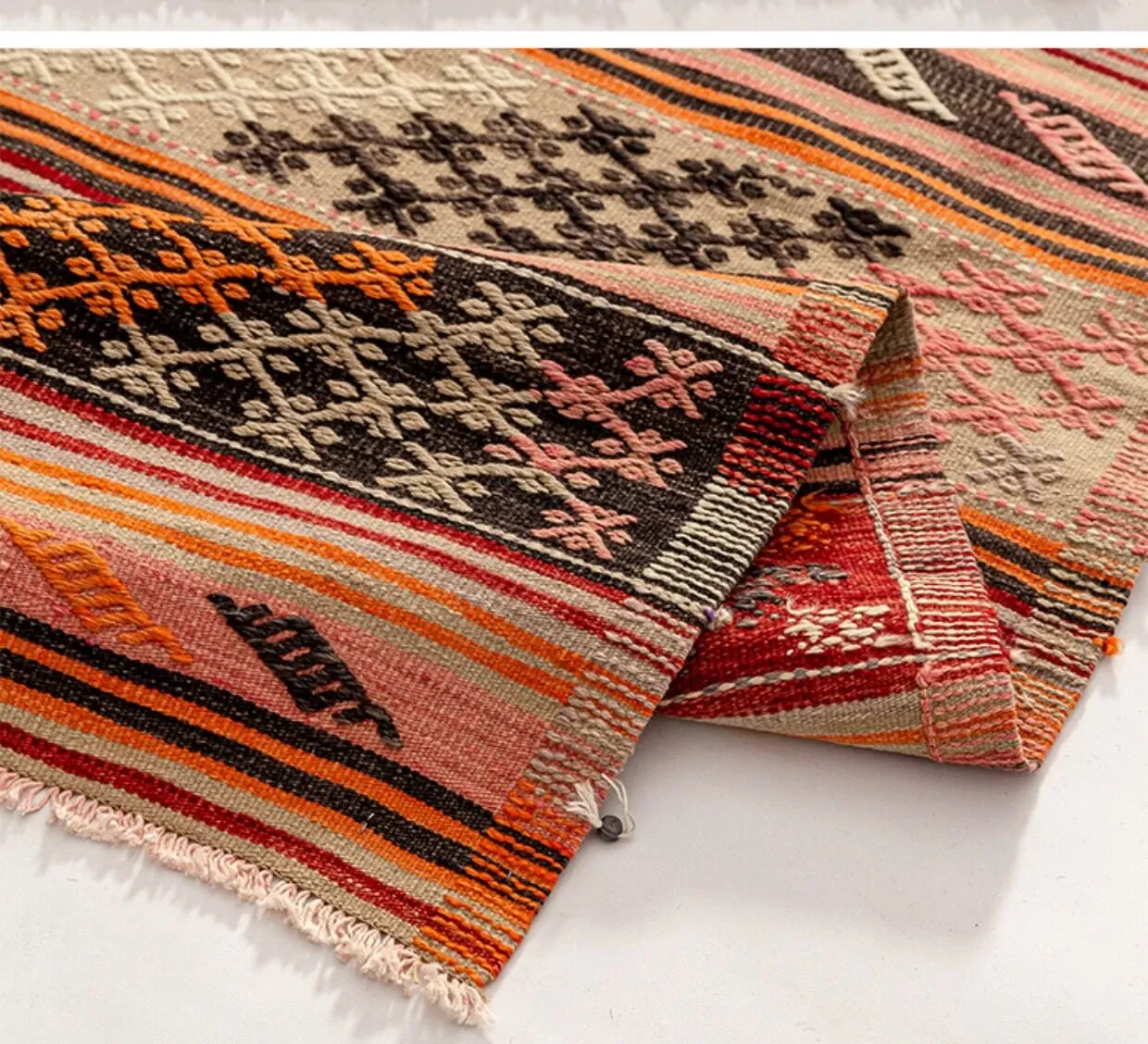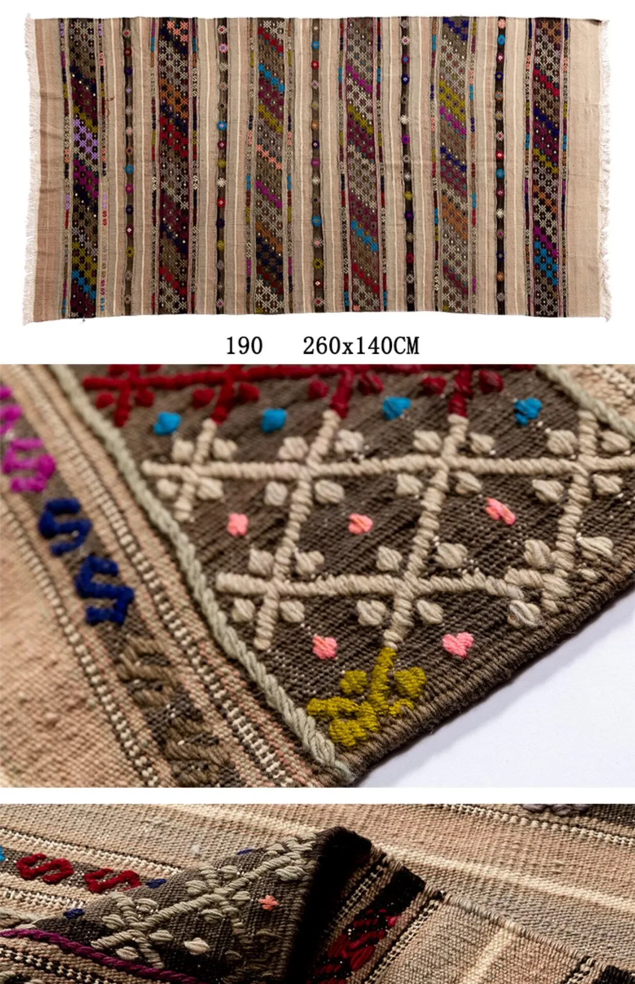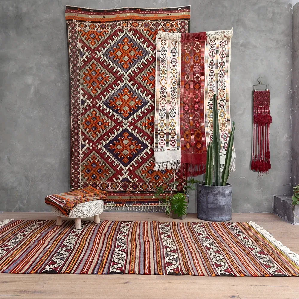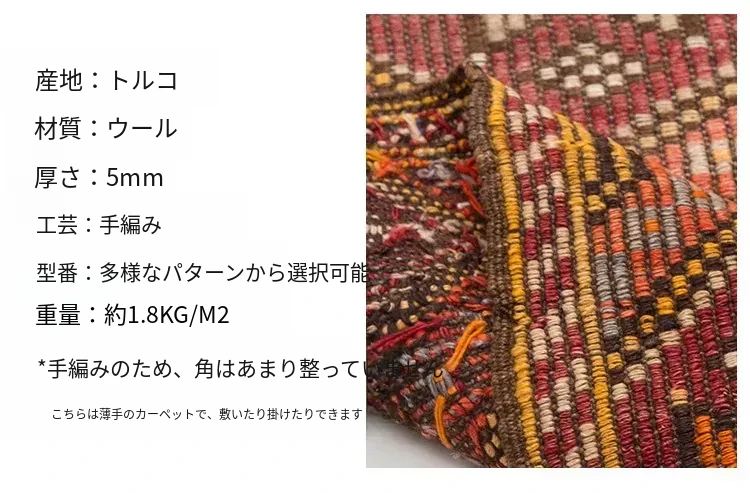 トルコ直輸入の手織りウールラグ、民族風とアメリカンスタイルの絶妙なミックス。リビングルームのアクセントに最適なビジュアルと風味を楽しめるコレクションマット。