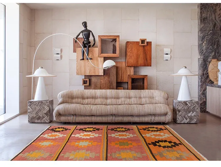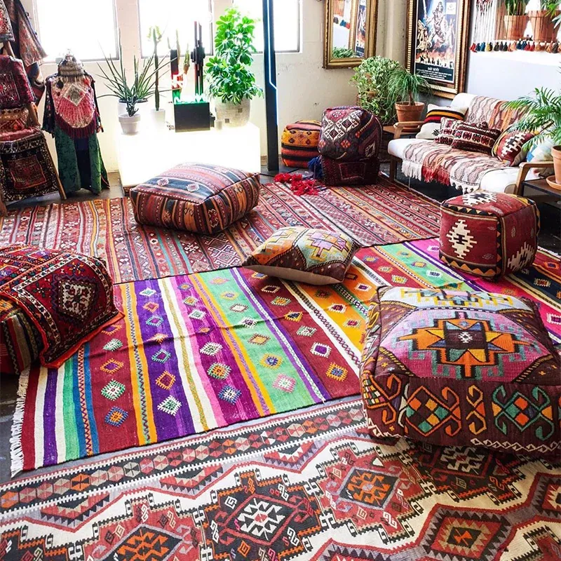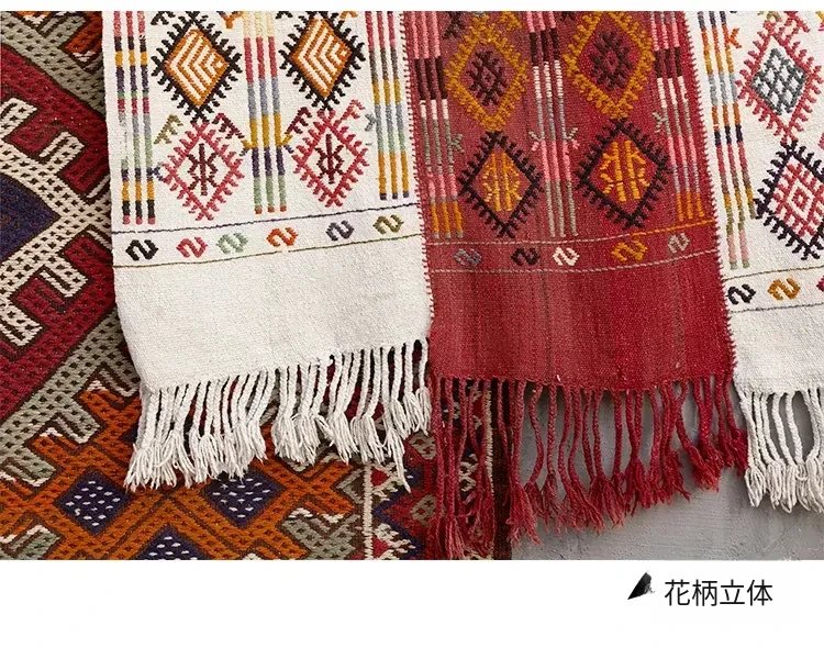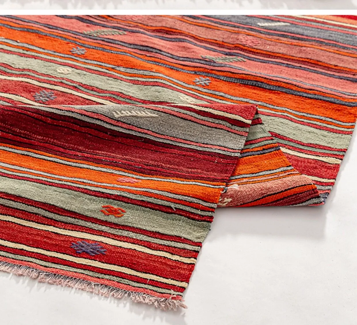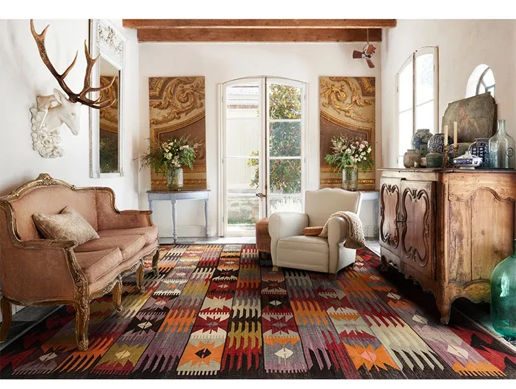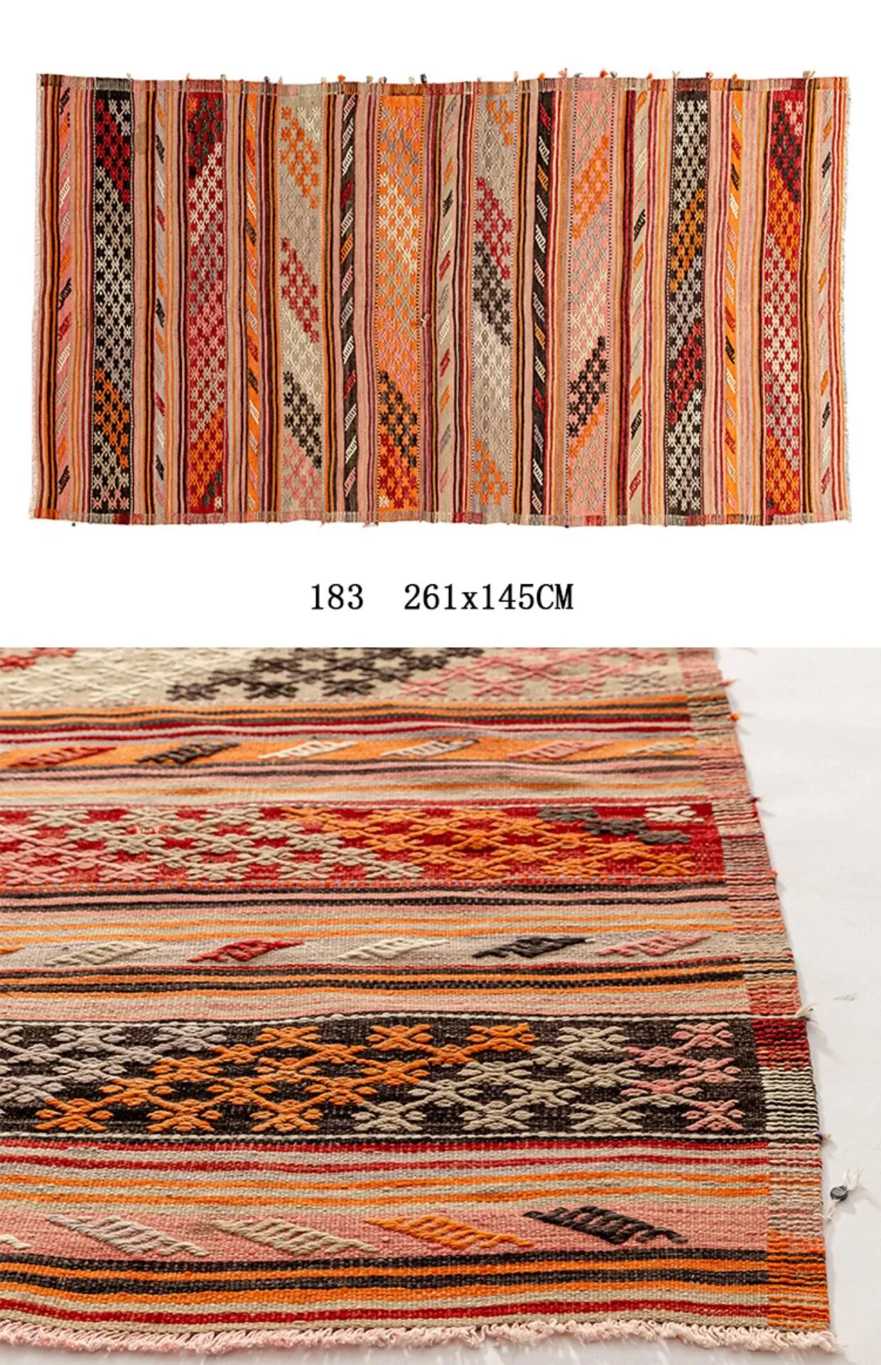 トルコ直輸入の手織りウールラグ、民族風とアメリカンスタイルの絶妙なミックス。リビングルームのアクセントに最適なビジュアルと風味を楽しめるコレクションマット。