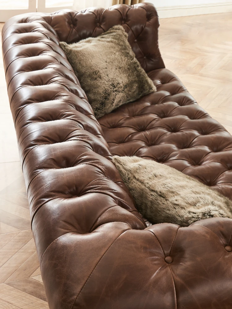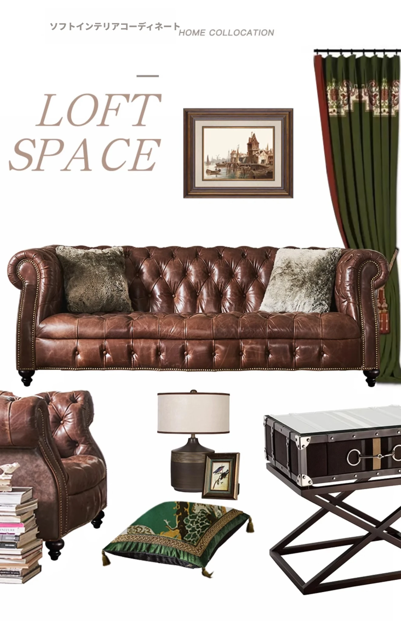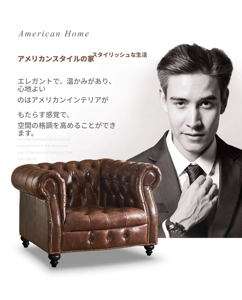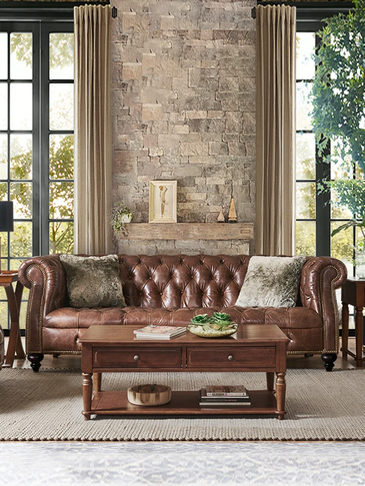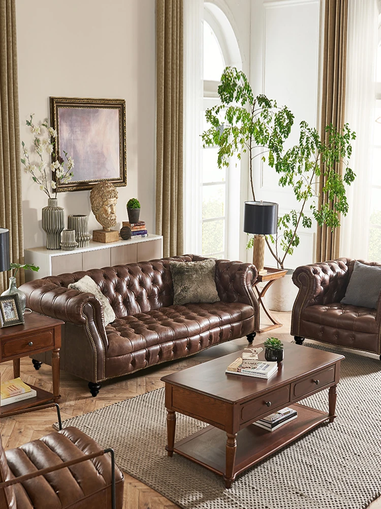 意舍のヴィンテージ風アメリカンソファ!本革U字型コンビネーション、レトロなデザイン、オイルワックス仕上げの最高級牛革使用。リビングにぴったりのスタイリッシュな一品で、快適さと高級感を両立!