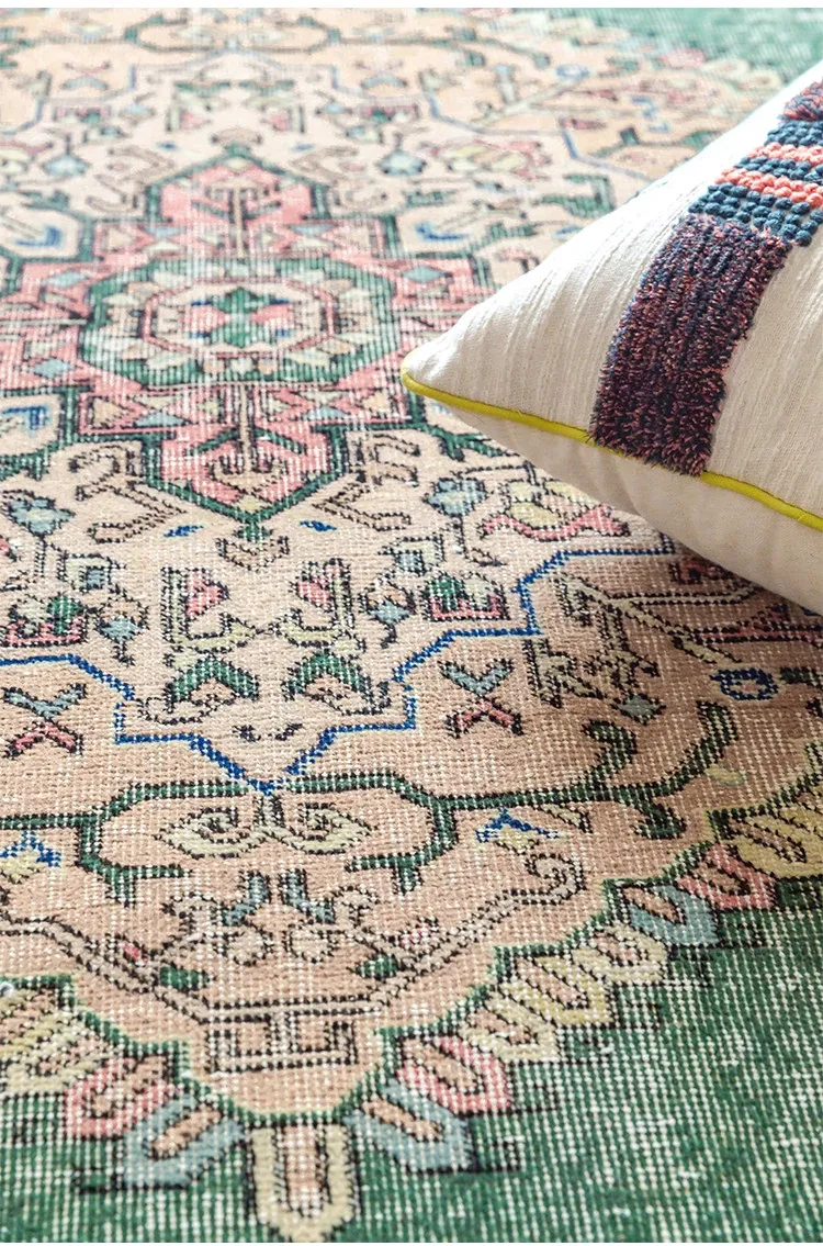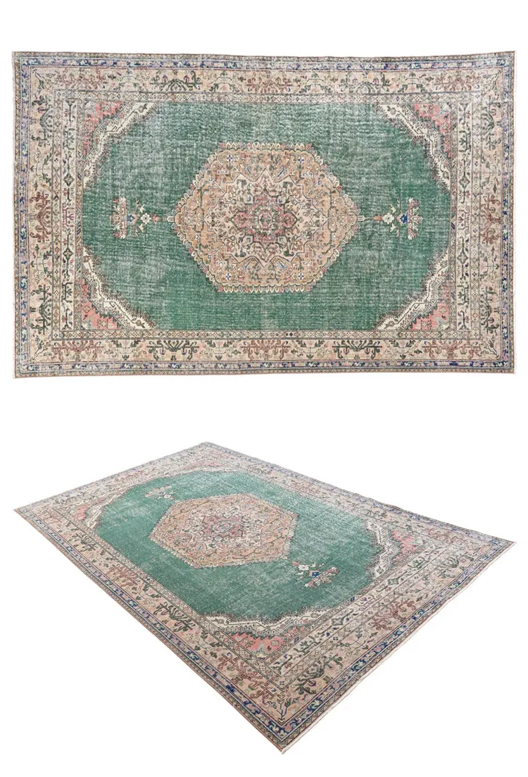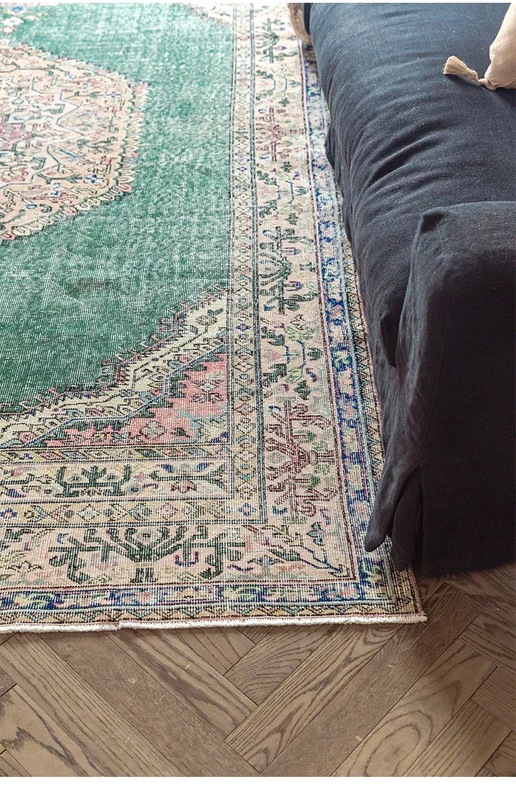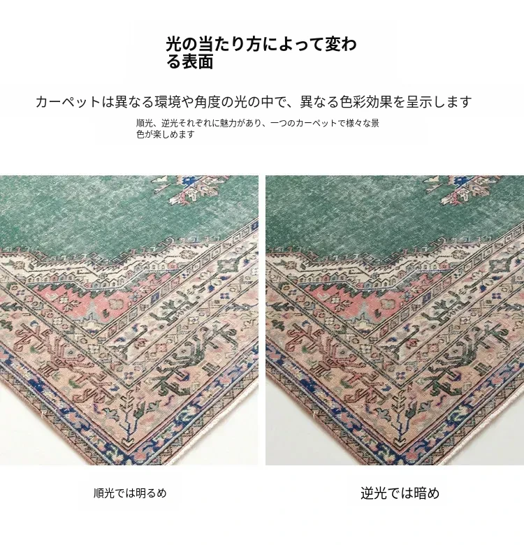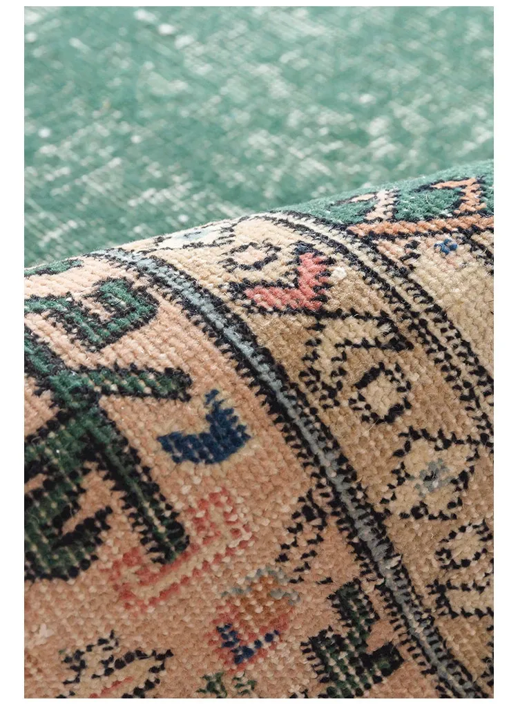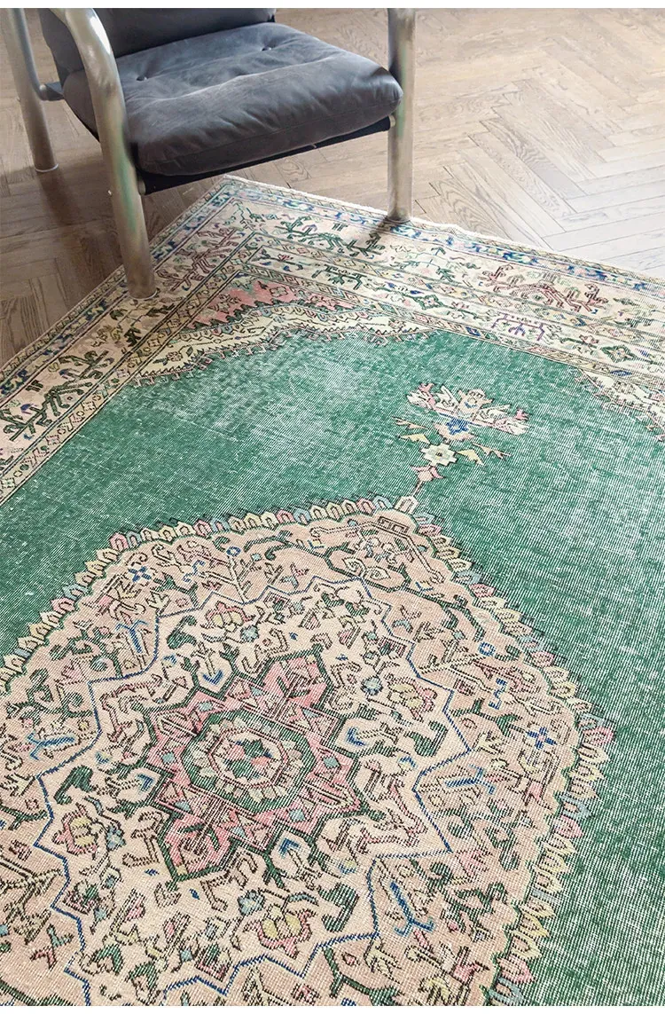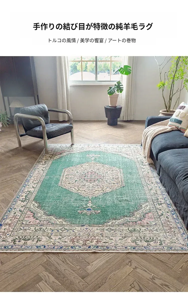 視覚と味覚の融合!トルコ直輸入のハンドメイドウールラグ - ヴィンテージ感あふれる高品質な結び目で、あなたのリビングを華やかに演出します。