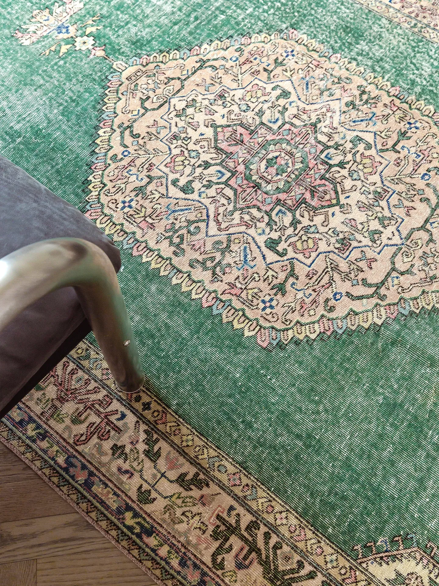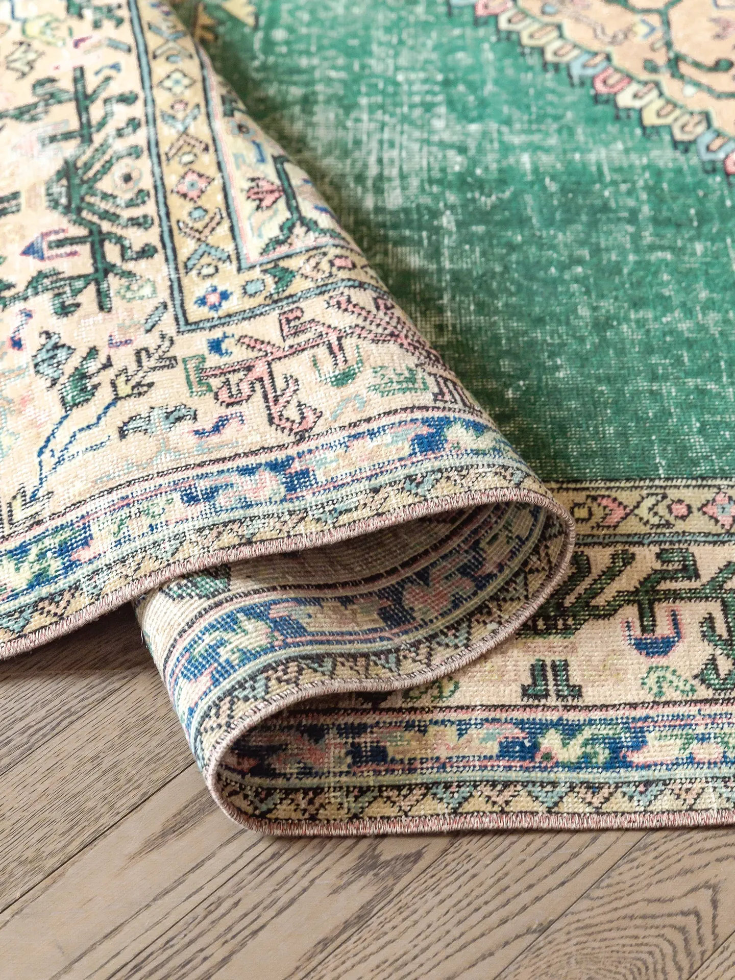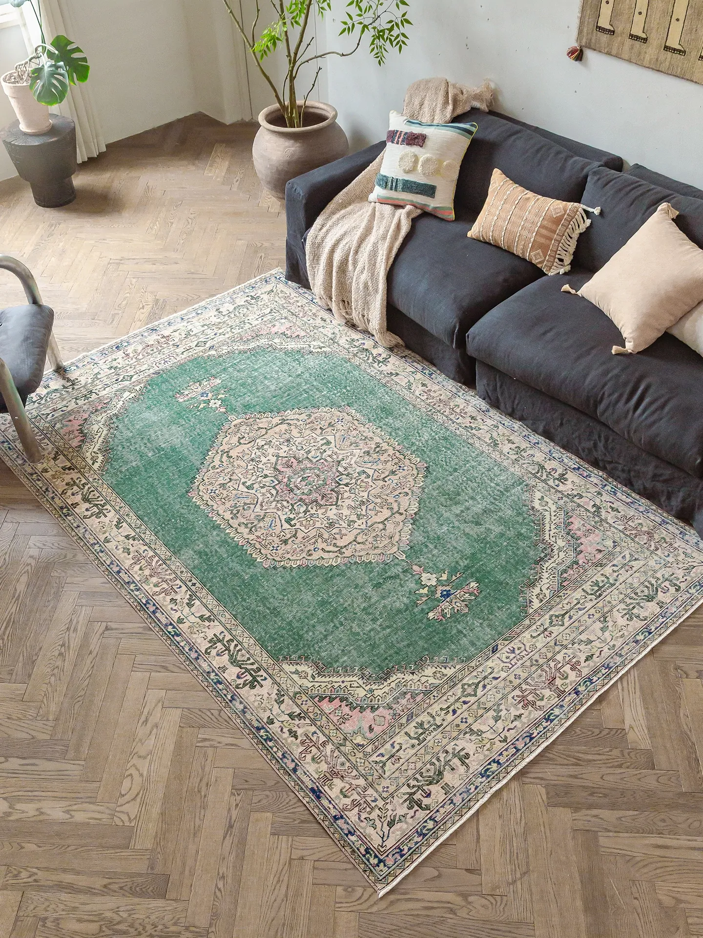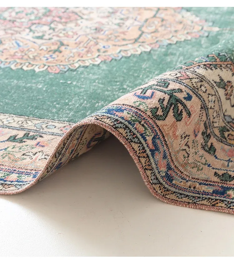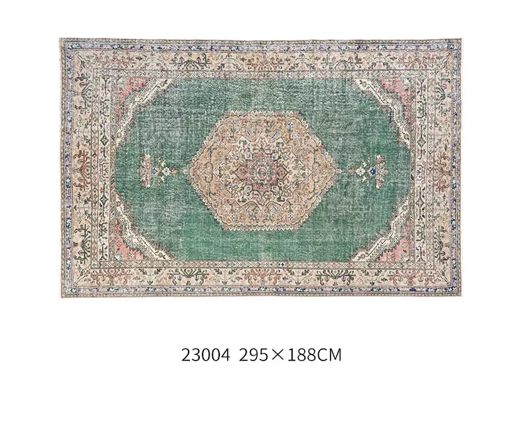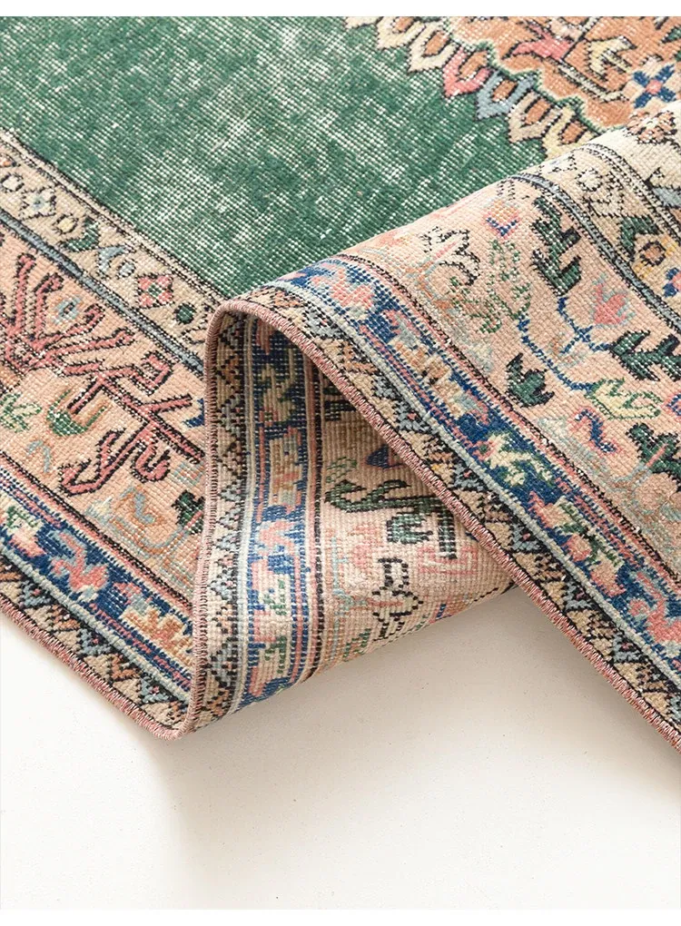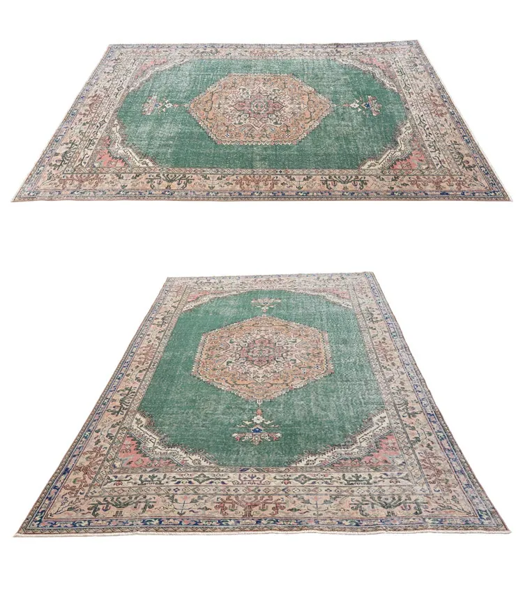 視覚と味覚の融合!トルコ直輸入のハンドメイドウールラグ - ヴィンテージ感あふれる高品質な結び目で、あなたのリビングを華やかに演出します。