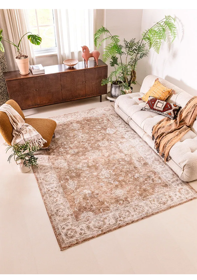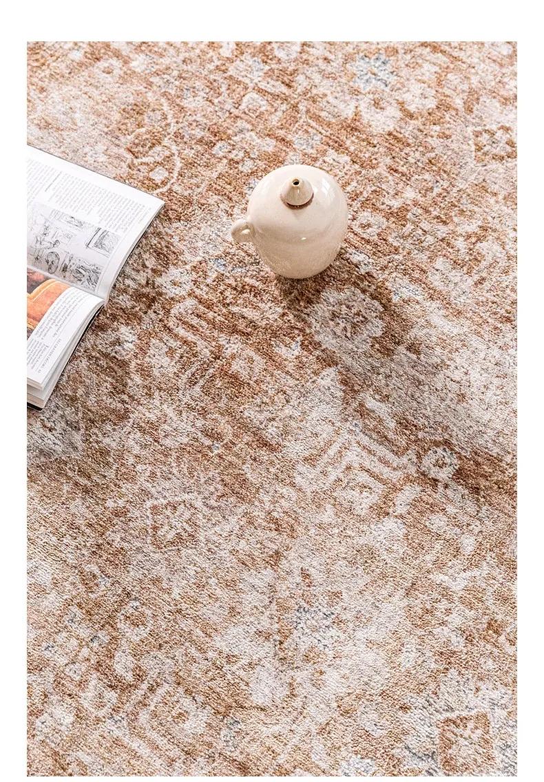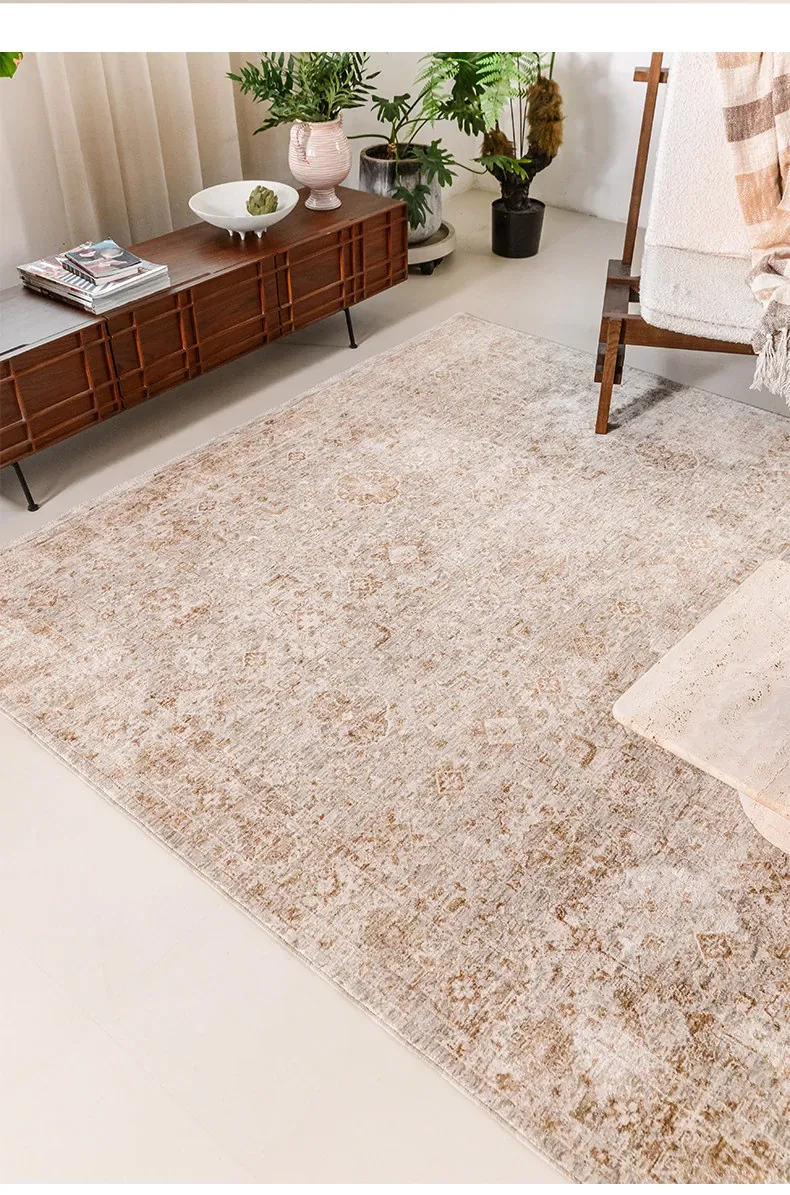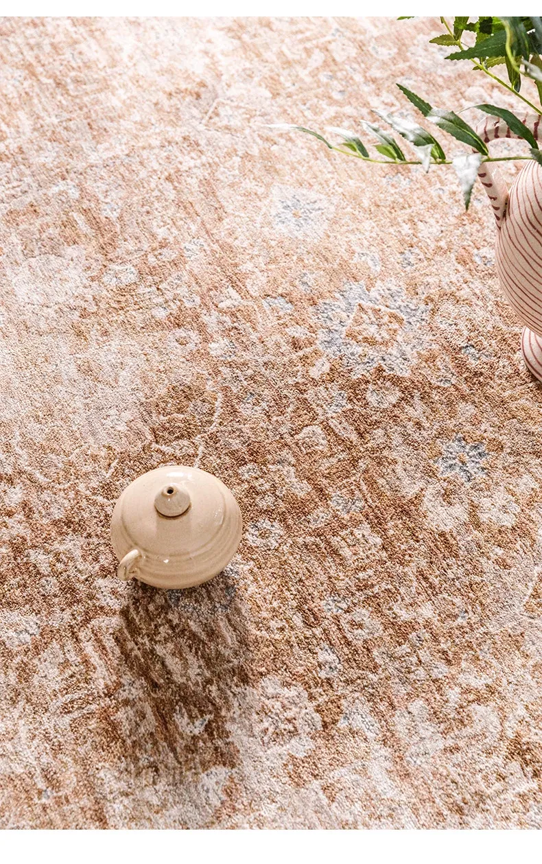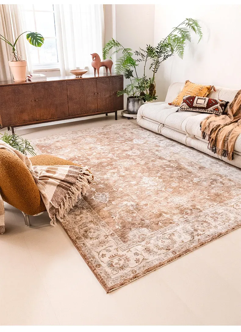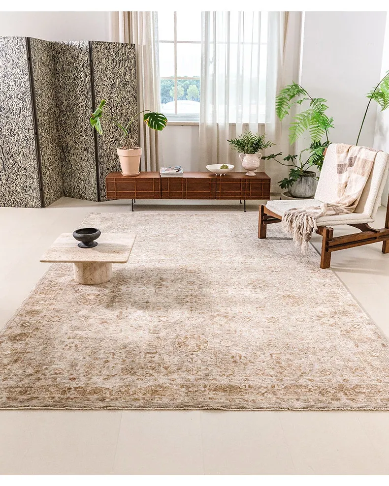 視覚的な味わいを楽しむ!トルコ直輸入のレトロ風リビングカーペット。フレンチ・ビンテージスタイルのアメリカン無接着カーペット、マキアートデザインでお部屋を彩ります。