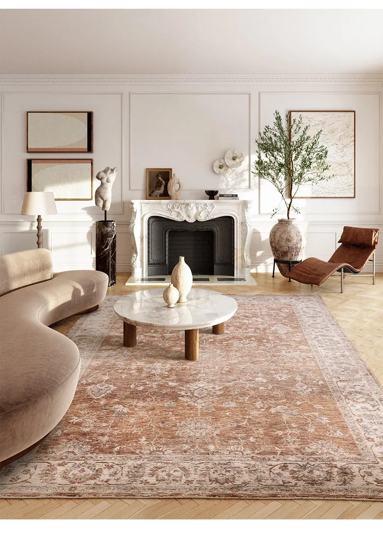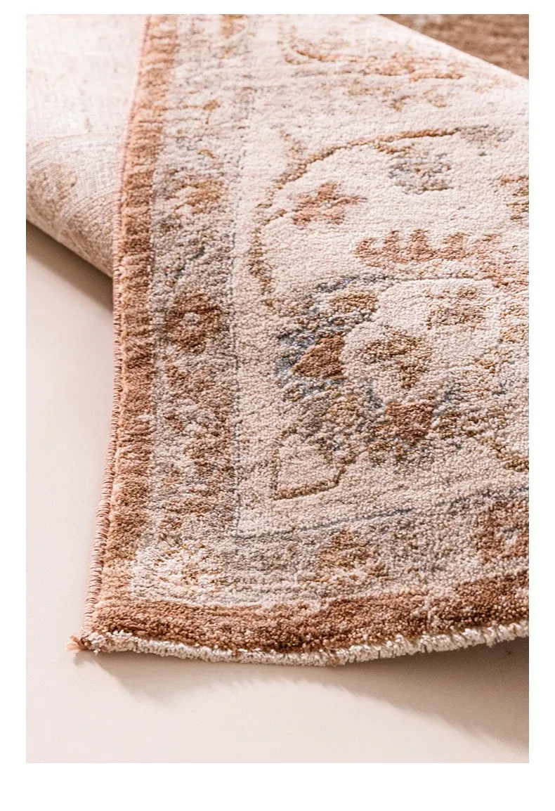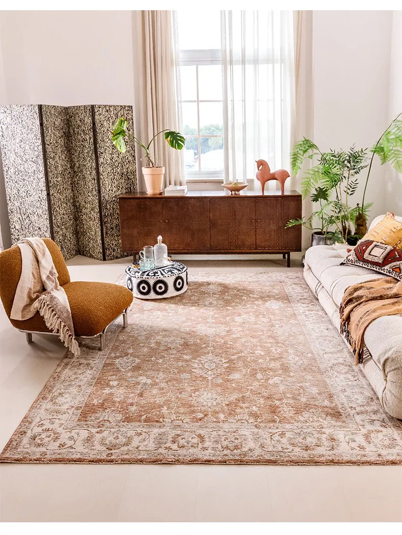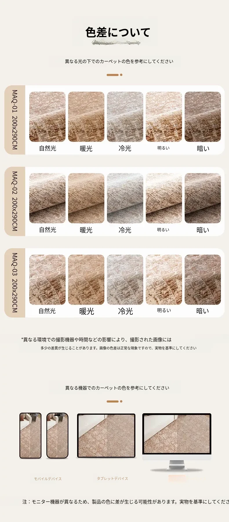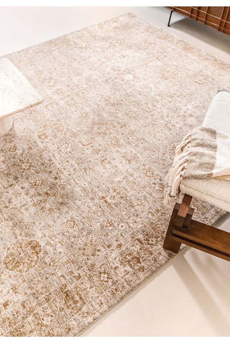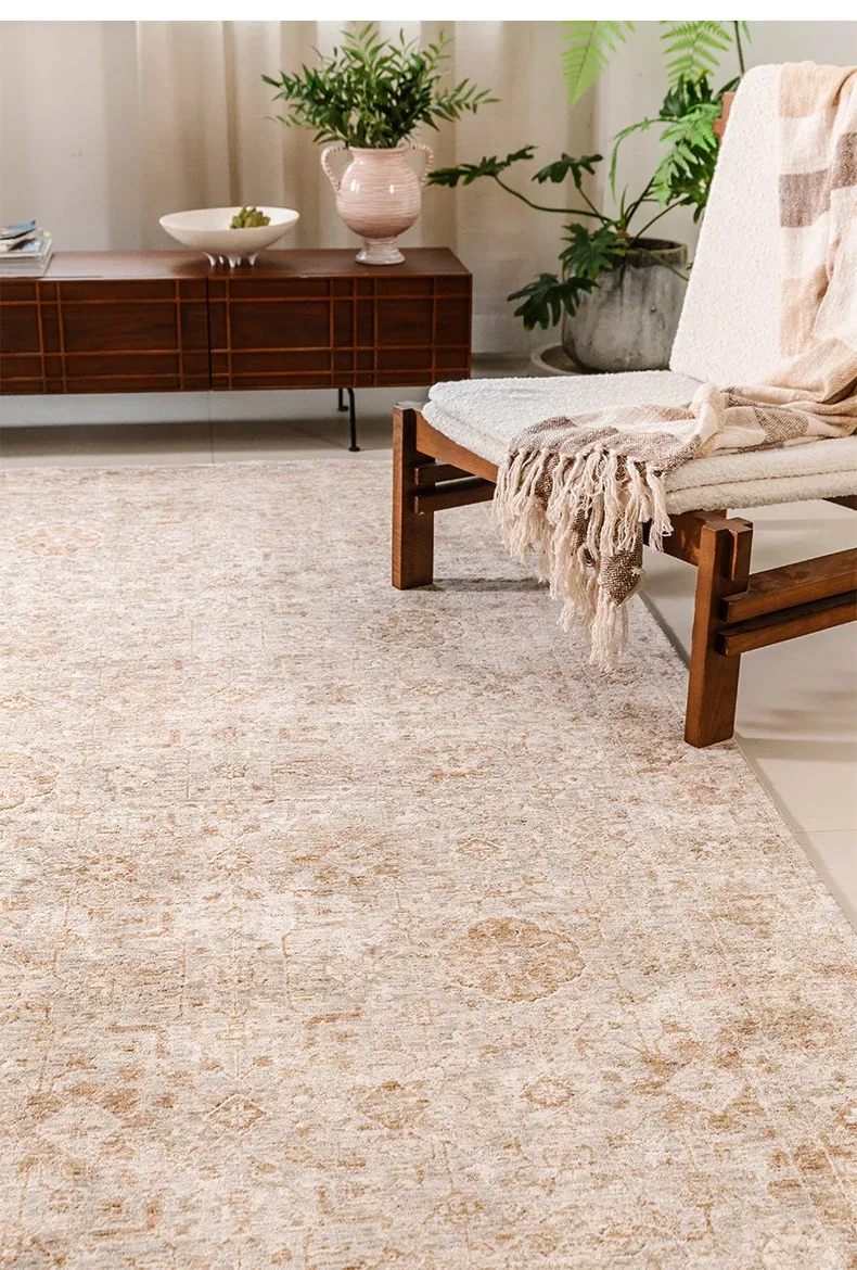 視覚的な味わいを楽しむ!トルコ直輸入のレトロ風リビングカーペット。フレンチ・ビンテージスタイルのアメリカン無接着カーペット、マキアートデザインでお部屋を彩ります。