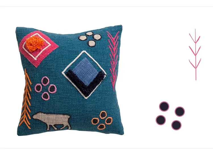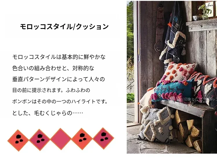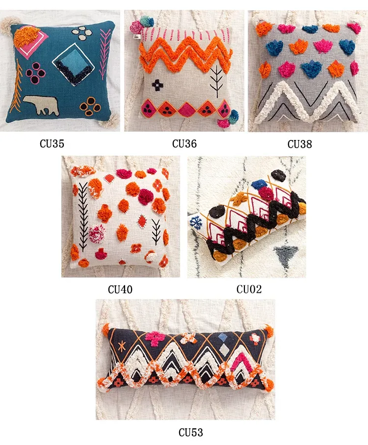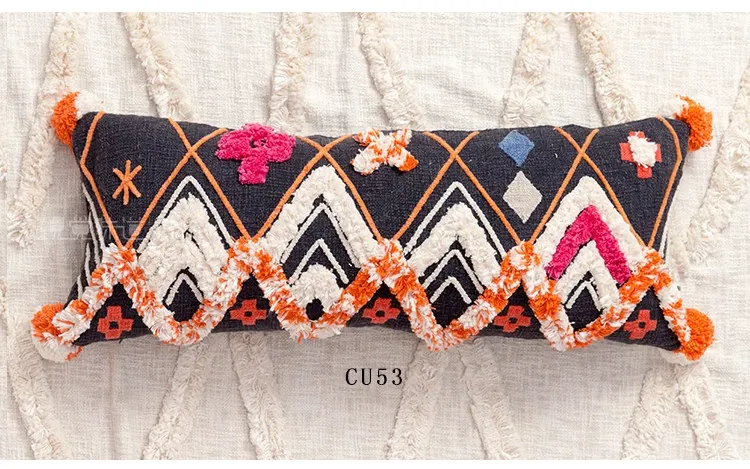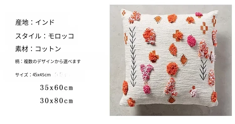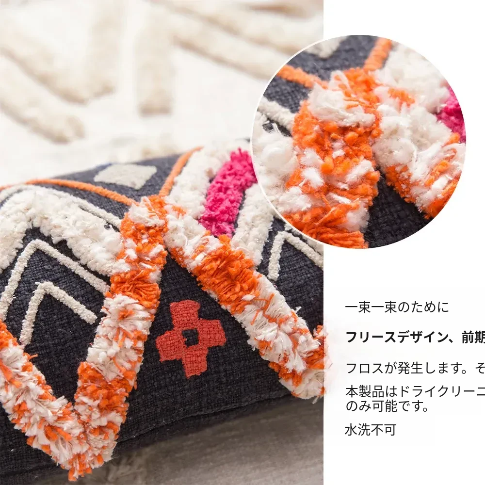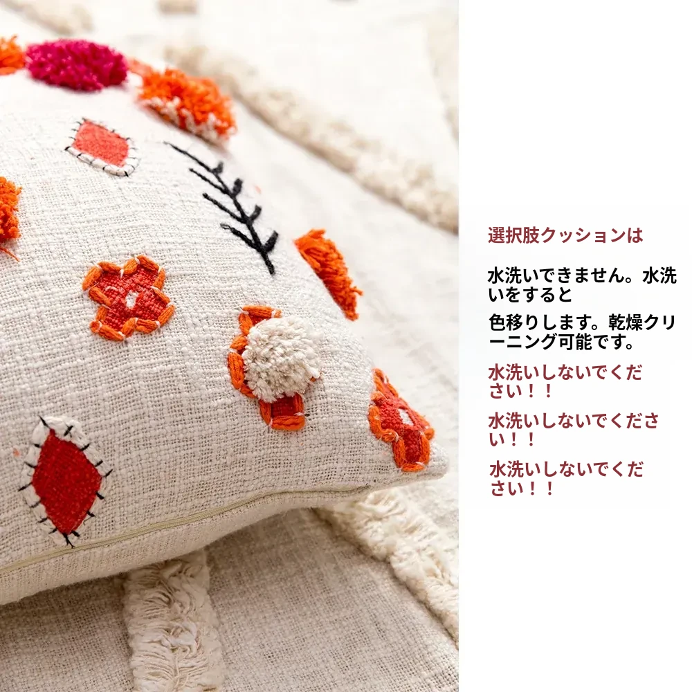 視覚と味覚を楽しむ!インド直輸入 モロッコスタイル 手作り刺繍入りコットンロングクッション - 創造的なデザインのクッションで、あなたの空間を華やかに演出!