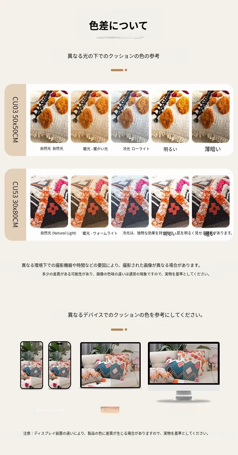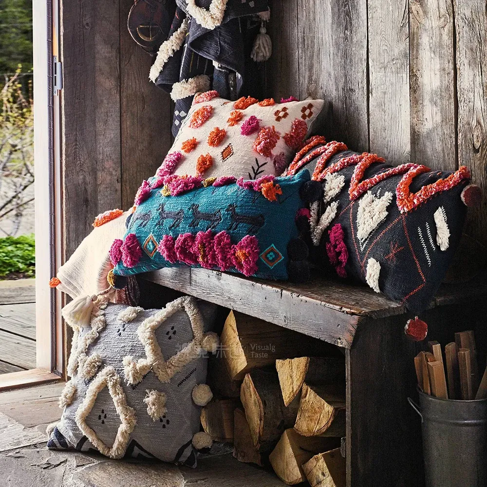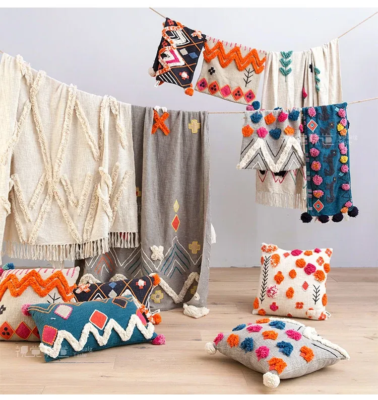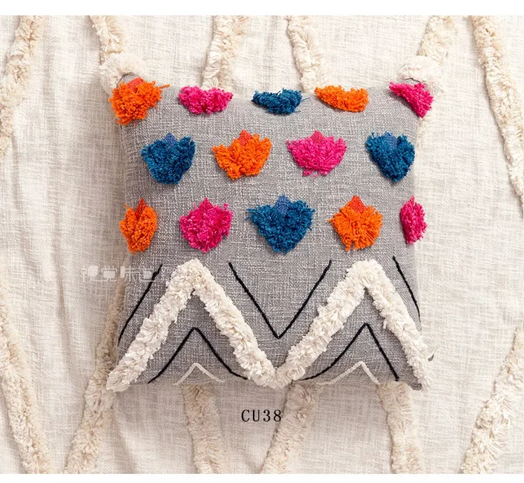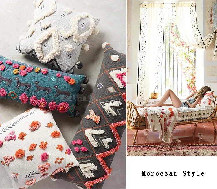視覚と味覚を楽しむ!インド直輸入 モロッコスタイル 手作り刺繍入りコットンロングクッション - 創造的なデザインのクッションで、あなたの空間を華やかに演出!