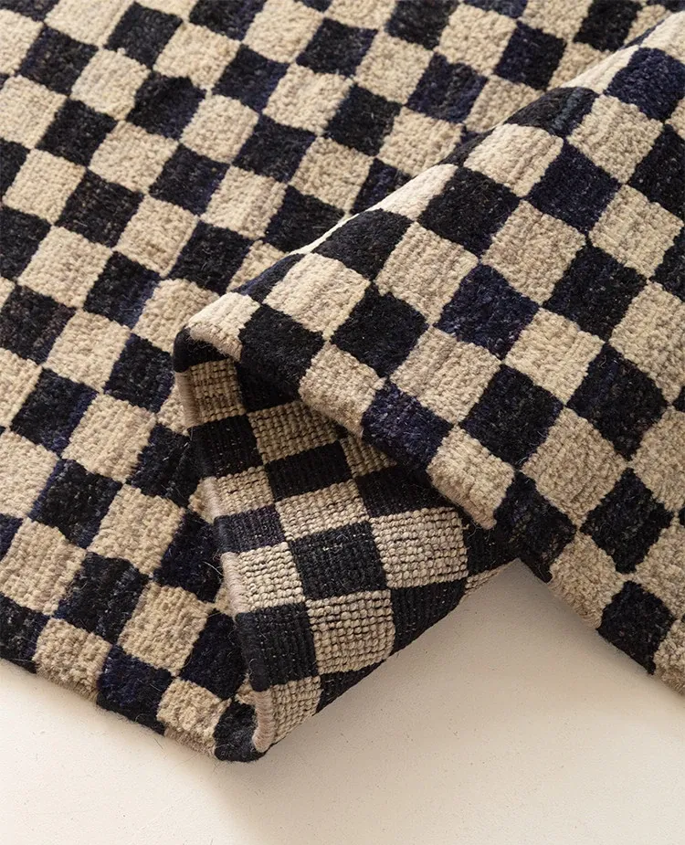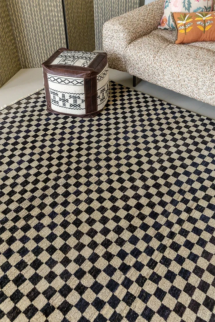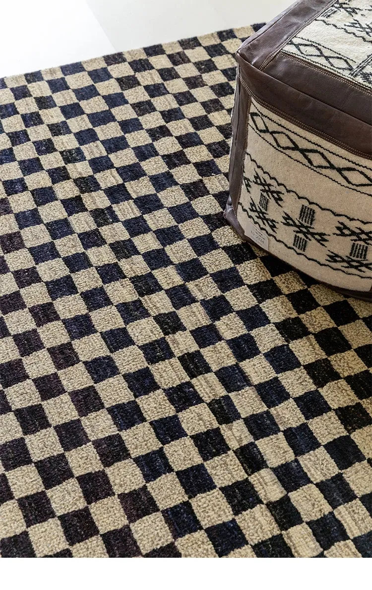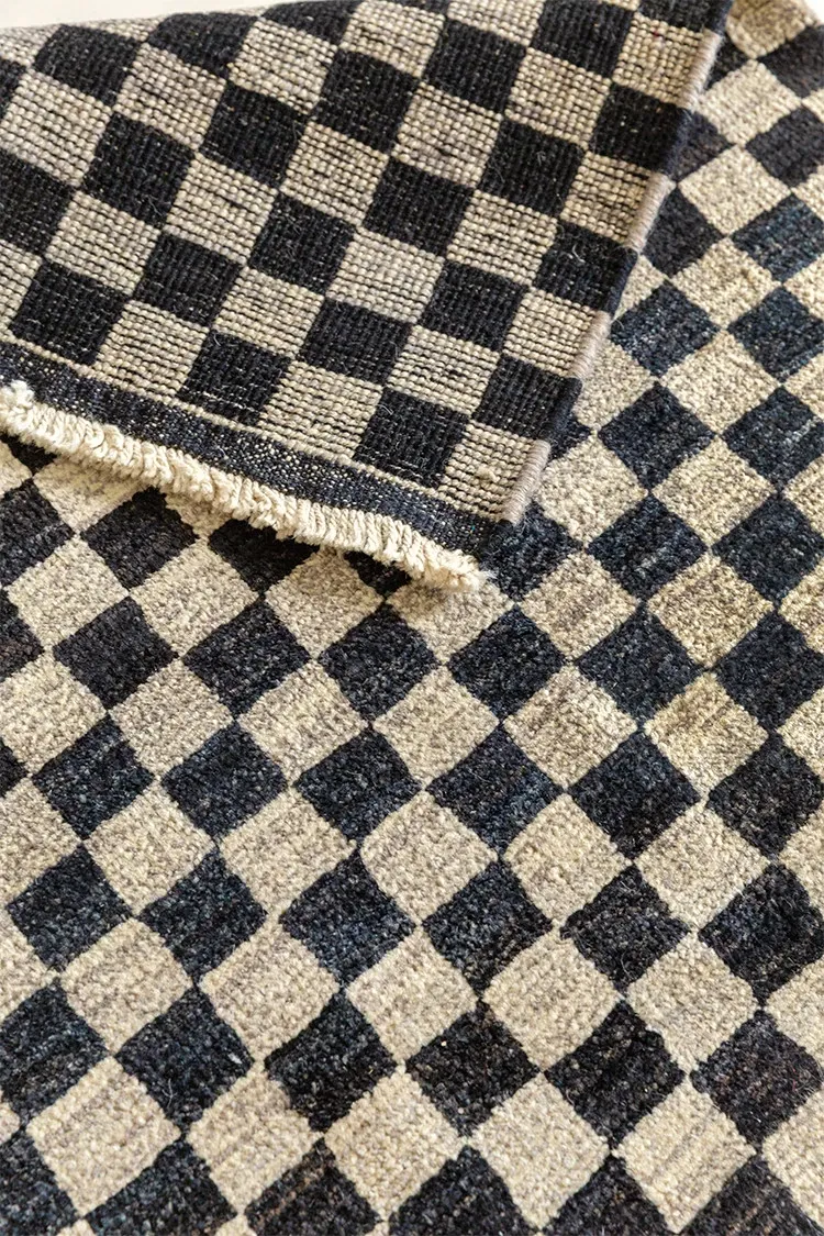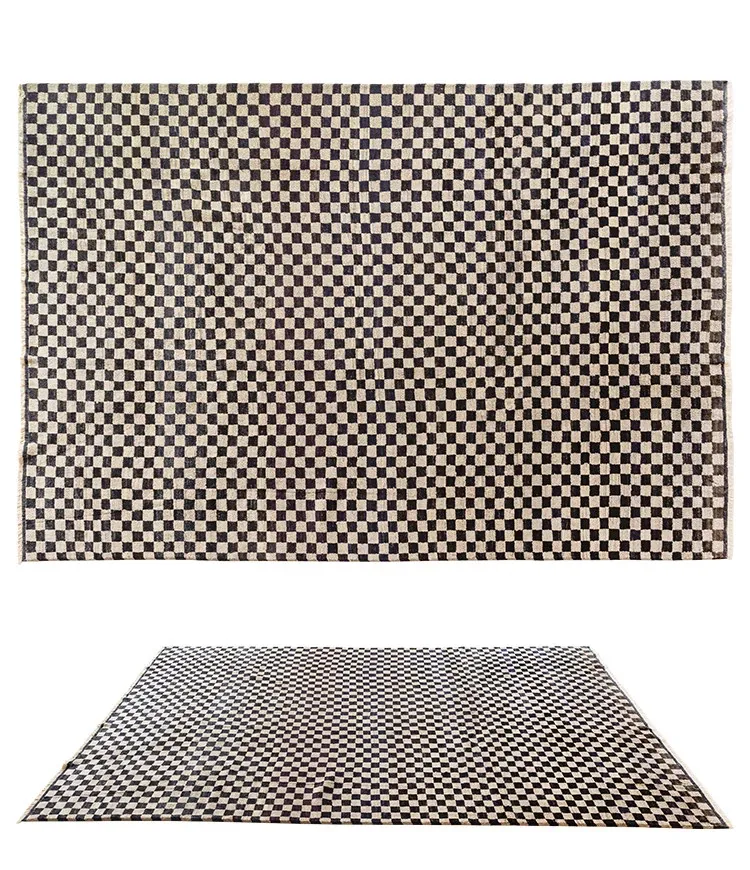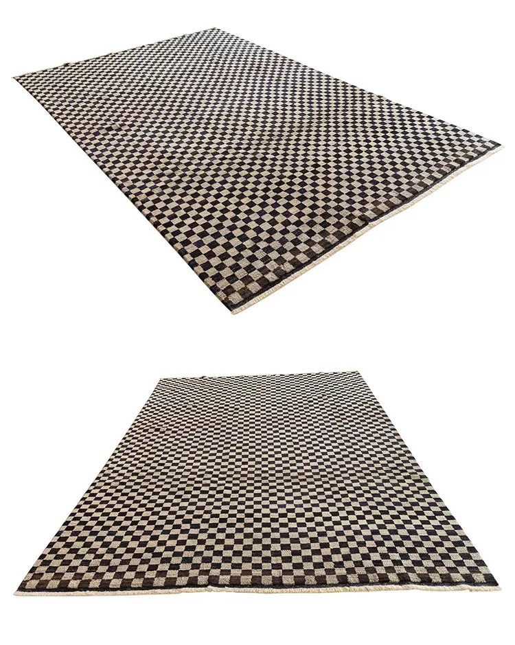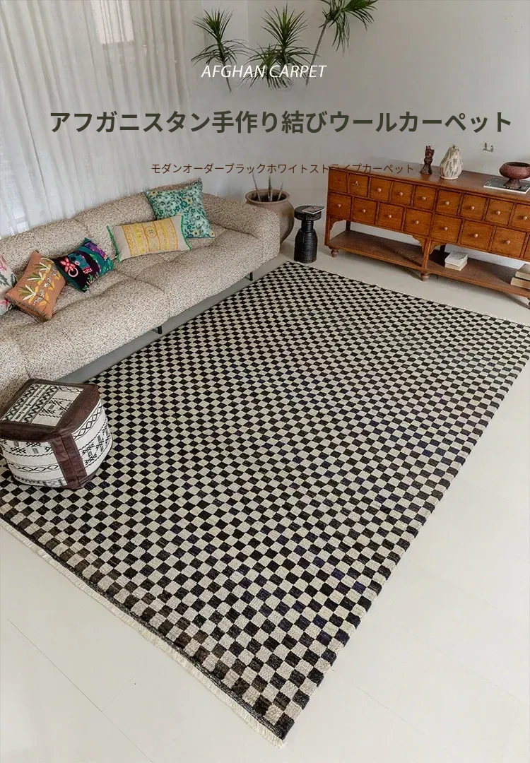 視覚的な味わい!アフガニスタン産の手織りウールカーペット、クラシックなブラック&ホワイトチェック柄。リビングにぴったりの高級感あふれるデザイン!