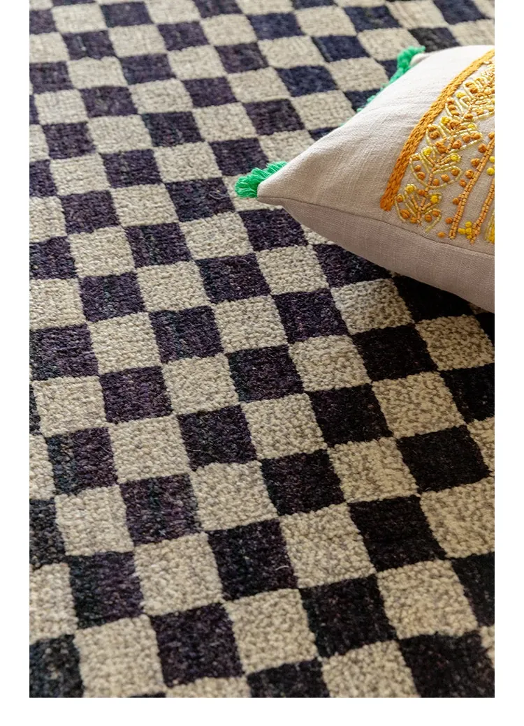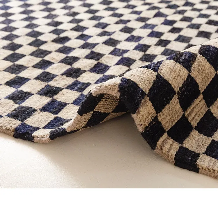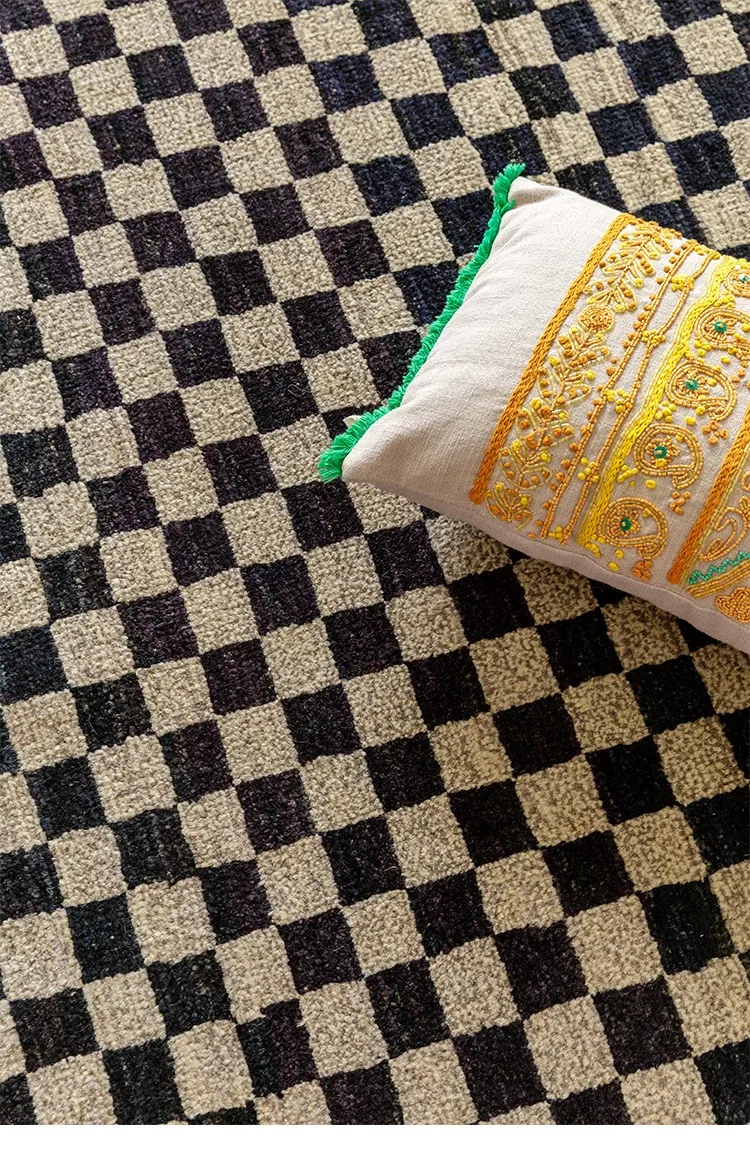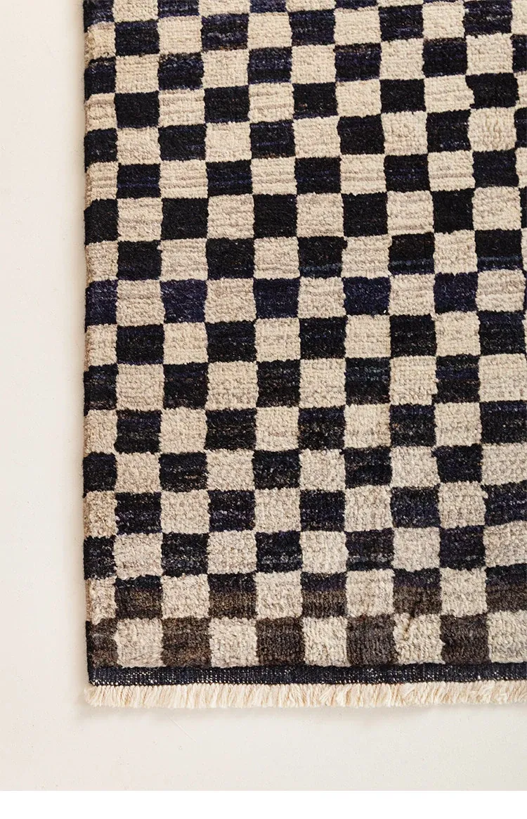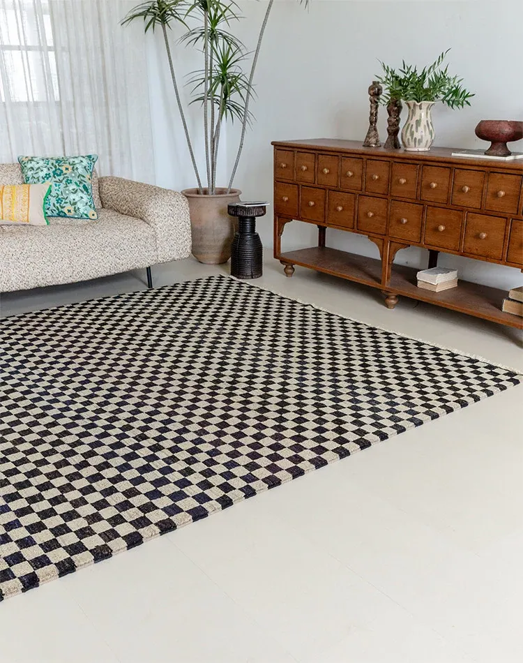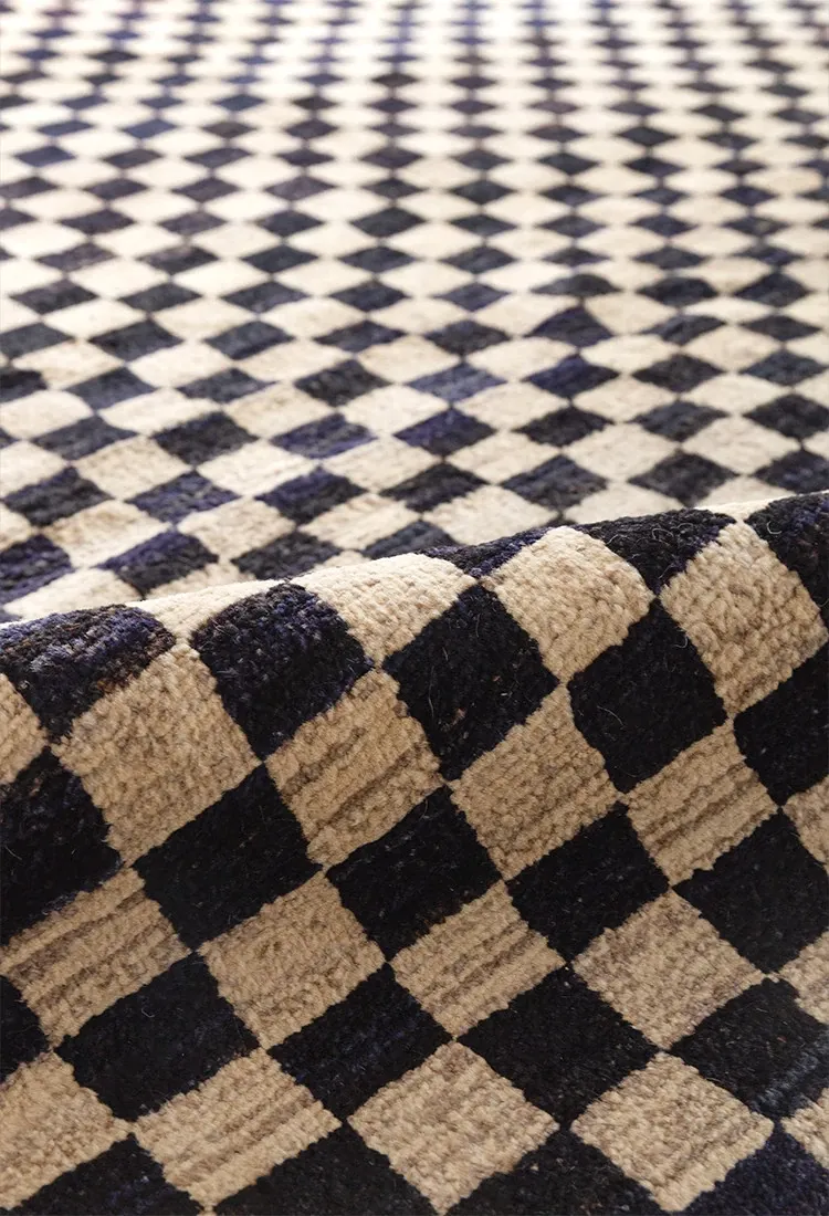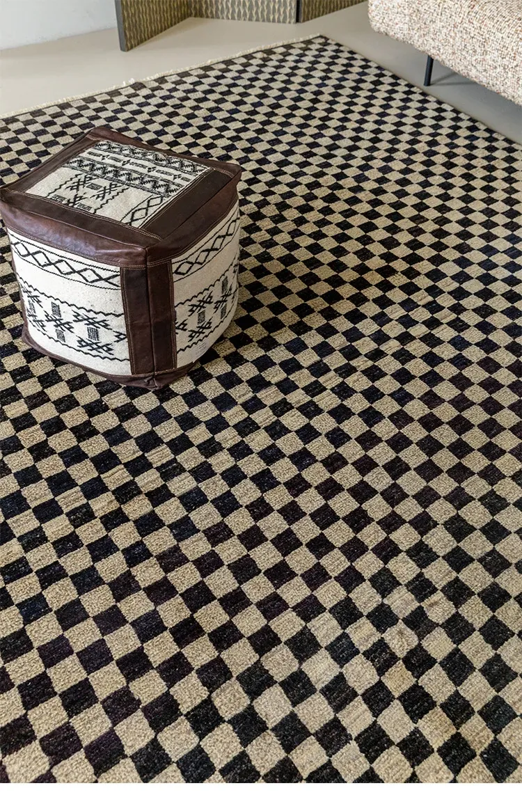 視覚的な味わい!アフガニスタン産の手織りウールカーペット、クラシックなブラック&ホワイトチェック柄。リビングにぴったりの高級感あふれるデザイン!