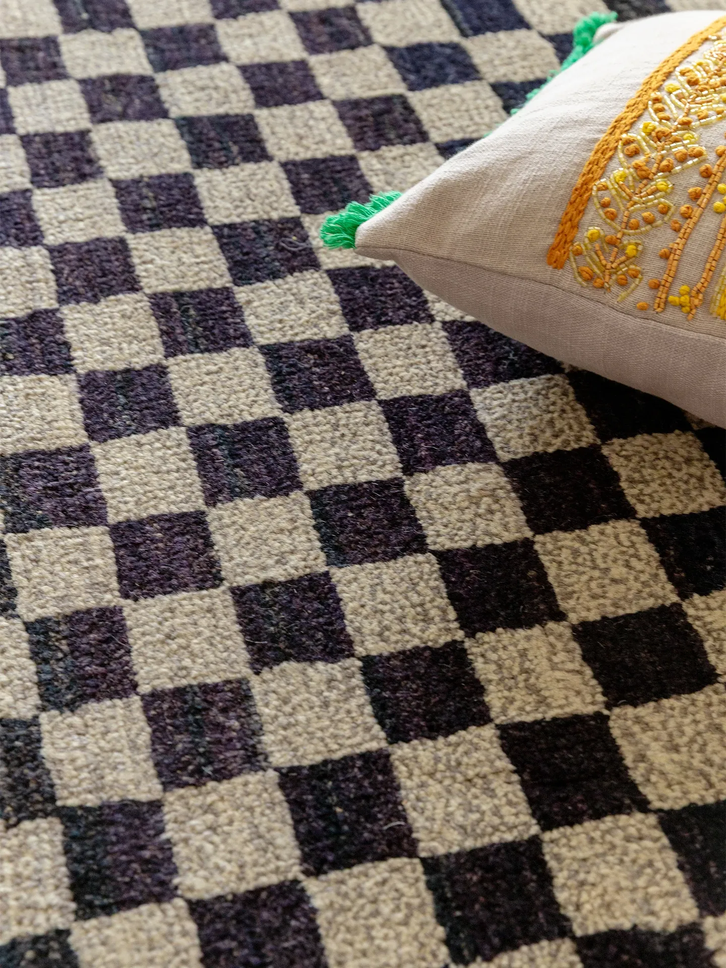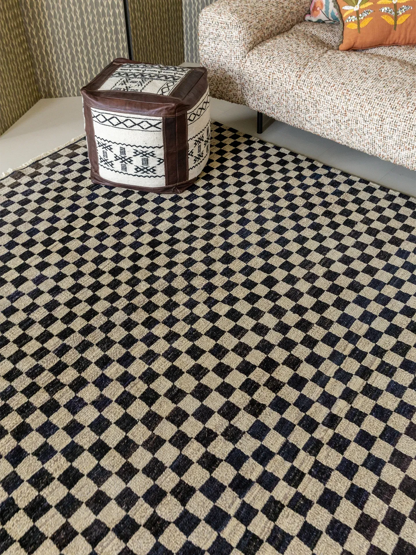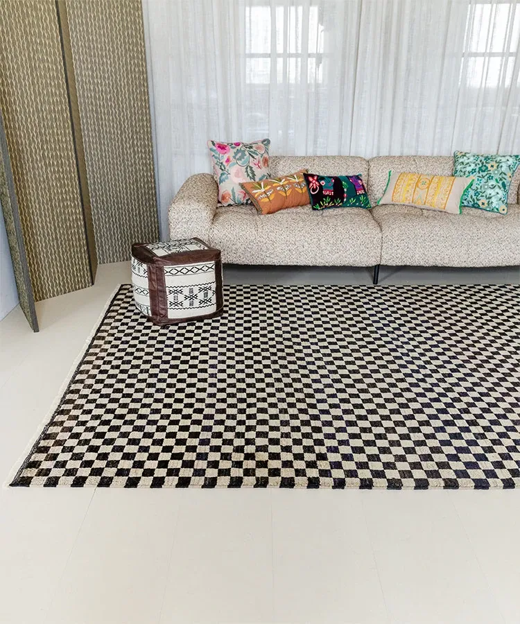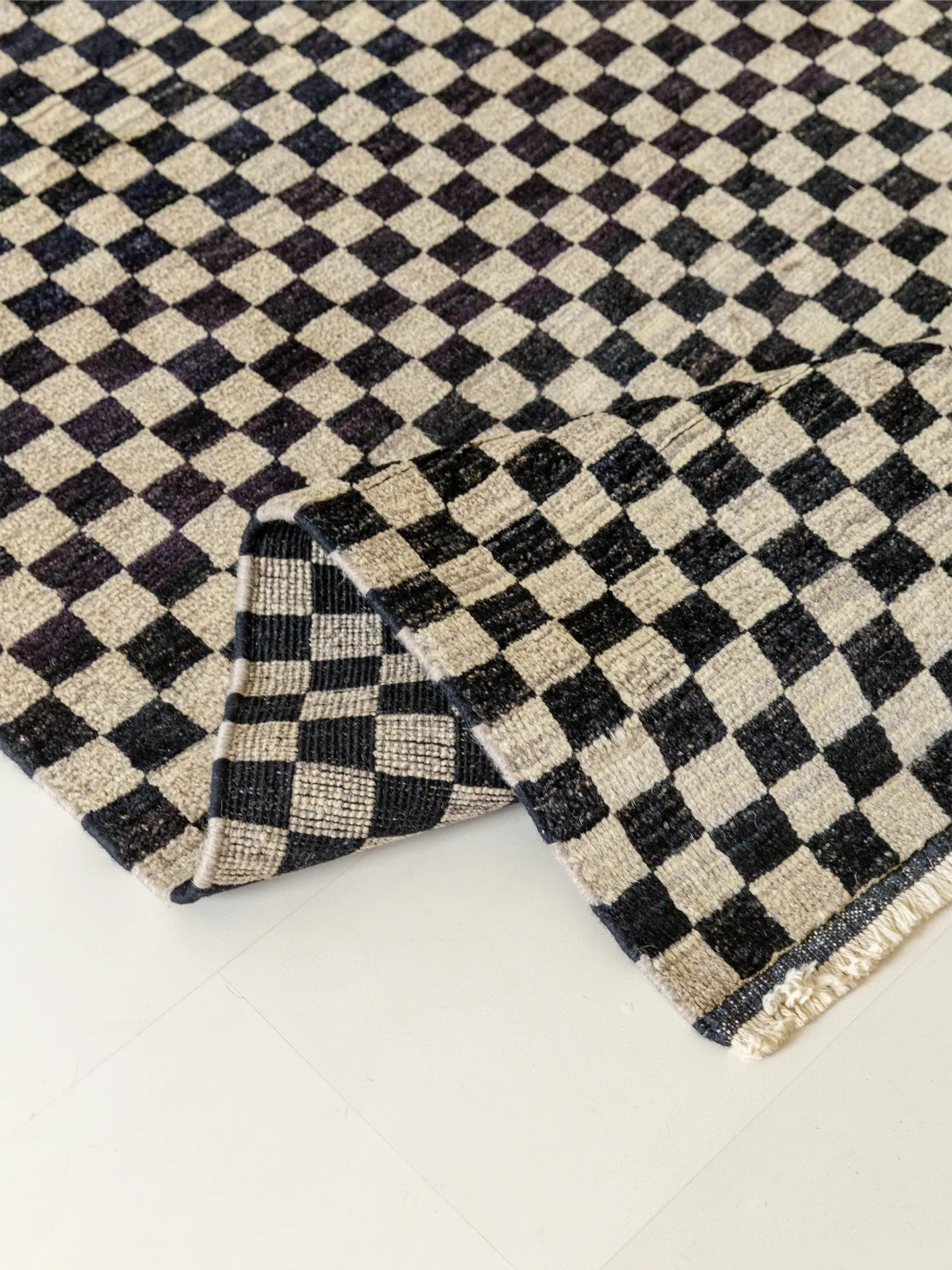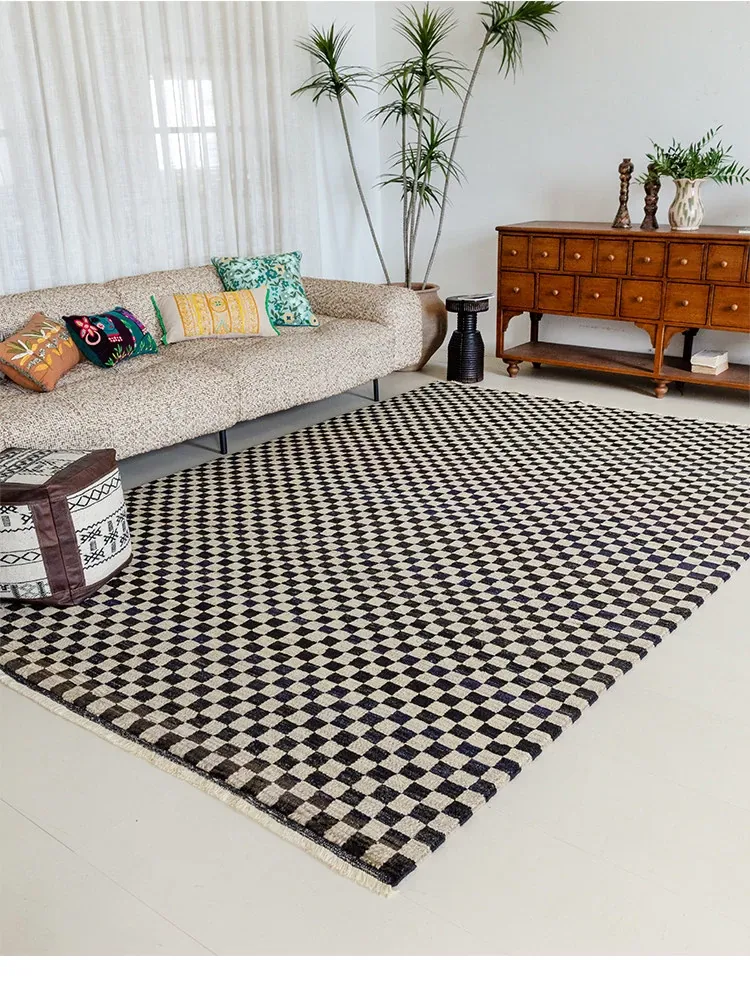 視覚的な味わい!アフガニスタン産の手織りウールカーペット、クラシックなブラック&ホワイトチェック柄。リビングにぴったりの高級感あふれるデザイン!