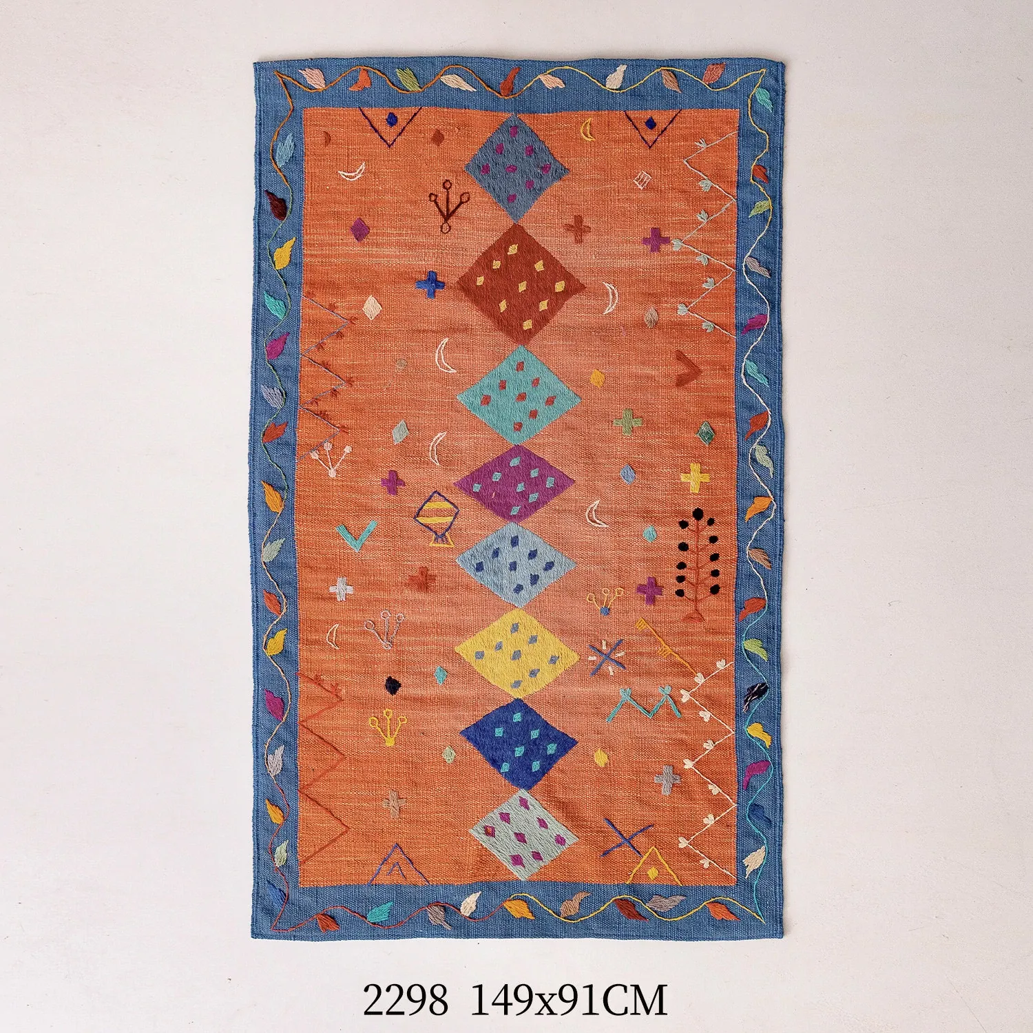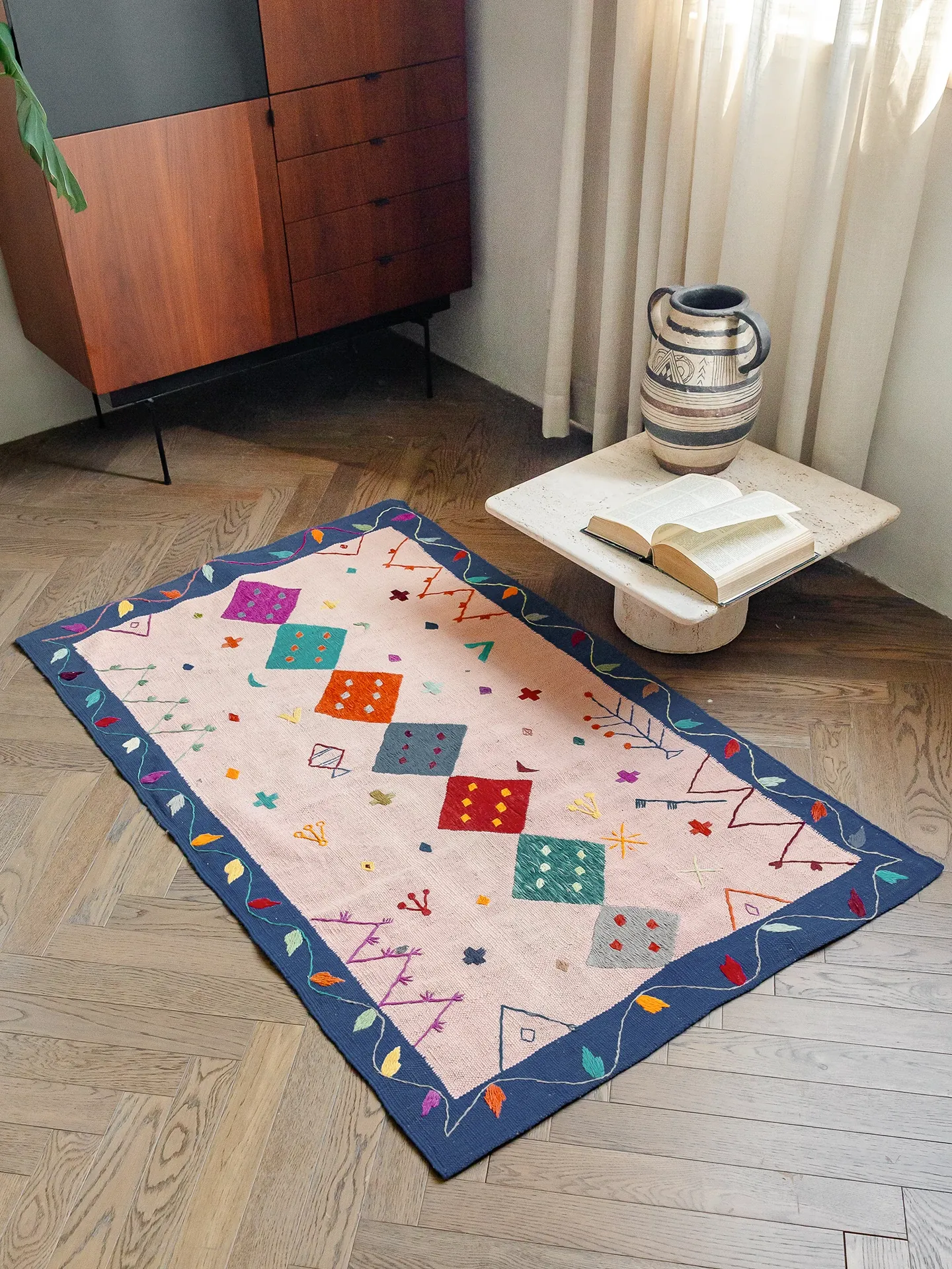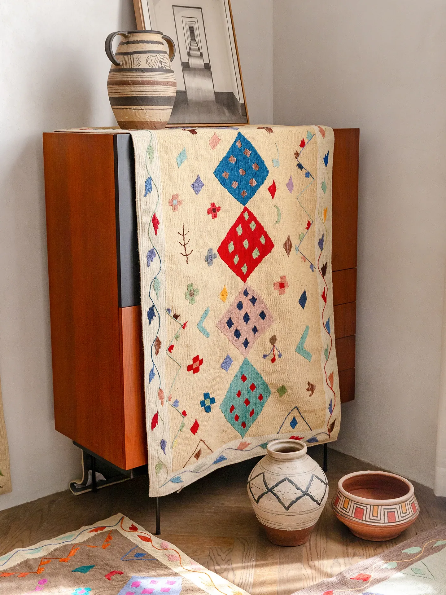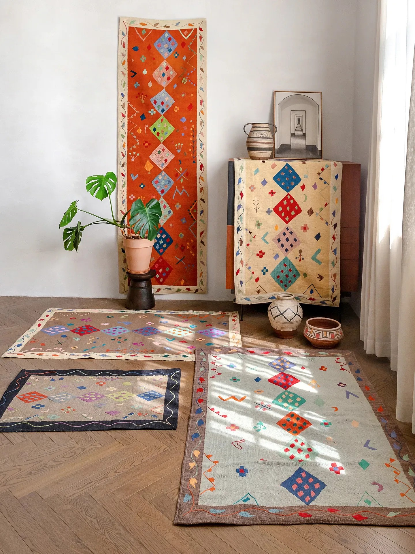 視覚と味覚を楽しむ アフガニスタン直輸入 手作りウールキリムカーペット ボヘミアンスタイル リビングルーム用ロングタペストリー