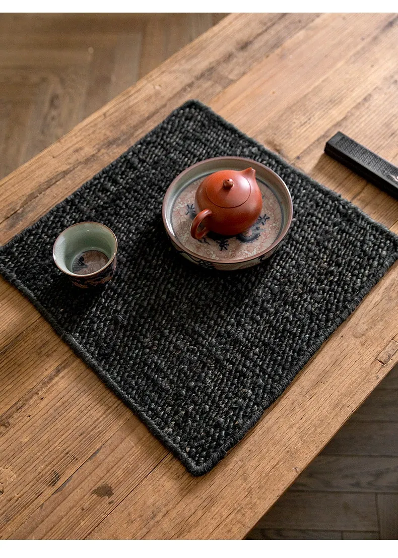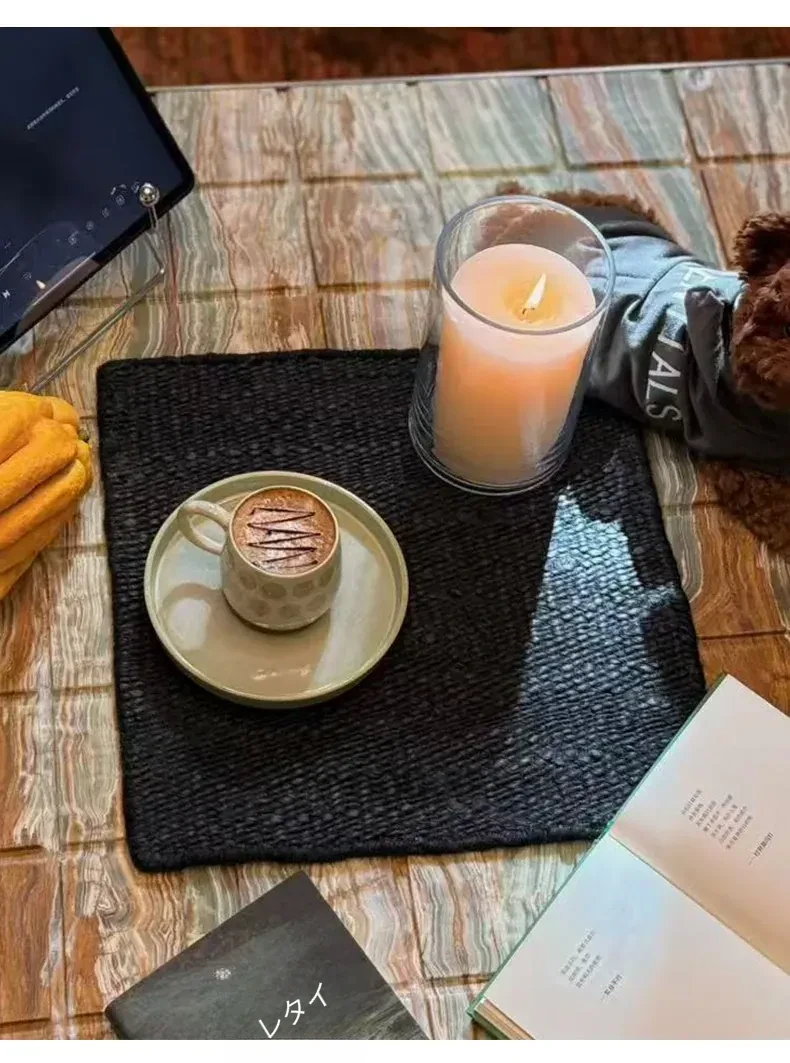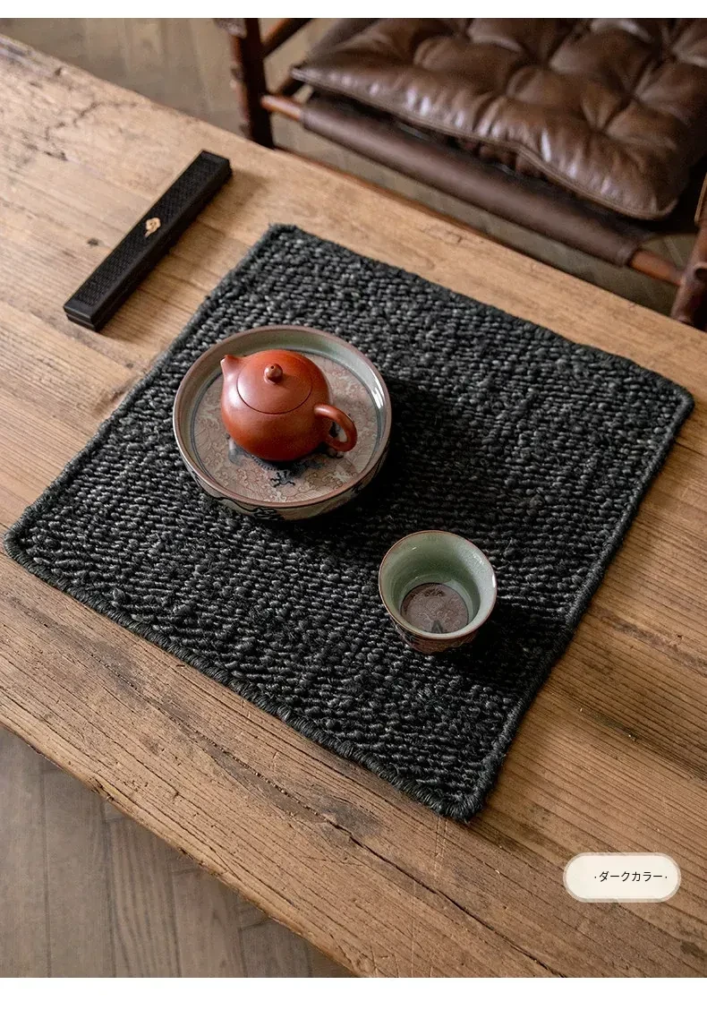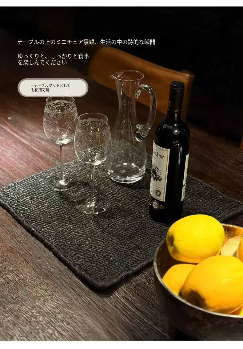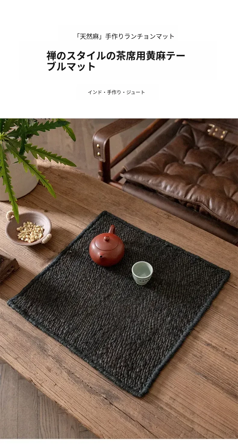 視覚と味覚を楽しむ!輸入ハンドメイドの黒いジュート製禅スタイル新中式茶席テーブルマット。断熱効果抜群の両面デザインで、インテリアを引き立てるおしゃれなダイニングアイテム!