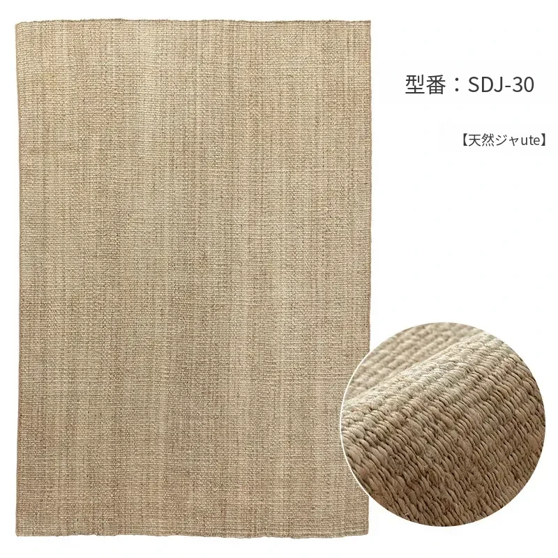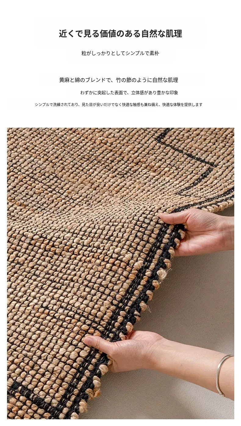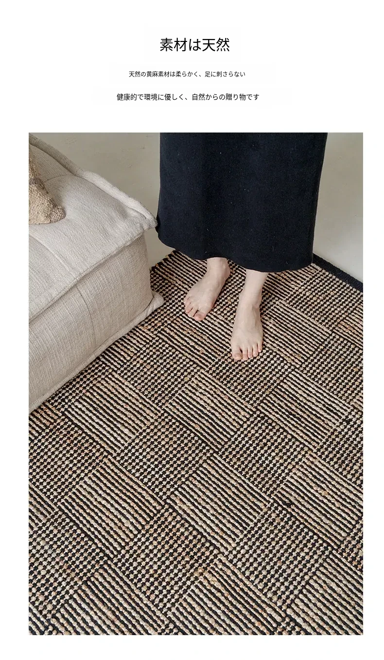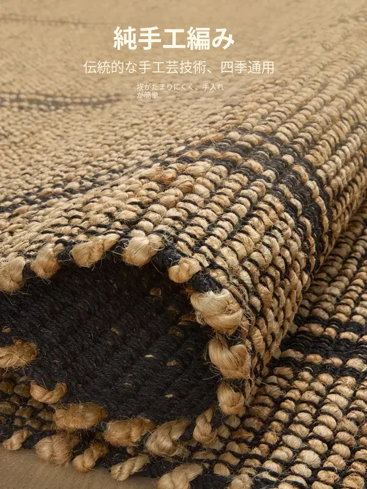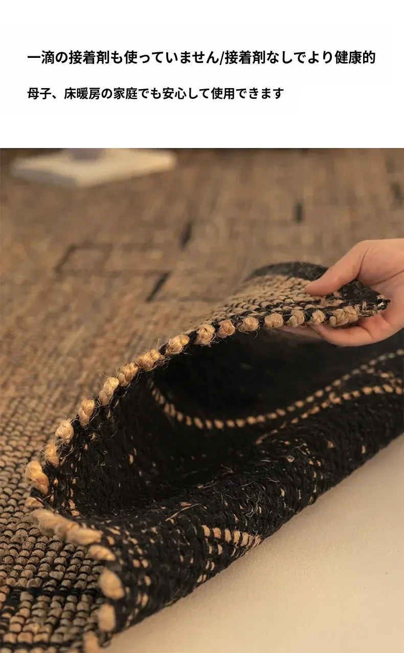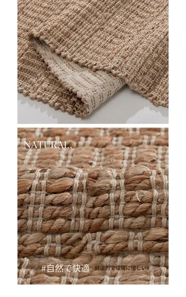 視覚と味覚のハーモニーを楽しむ!無接着剤の輸入ジュートカーペット、手編みの和風デザインで、リビングのテーブルを引き立てるイタリアンエレガンス。天然素材の温もりを感じて、上質な空間を演出します。