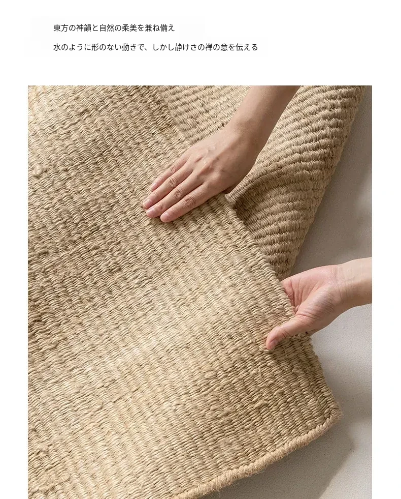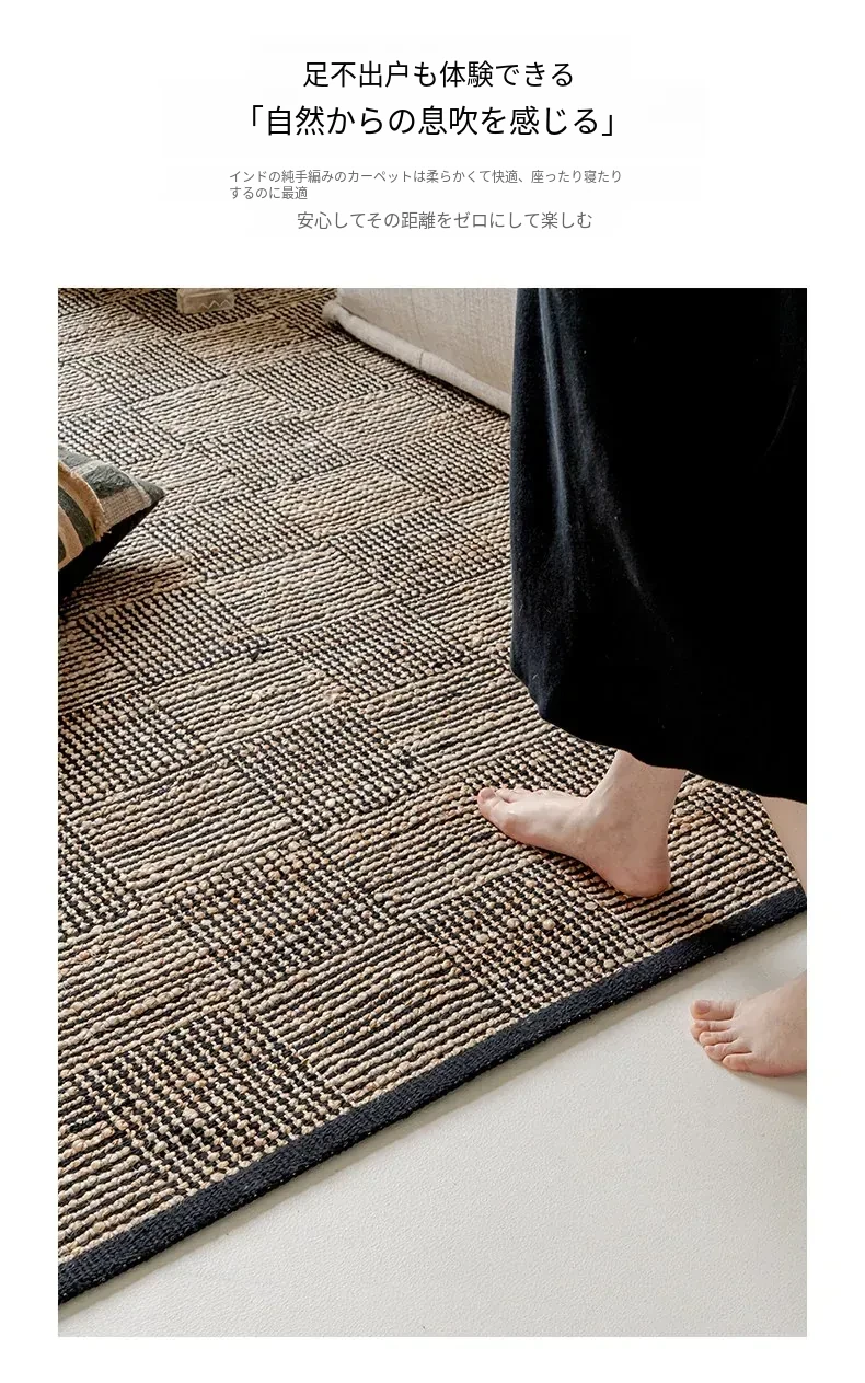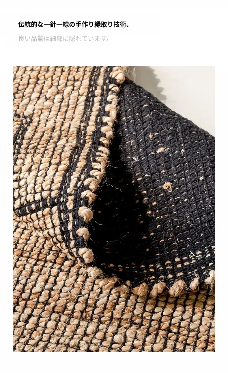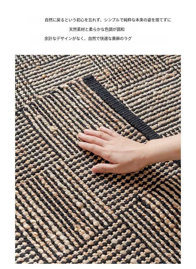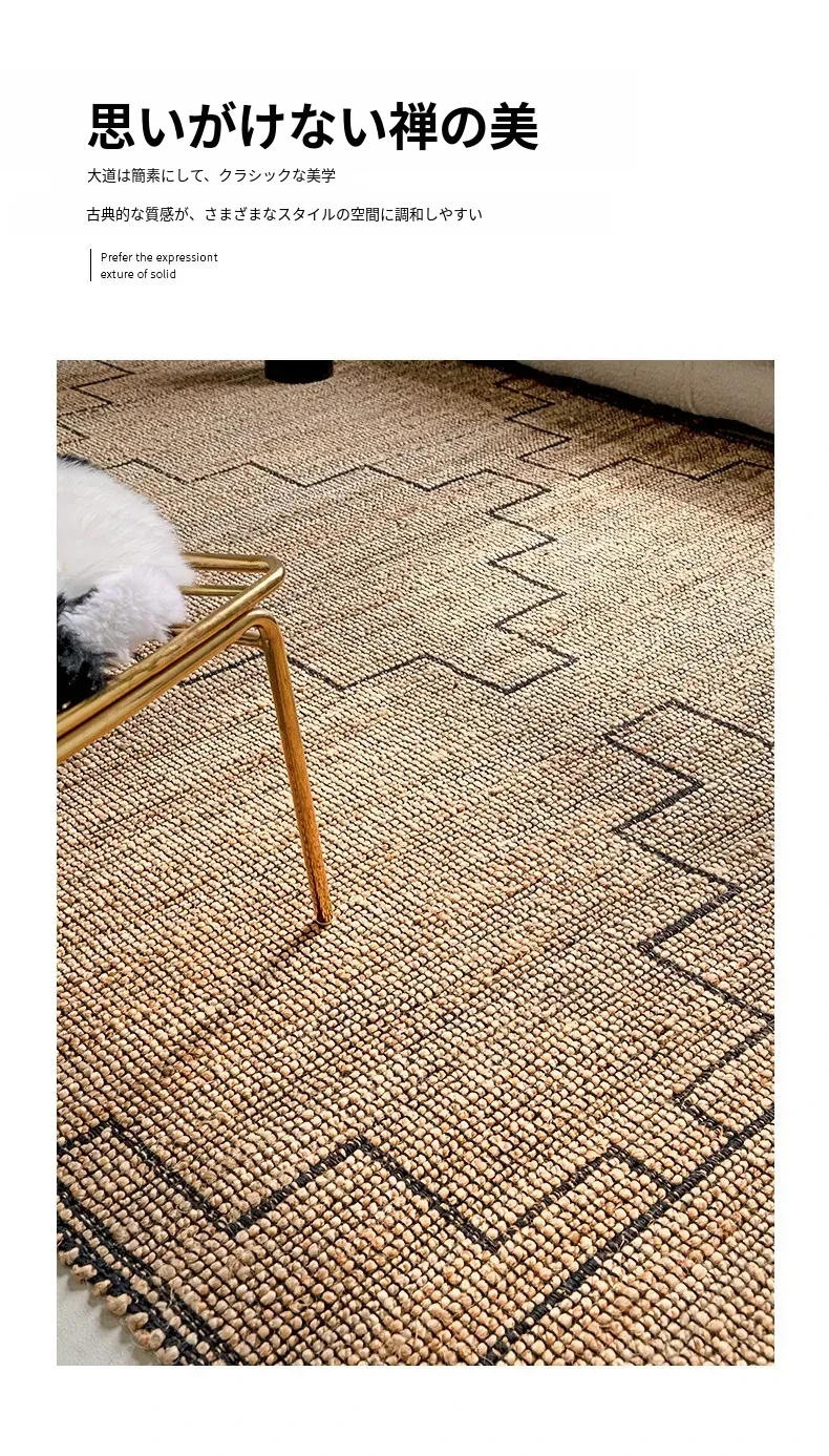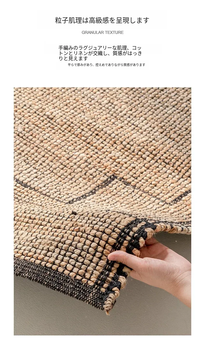 視覚と味覚のハーモニーを楽しむ!無接着剤の輸入ジュートカーペット、手編みの和風デザインで、リビングのテーブルを引き立てるイタリアンエレガンス。天然素材の温もりを感じて、上質な空間を演出します。