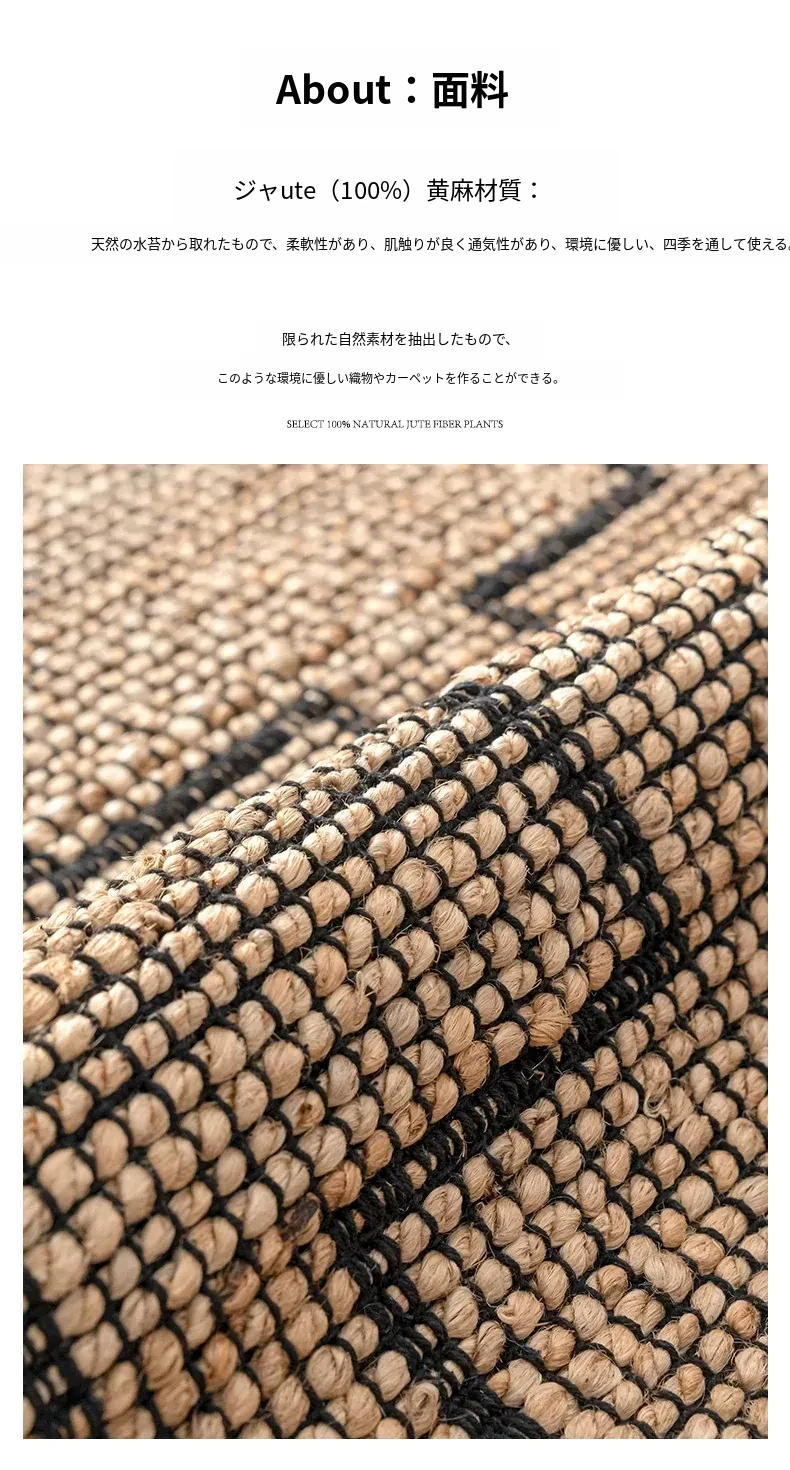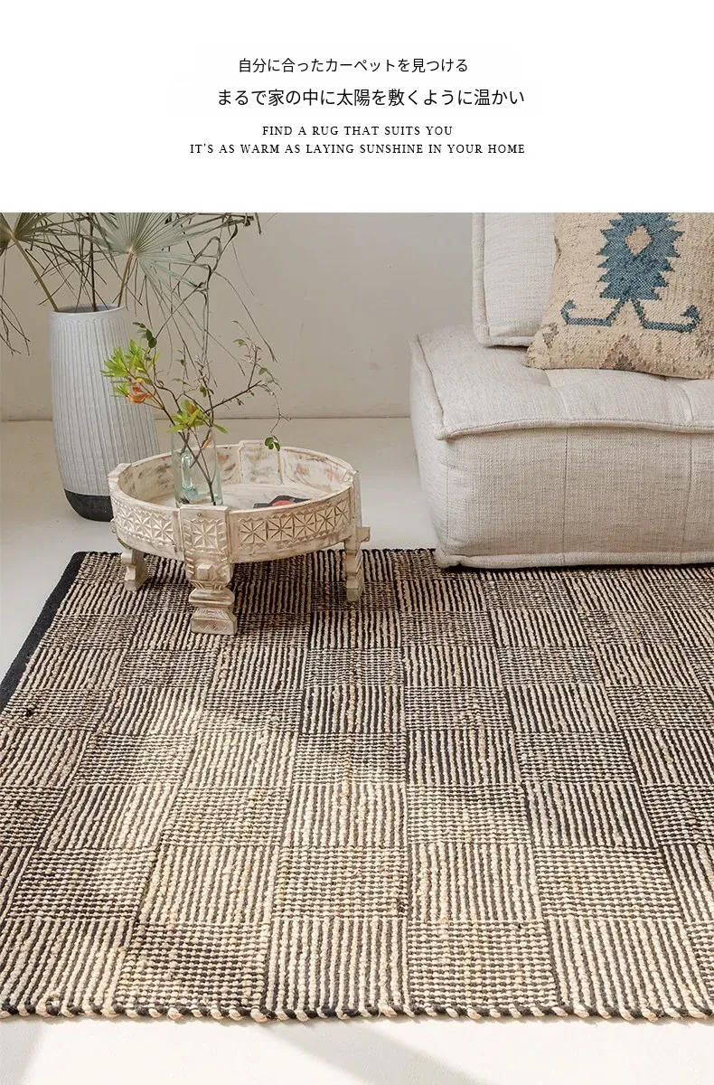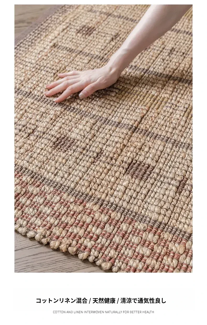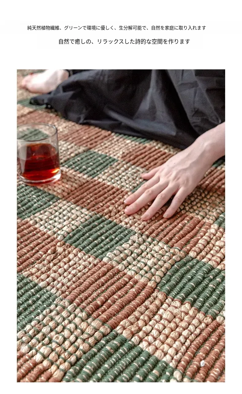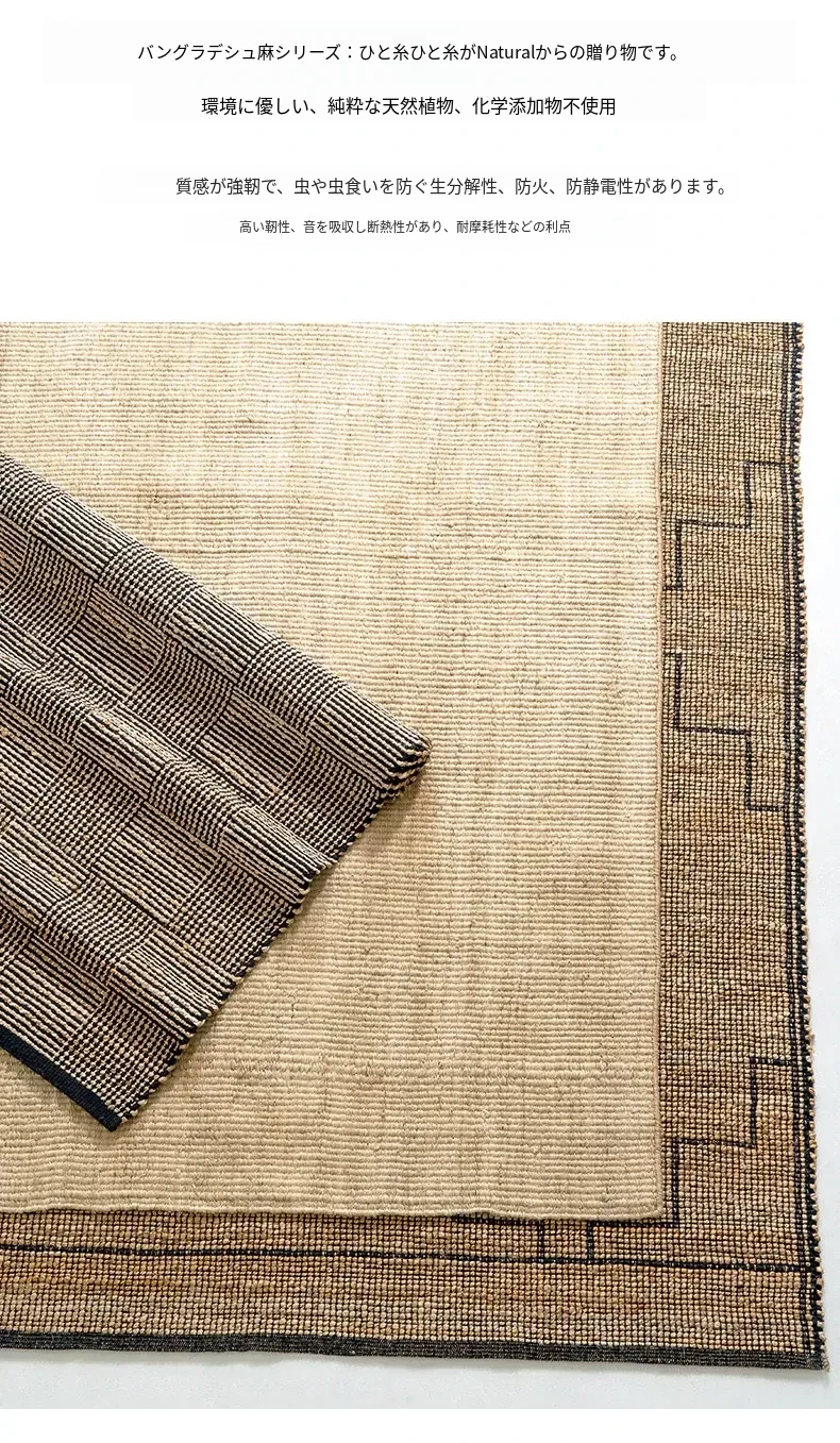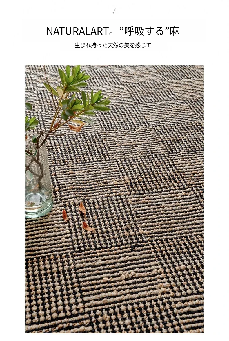 視覚と味覚のハーモニーを楽しむ!無接着剤の輸入ジュートカーペット、手編みの和風デザインで、リビングのテーブルを引き立てるイタリアンエレガンス。天然素材の温もりを感じて、上質な空間を演出します。
