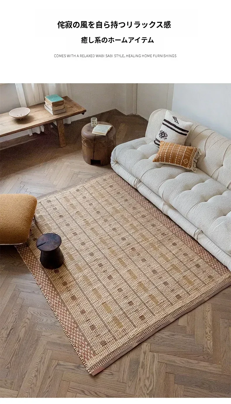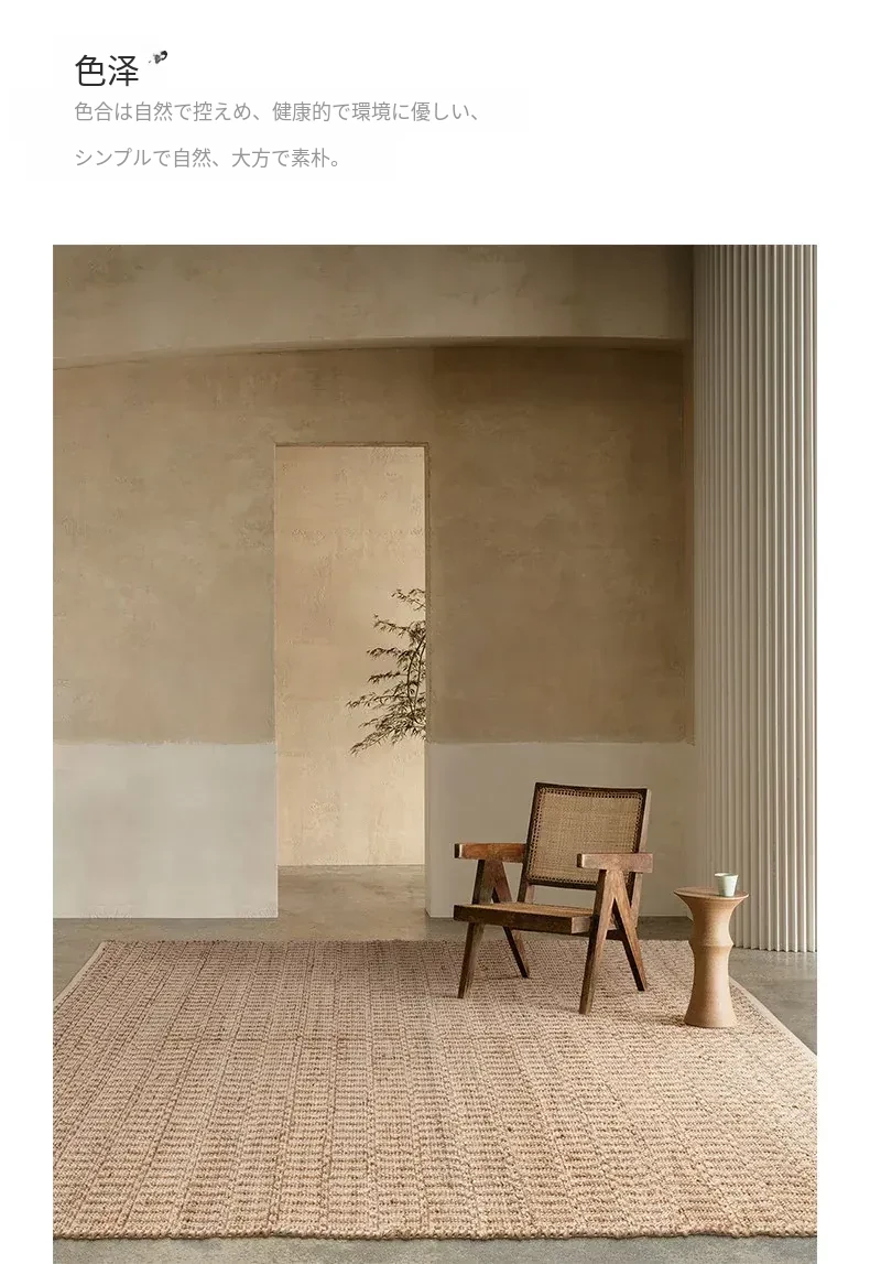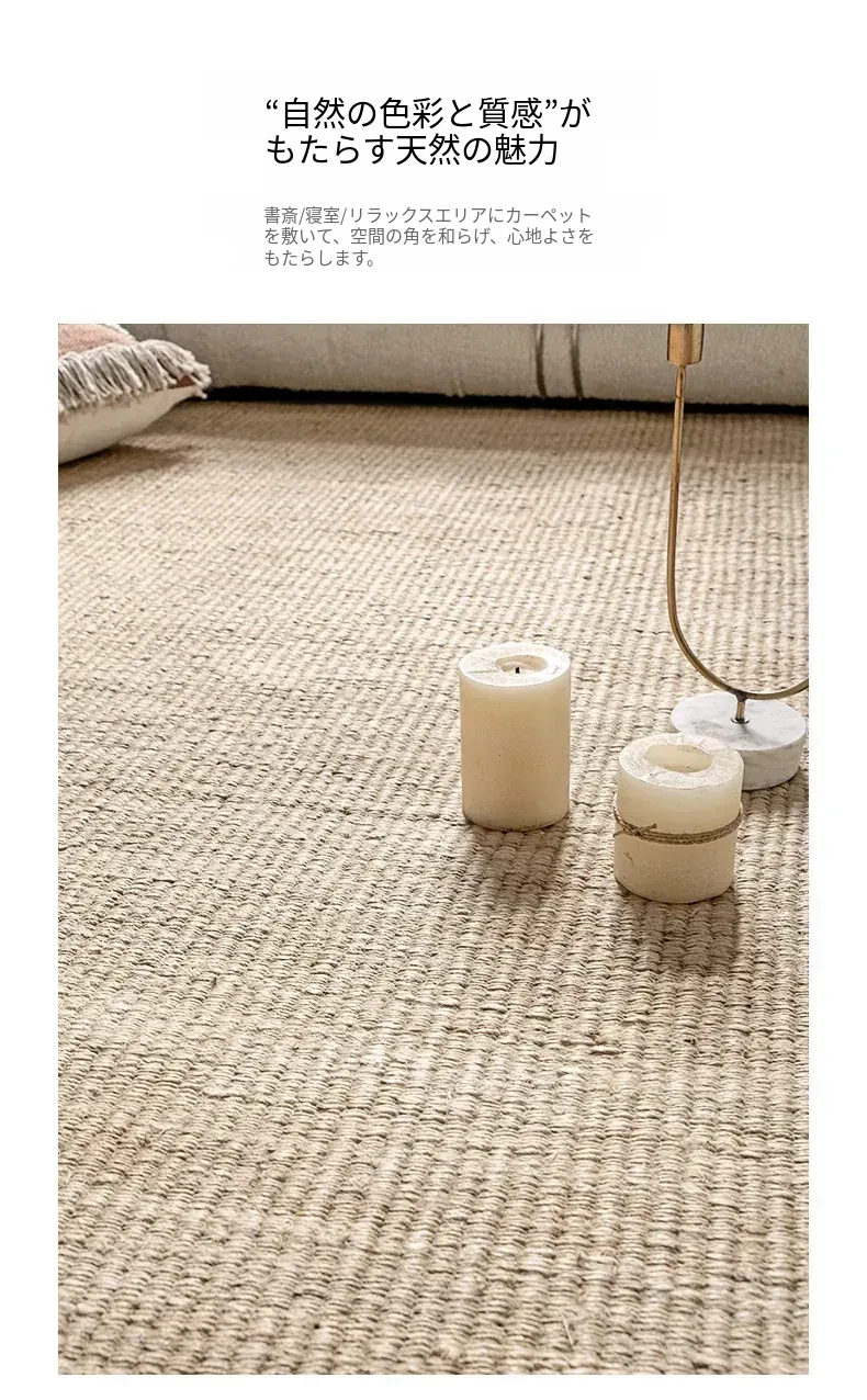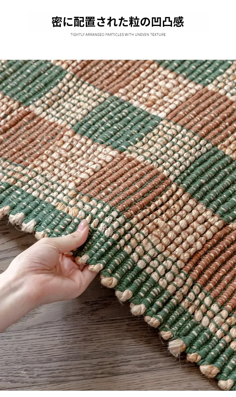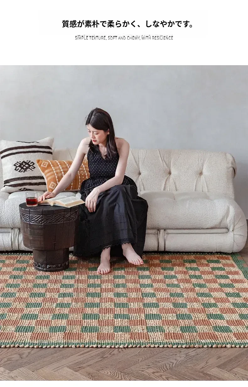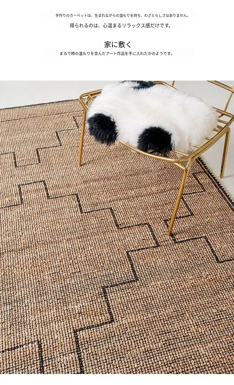 視覚と味覚のハーモニーを楽しむ!無接着剤の輸入ジュートカーペット、手編みの和風デザインで、リビングのテーブルを引き立てるイタリアンエレガンス。天然素材の温もりを感じて、上質な空間を演出します。