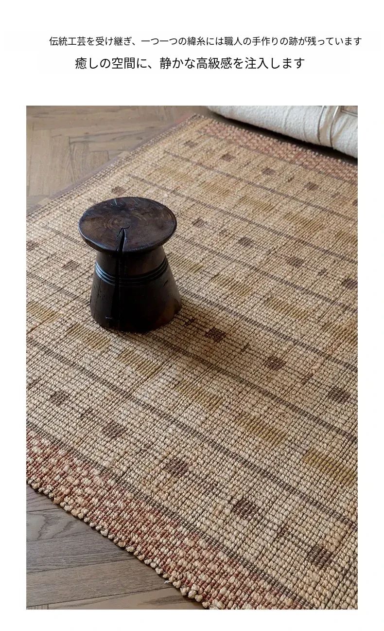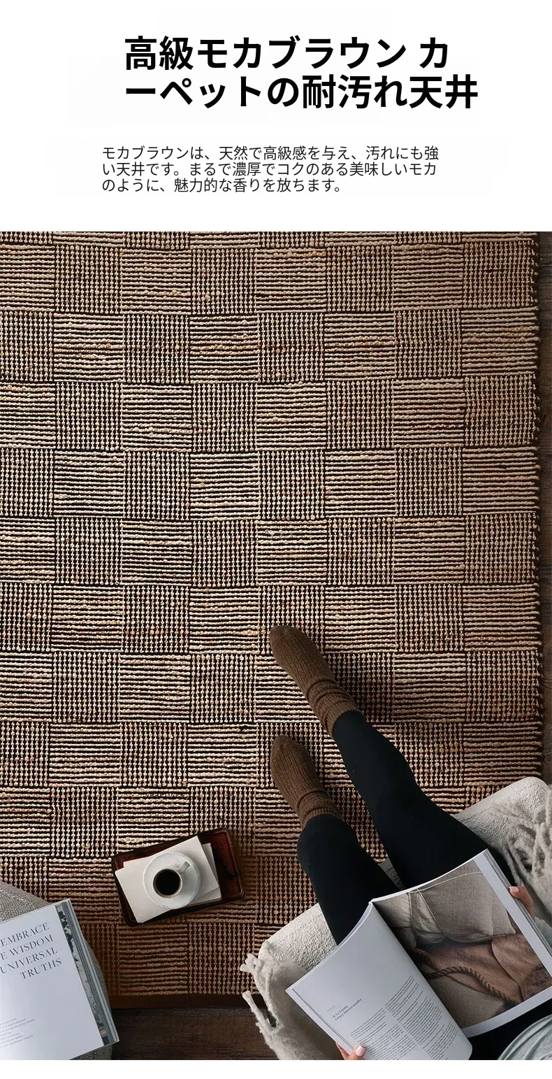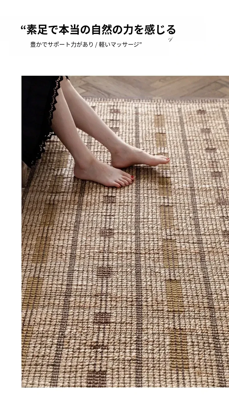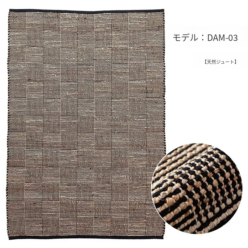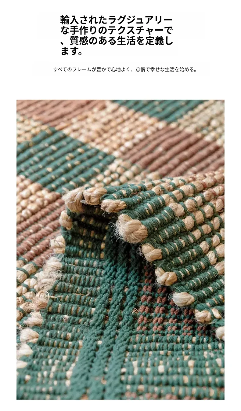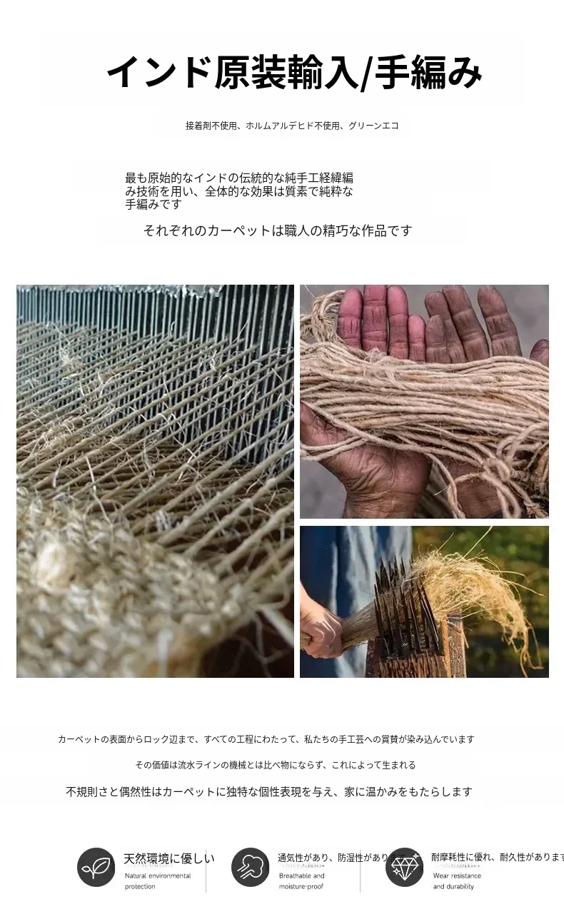 視覚と味覚のハーモニーを楽しむ!無接着剤の輸入ジュートカーペット、手編みの和風デザインで、リビングのテーブルを引き立てるイタリアンエレガンス。天然素材の温もりを感じて、上質な空間を演出します。